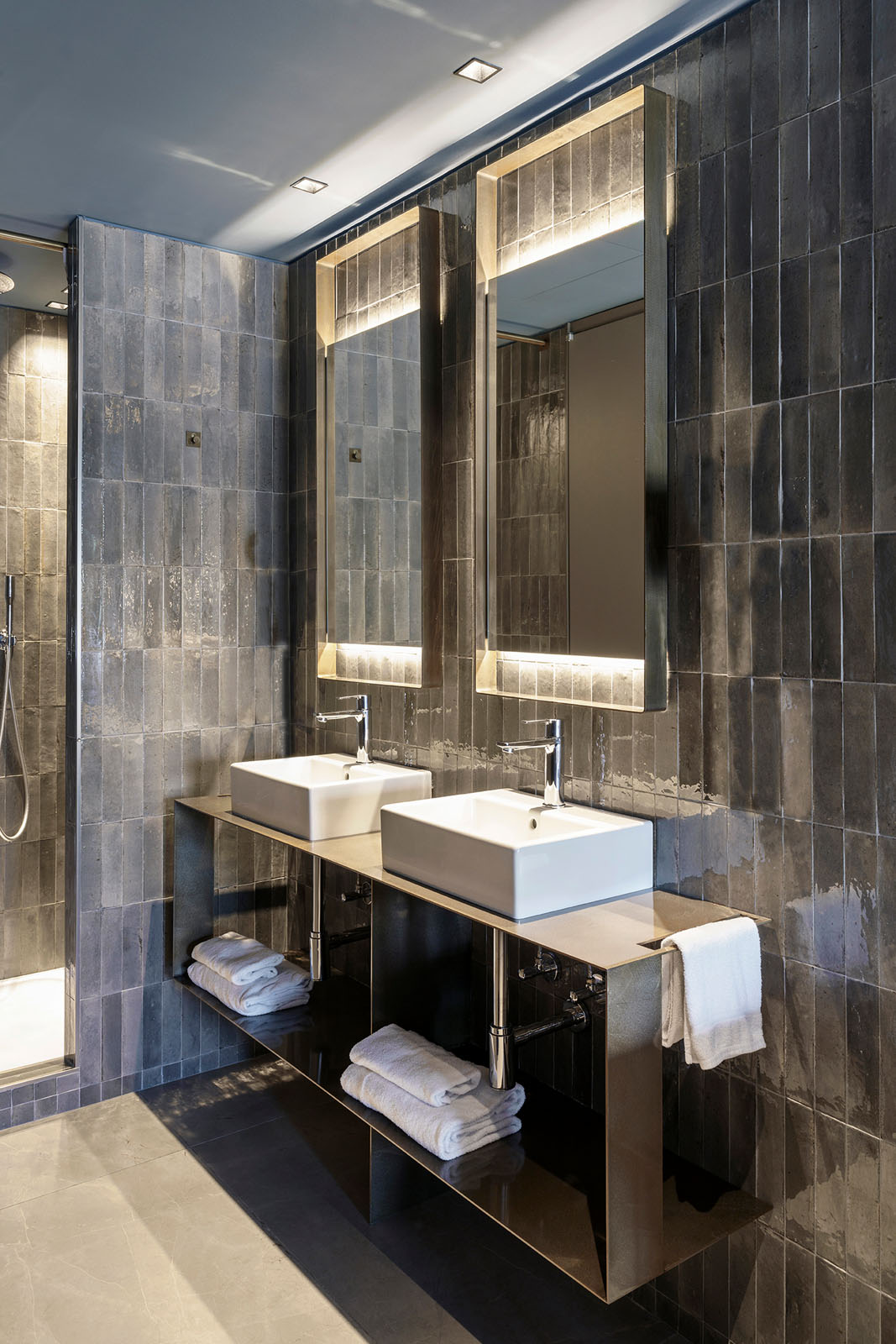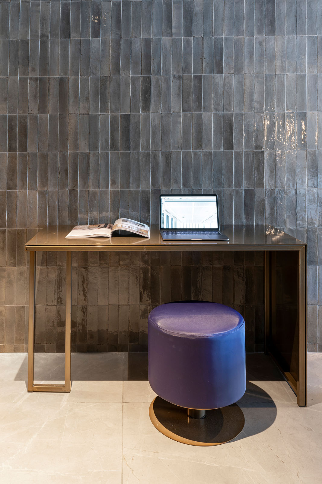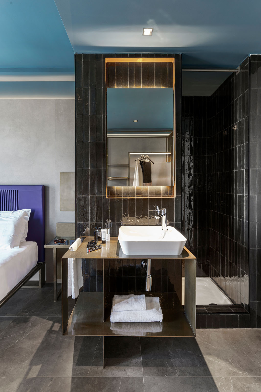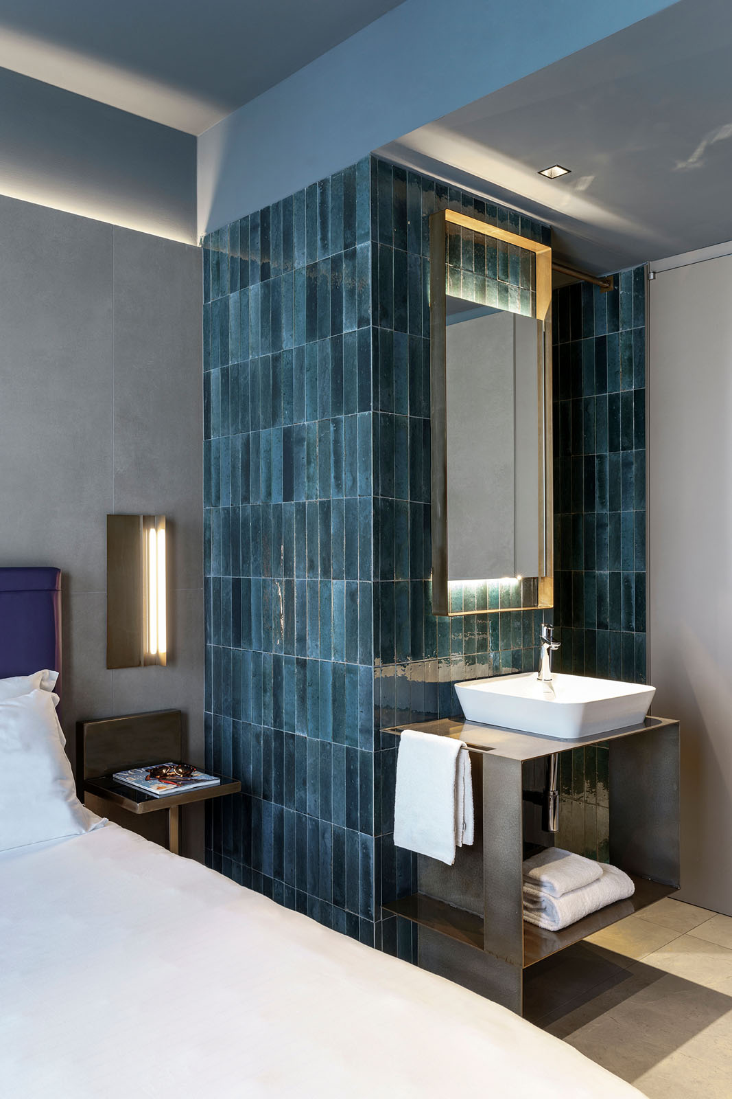 Colecția de cărămizi mici din gresie porțelanată Crogiolo Lume, cu format 6x24 cm și suprafață foarte lucioasa și neregulată, a fost aleasă pentru placarea băilor și porțiuni mari din pereții camerelor, creând jocuri de lumină potențate și de paleta de culori aleasă: Black, Blue și Greige. Nuanțele Lume se potrivesc perfect cu detaliile în nuanțe de bej și bronz din încăperi și cu colecțiile de gresie cu aspect de ciment – Grande Concrete Look – în nuanța Mud, și cu aspect de marmură – Evolutionmarble – în esența elegantă Tafu, folosită respectiv pentru placările și pardoselile din camere. De asemenea, esența Marble Look în nuanțe calde de bej a fost aleasă pentru a conferi un farmec aparte intrării hotelului.