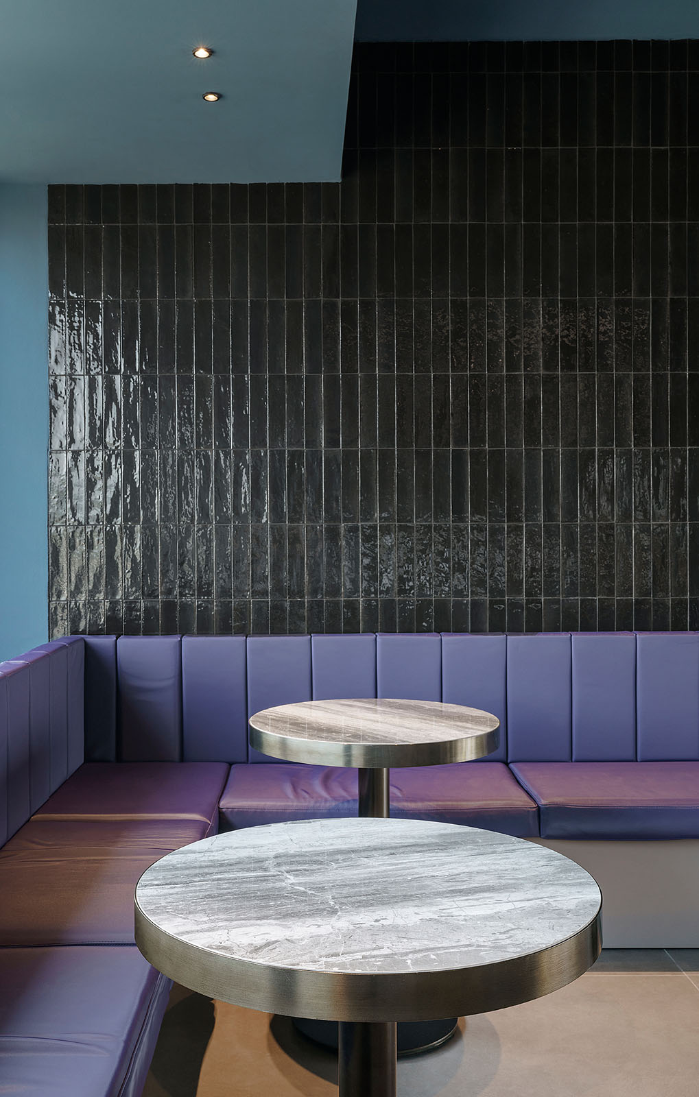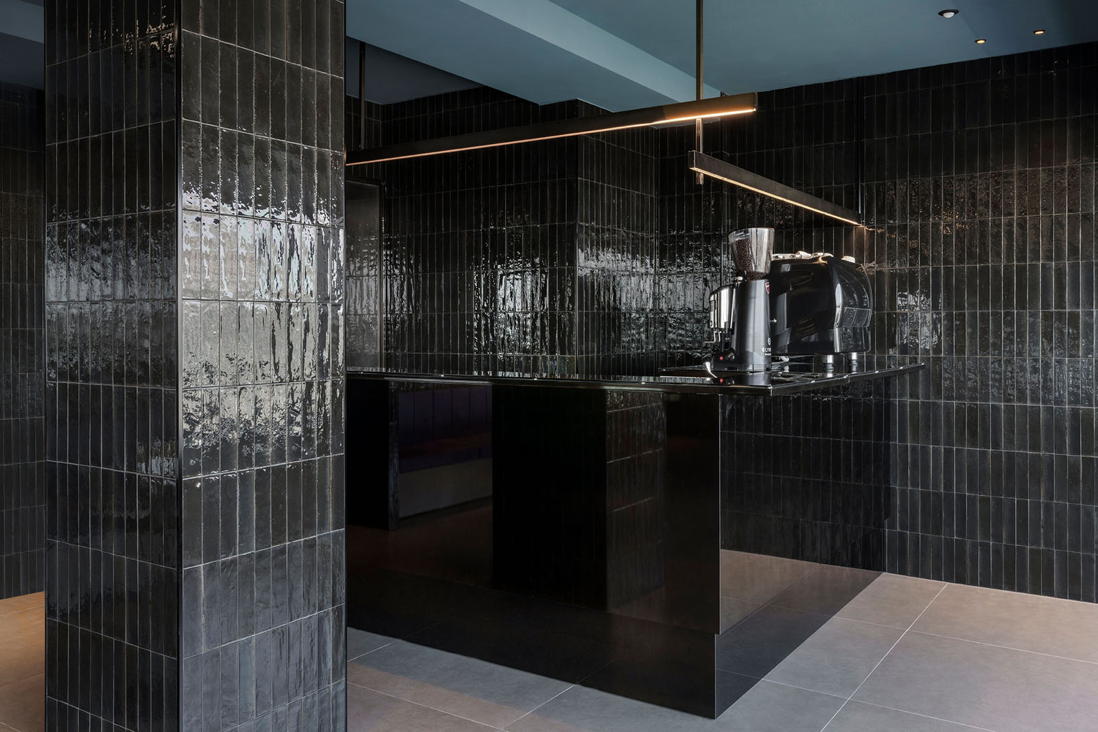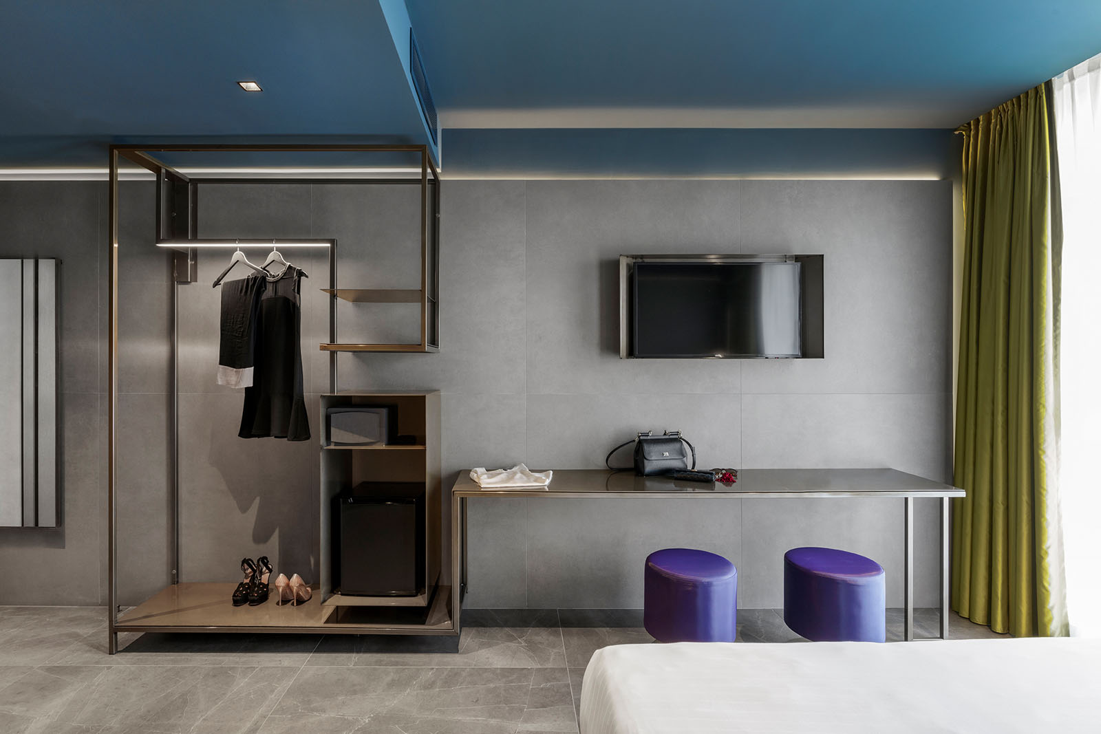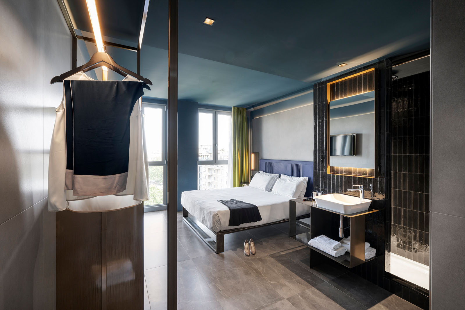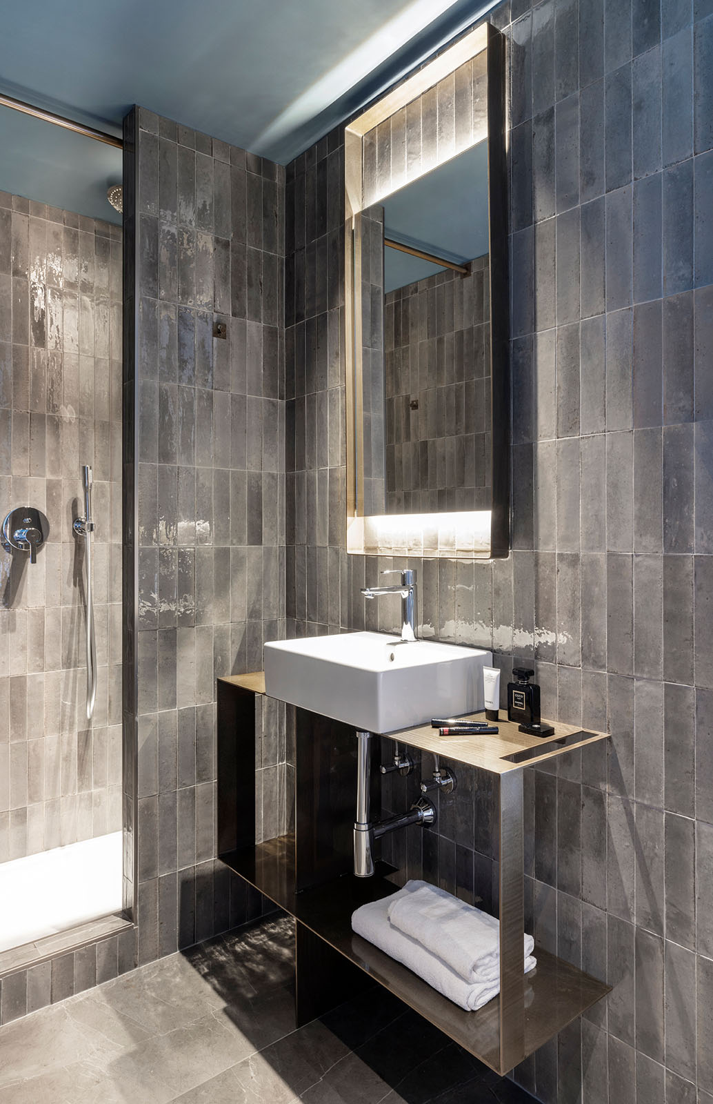 Colecția de cărămizi mici din gresie porțelanată Crogiolo Lume, cu format 6x24 cm și suprafață foarte lucioasa și neregulată, a fost aleasă pentru placarea băilor și porțiuni mari din pereții camerelor, creând jocuri de lumină potențate și de paleta de culori aleasă: Black, Blue și Greige. Nuanțele Lume se potrivesc perfect cu detaliile în nuanțe de bej și bronz din încăperi și cu colecțiile de gresie cu aspect de ciment – Grande Concrete Look – în nuanța Mud, și cu aspect de marmură – Evolutionmarble – în esența elegantă Tafu, folosită respectiv pentru placările și pardoselile din camere. De asemenea, esența Marble Look în nuanțe calde de bej a fost aleasă pentru a conferi un farmec aparte intrării hotelului.