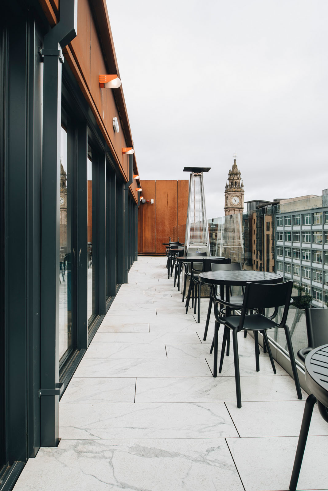 Gresia Marazzi a fost, de asemenea, aleasă pentru rooftop-ul hotelului. Allmarble20, gresia porțelanată de mare grosime cu aspect de marmură, concepută special pentru spațiile exterioare, inclusiv cele publice, a fost folosită pentru placarea Babel,, barul de pe rooftop-ul cel mai spațios din Irlanda, care beneficiază de o terasă panoramică mare, de pe care se pot vedea acoperișurile Belfastului.