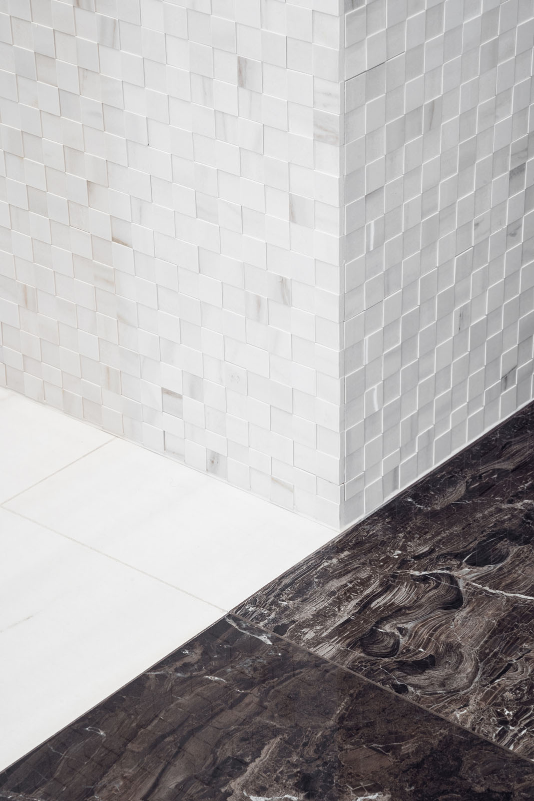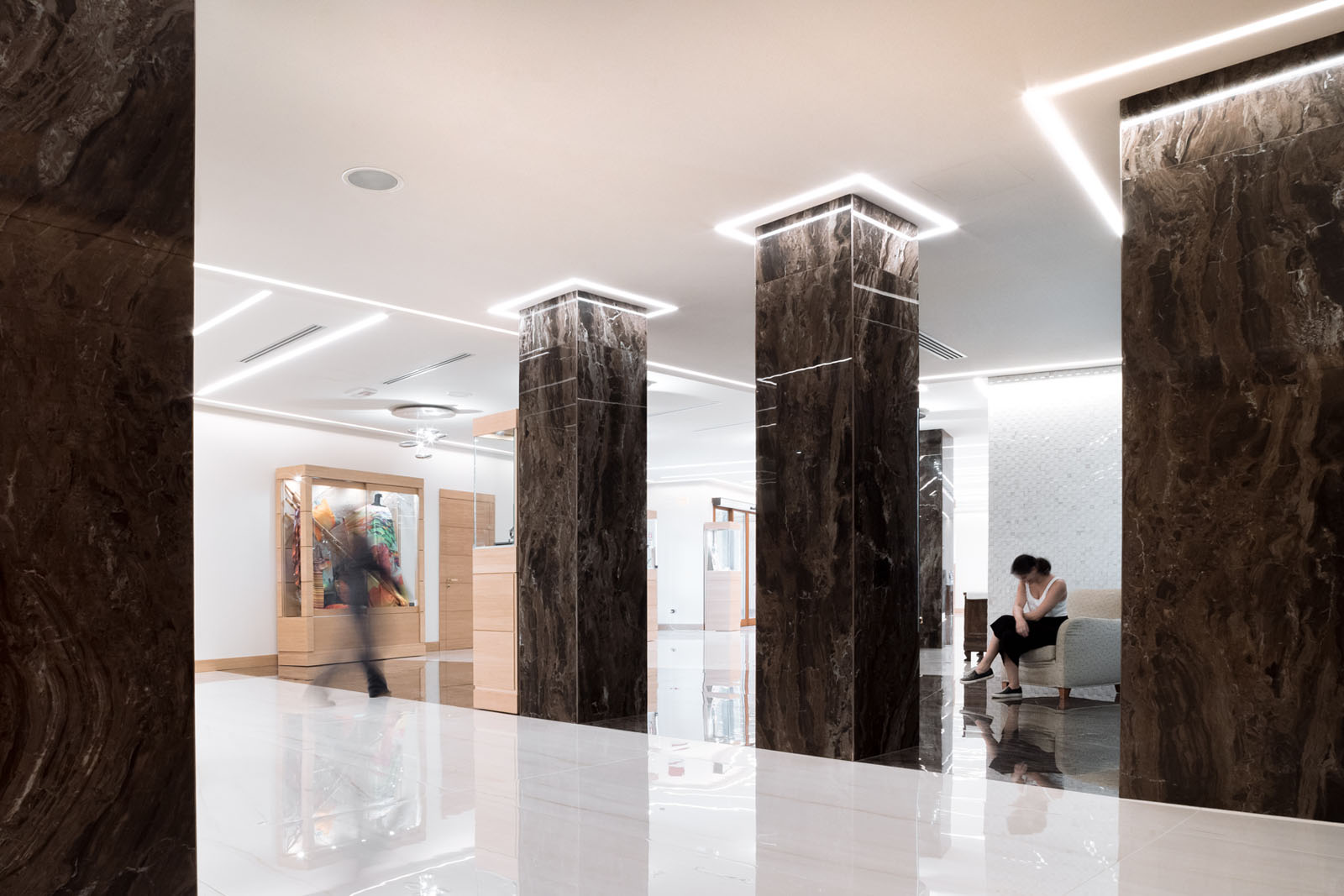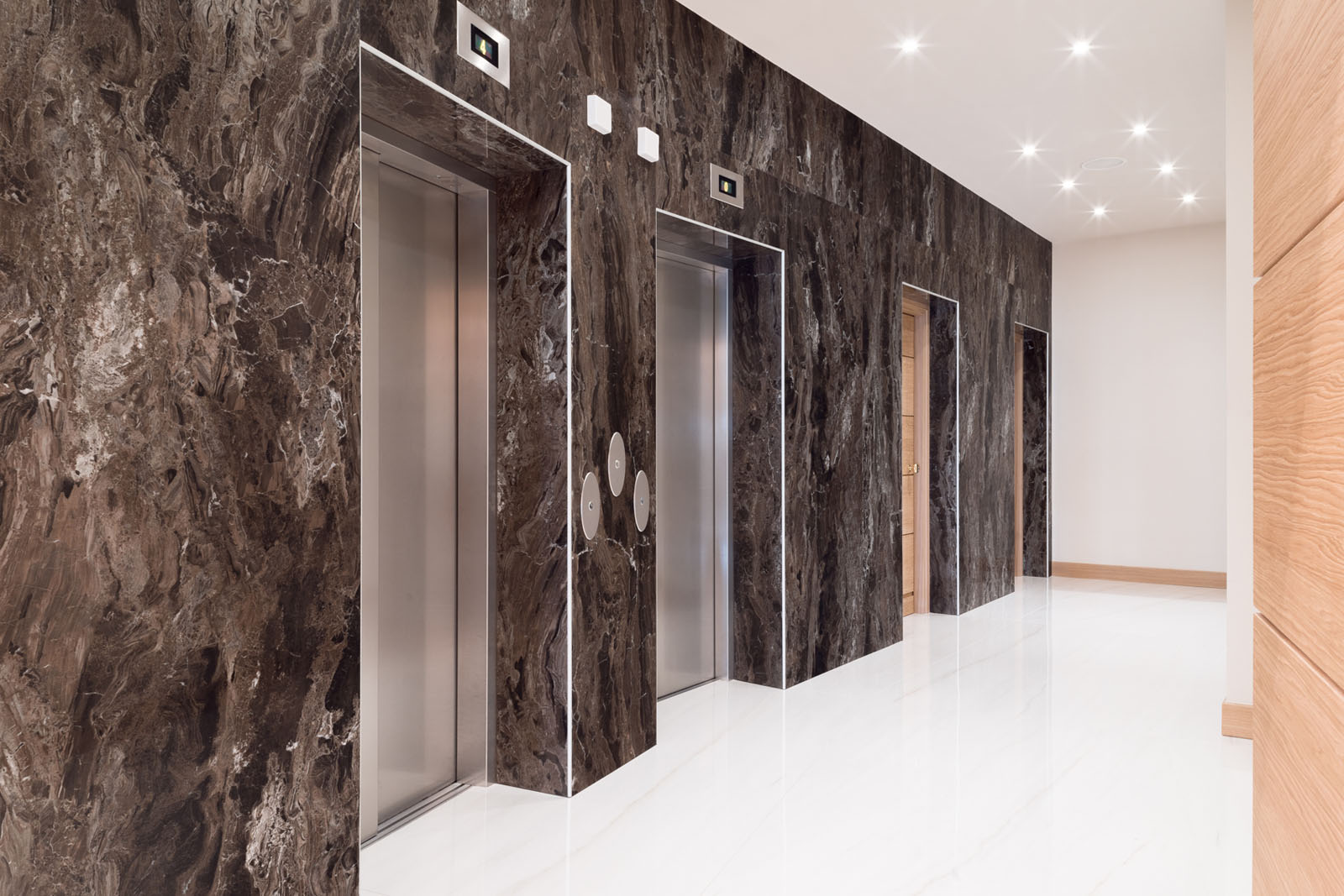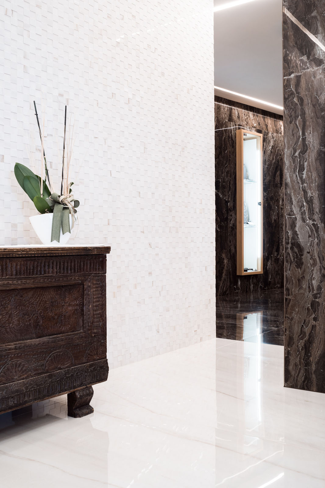 Pentru a renova prestigiosul hotel de 5 stele a fost aleasă gresia porțelanată cu aspect de marmură Allmarble și Grande Marble Look, colecția de plăci de 6 și 12 mm grosime, ideală pentru a proiecta fără întreruperi de continuitate. Grande Marble Look, aleasă în formatele 120x120 și 120x240 cm și în finisajele lucioase Frappuccino și Lasa, acoperă pardoseala, coloanele și recepția din hol, dând spațiului un gust rafinat și elegant care se găsește și în băi, și acestea proiectate cu Grande. Mozaicul tridimensional Allmarble Lasa a fost selectat pentru a decora peretele recepției și a holului, creând un interesant contrast între cele două finisaje diferite. Lasa și Frappuccino.