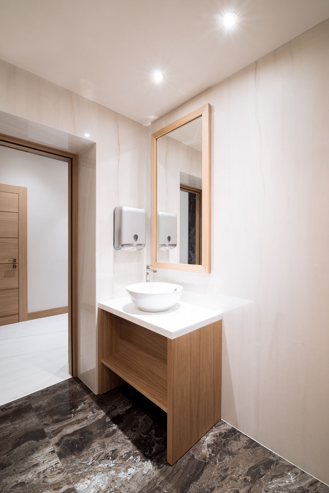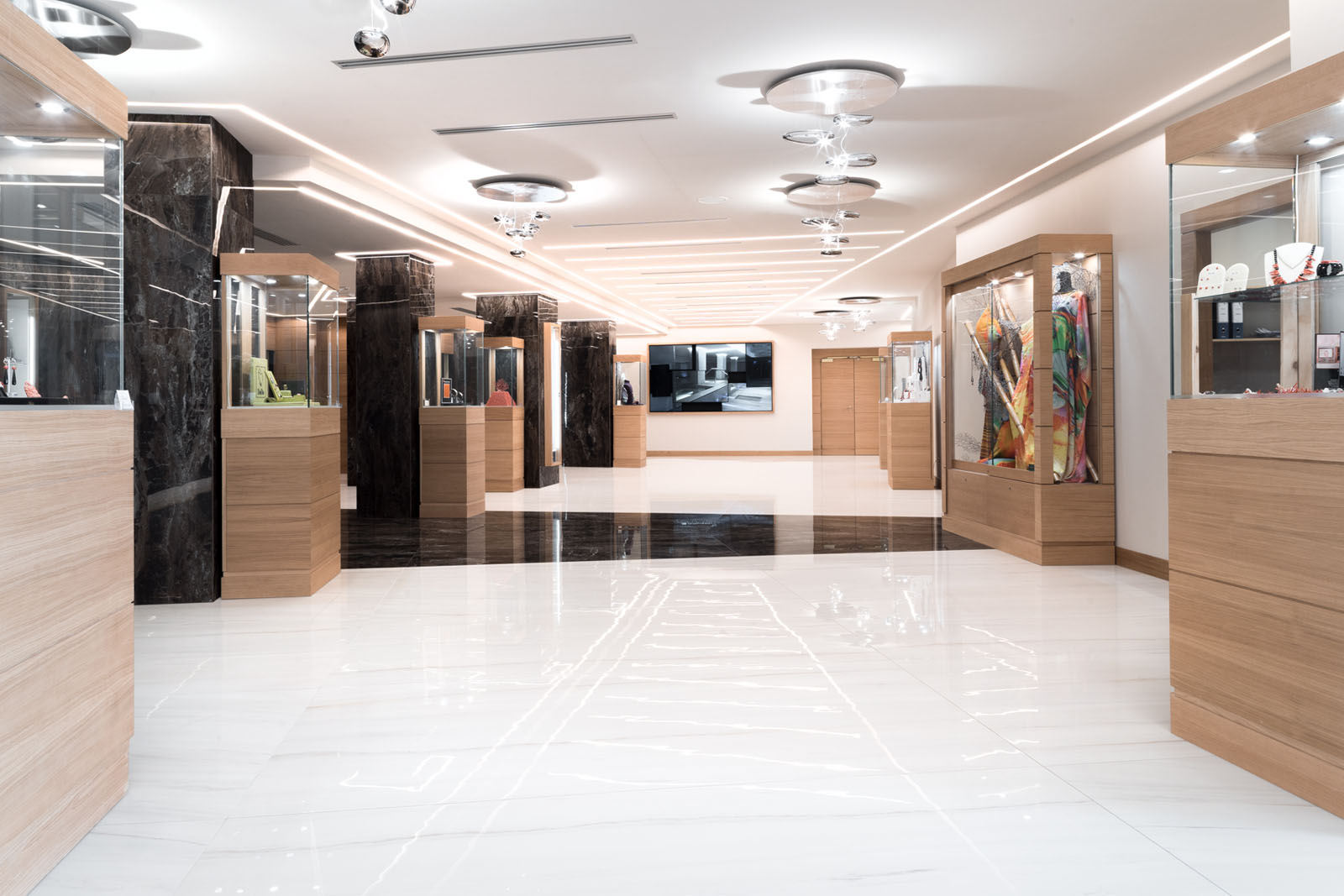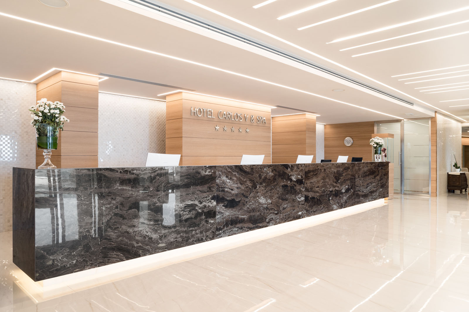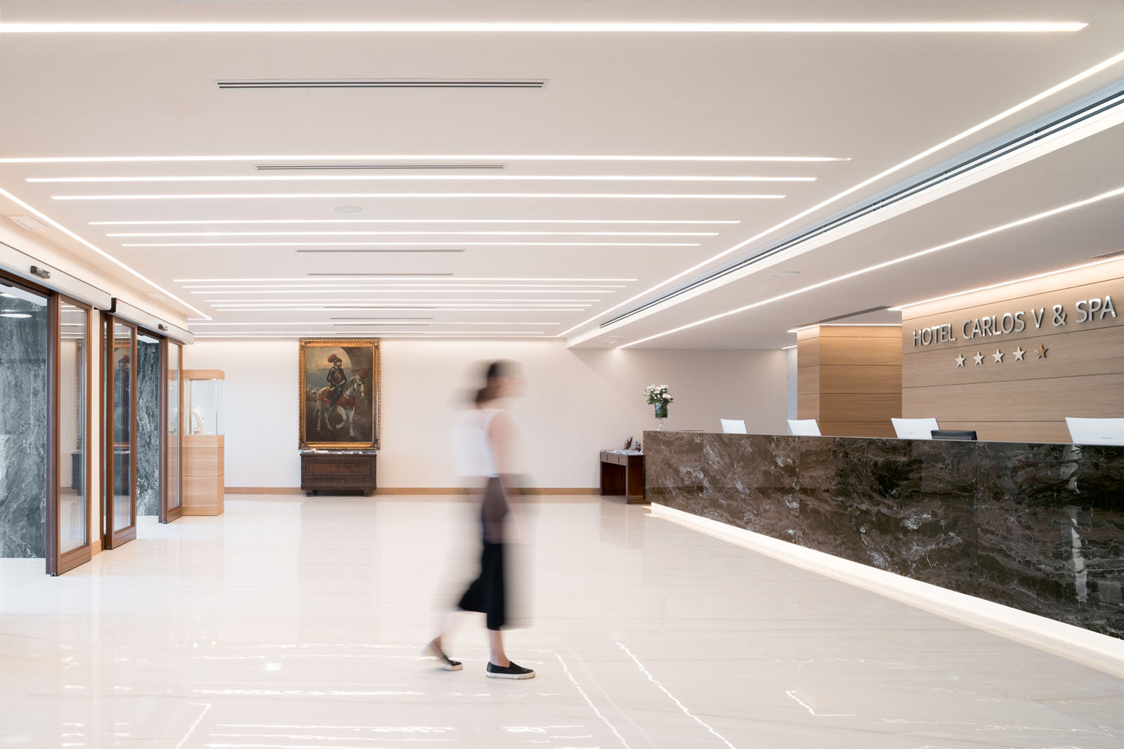 Pentru a renova prestigiosul hotel de 5 stele a fost aleasă gresia porțelanată cu aspect de marmură Allmarble și Grande Marble Look, colecția de plăci de 6 și 12 mm grosime, ideală pentru a proiecta fără întreruperi de continuitate. Grande Marble Look, aleasă în formatele 120x120 și 120x240 cm și în finisajele lucioase Frappuccino și Lasa, acoperă pardoseala, coloanele și recepția din hol, dând spațiului un gust rafinat și elegant care se găsește și în băi, și acestea proiectate cu Grande. Mozaicul tridimensional Allmarble Lasa a fost selectat pentru a decora peretele recepției și a holului, creând un interesant contrast între cele două finisaje diferite. Lasa și Frappuccino.