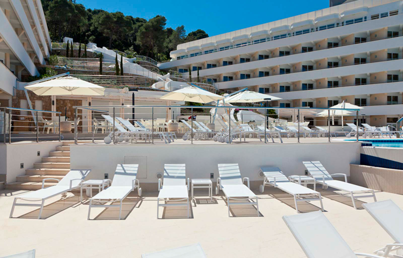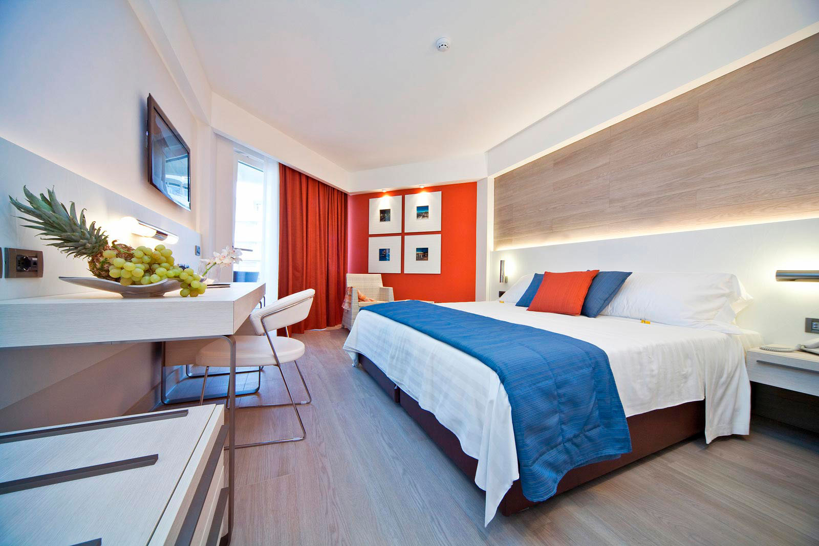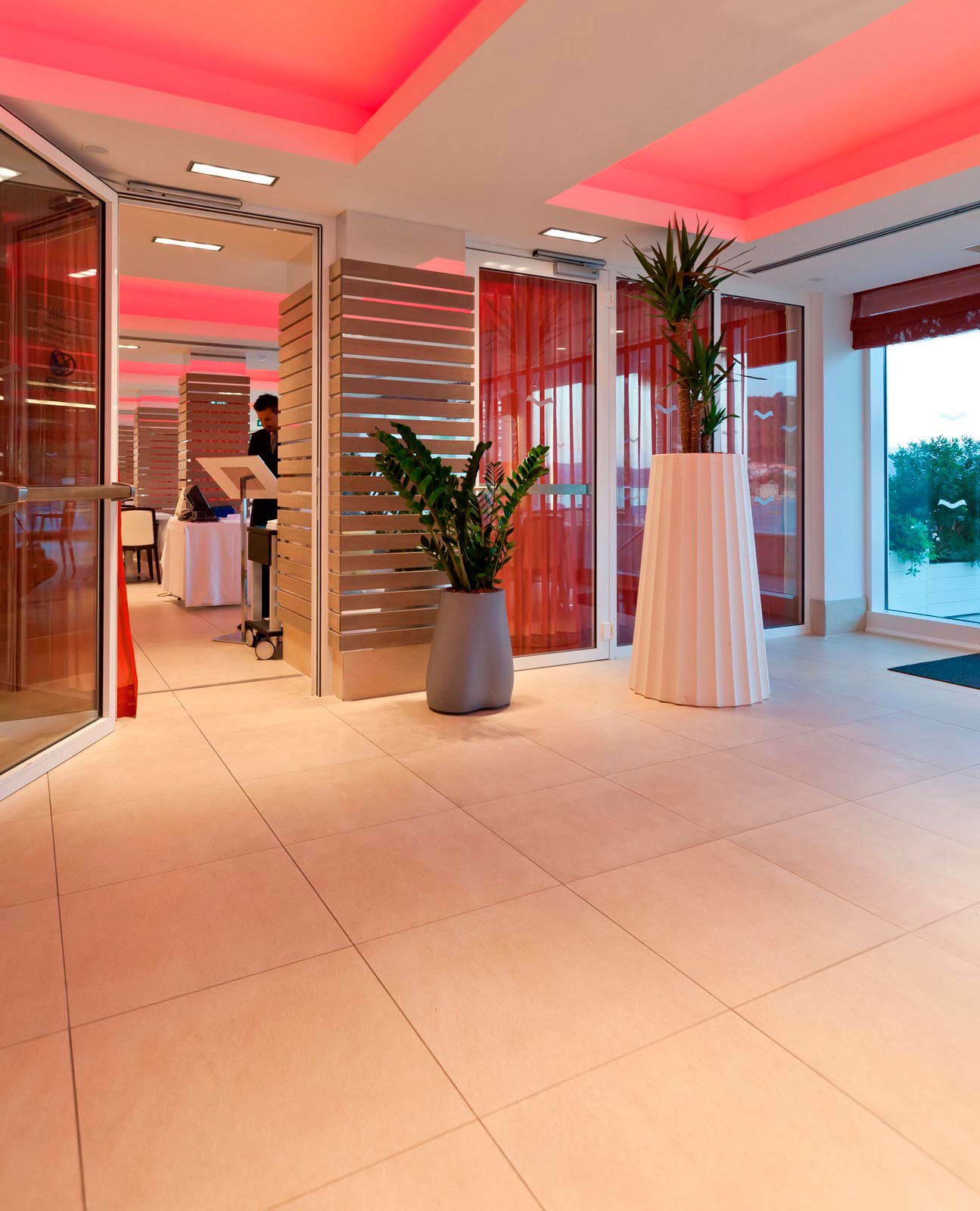 În cele 182 de camere, utilizarea pardoselii Treverk capuccino în mix al formatelor 10x120, 15x120 și 20x120 cm cu montare aleatorie s-a dovedit a fi alegerea câștigătoare; materialul asigură o gestionare a camerelor simplă și eficientă. În timp ce în băile rezervate camerelor a fost montată gresia Materie în format 60x60 cm în culorile portocaliu și albastru-azur. Plăcile de gresie Monolith de culoare albă, au fost alese pentru spațiile exterioare. Materialul de culoare deschisă se integrează în contextul insulei. Placarea marginii piscinei este realizată în benzi de gresie cristalizată SistemA albă și albastră, tăiată cu jet de apă. În băile publice în serviciul piscinei au fost utilizate ceramicele colecției Monolith și vanity.