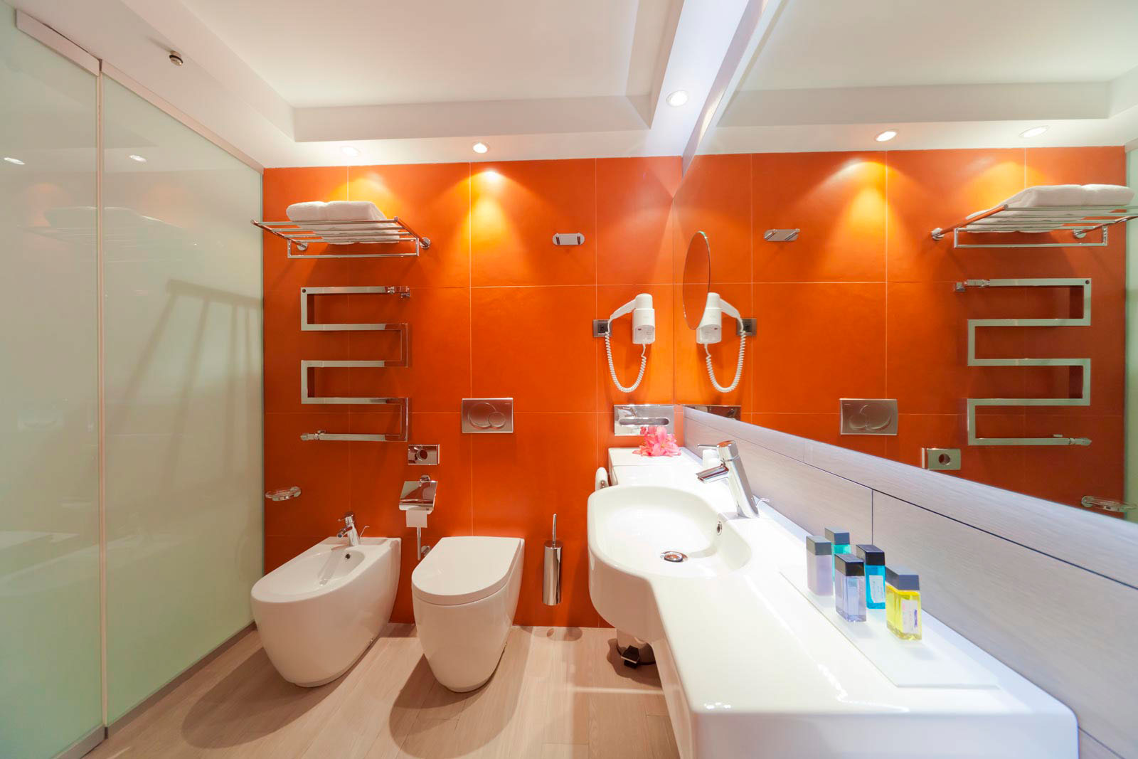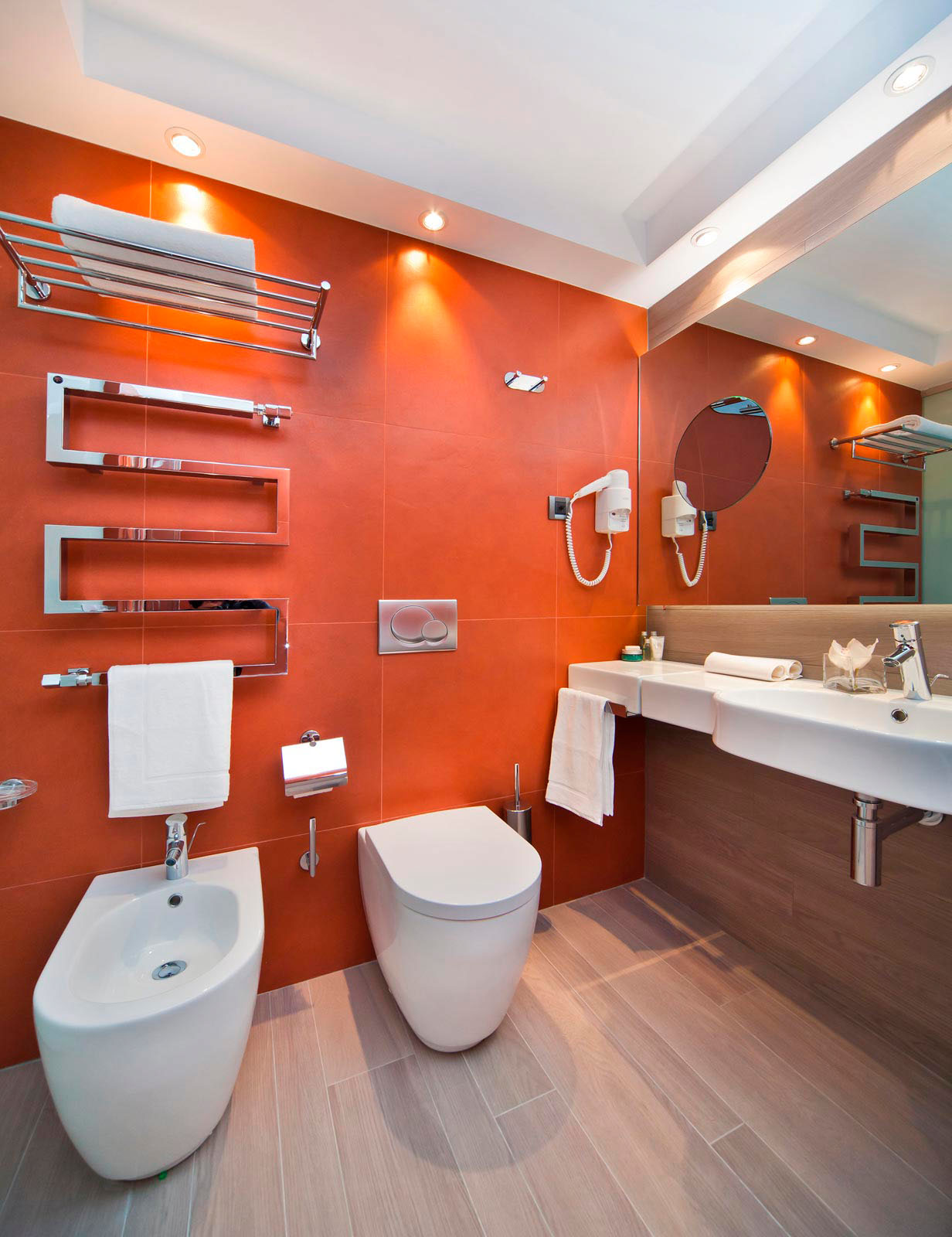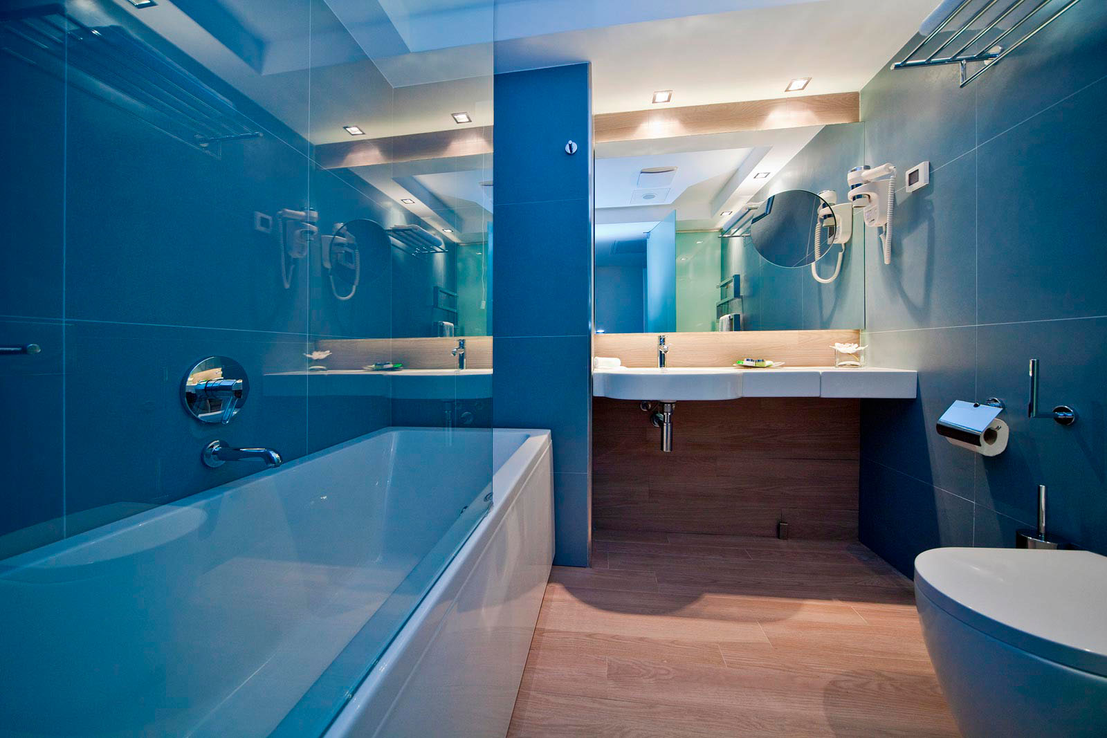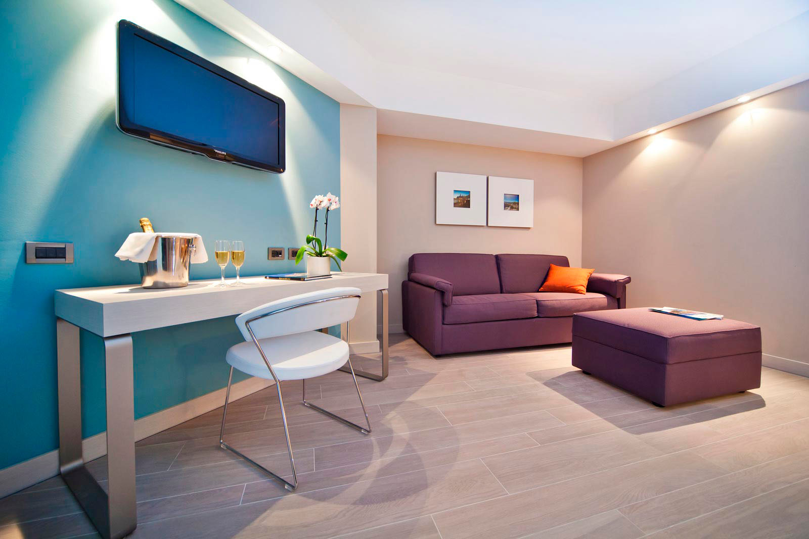 În cele 182 de camere, utilizarea pardoselii Treverk capuccino în mix al formatelor 10x120, 15x120 și 20x120 cm cu montare aleatorie s-a dovedit a fi alegerea câștigătoare; materialul asigură o gestionare a camerelor simplă și eficientă. În timp ce în băile rezervate camerelor a fost montată gresia Materie în format 60x60 cm în culorile portocaliu și albastru-azur. Plăcile de gresie Monolith de culoare albă, au fost alese pentru spațiile exterioare. Materialul de culoare deschisă se integrează în contextul insulei. Placarea marginii piscinei este realizată în benzi de gresie cristalizată SistemA albă și albastră, tăiată cu jet de apă. În băile publice în serviciul piscinei au fost utilizate ceramicele colecției Monolith și vanity.