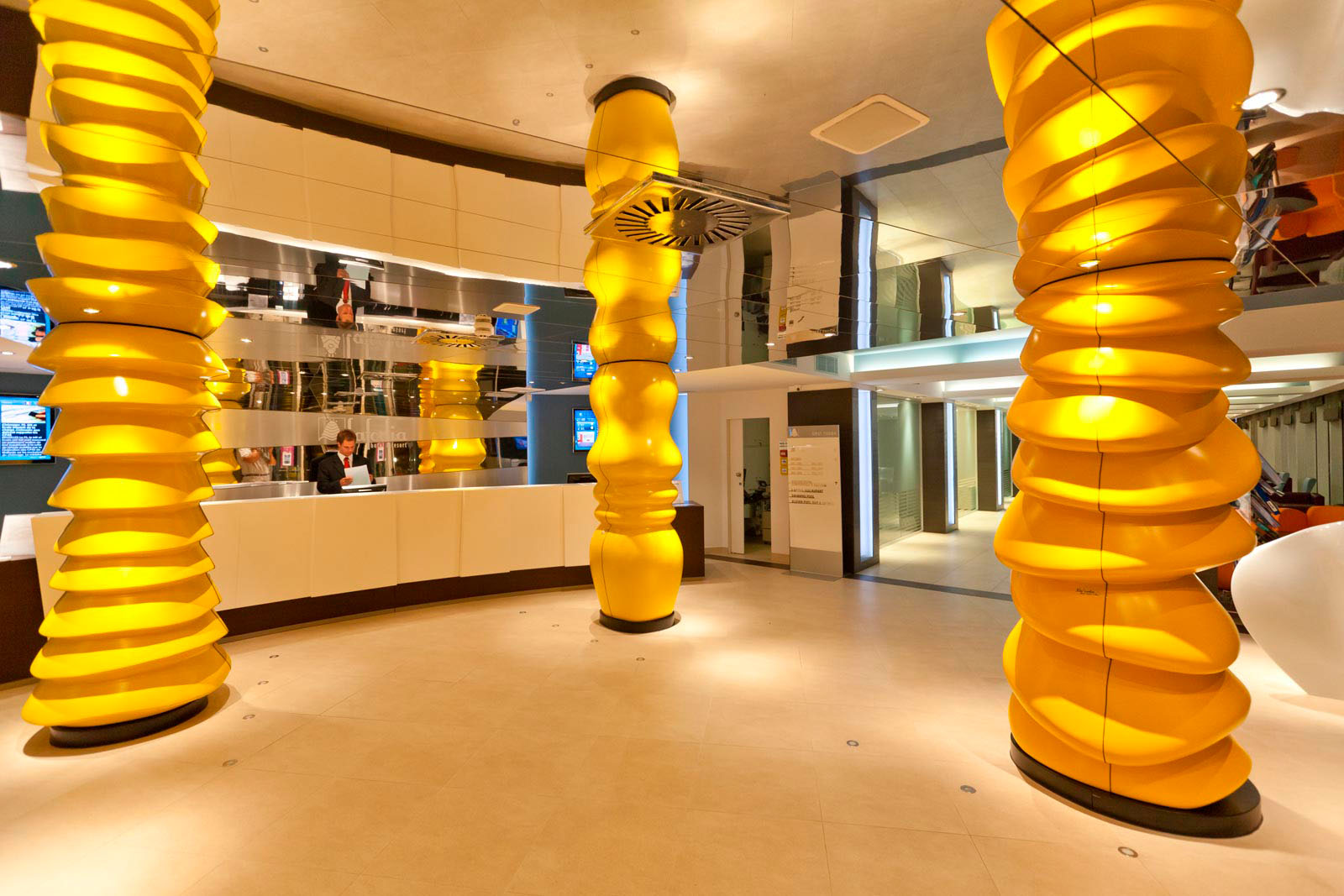 Materialele utilizate Soho a fost utilizat pentru pardoselile spațiilor comune, peste 2500 de mp de plăci de gresie în formatul 60x60 cm. SistemA 30x60 cm, în culorile alb, portocaliu, galben, roșu a fost montat în placările bucătăriei, împreună cu SistemC - Città 20x20 cm; tradiționalele plăci ale colecției SistemT - Graniti, a fost utilizată pentru localuri de serviciu și producție, cu suprafață naturală, șlefuită, fațetată și grosime mărită la 14 mm pentru zone de descărcare mărfuri. Pe scările publice au fost montate noile trepte mari din colecția Soho. Treptele mari sunt obținute prin curbarea plăcilor de gresie Soho. Peste 800 de trepte mari au fost realizate pentru această aplicație.