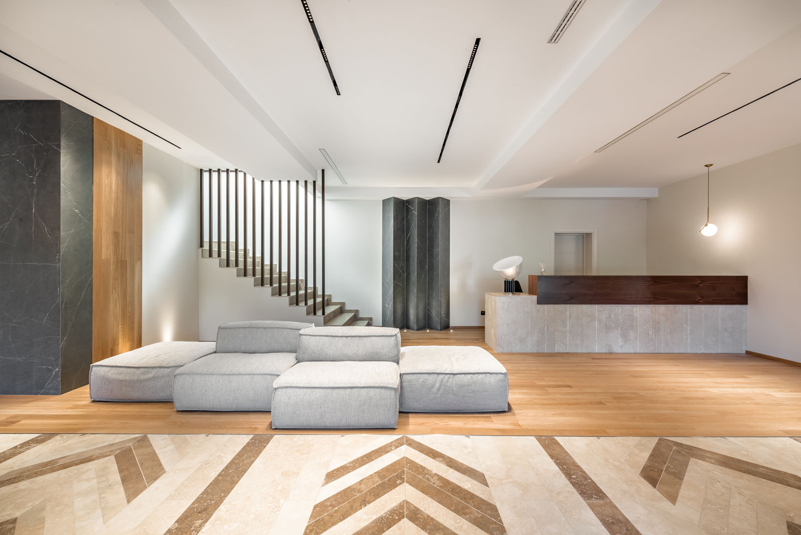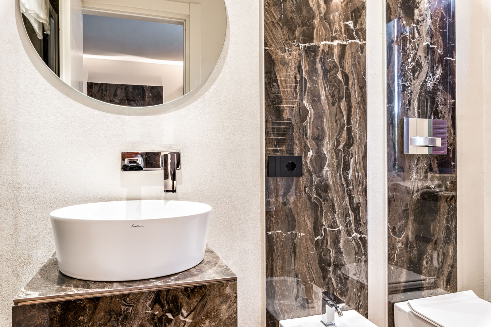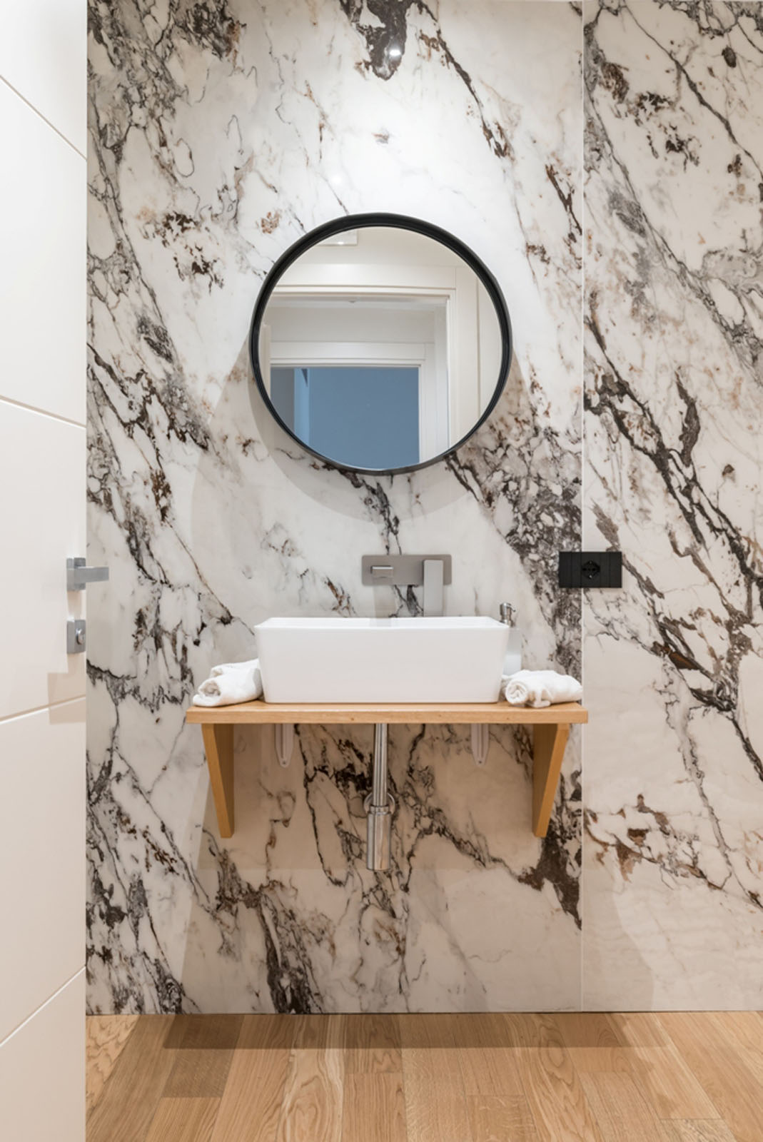 Restaurante, ospitalitate și timp liberÎn regiunea Versilia, la Forte dei Marmi, o bijuterie a Toscanei și o prestigioasă stațiune balneară, arhitectul Michele Vitaloni de la Charmitaliastudio, s-a ocupat de întregul proiect de reamenajare a Hotelului Miramonti, înconjurat de vegetație luxuriantă. Stilul și mobilierul contemporane marchează spațiile ample și luminoase, cu nuanțe naturale, care variază de la bej la gri. În cadrul băilor și în dormitoare, diferite între ele, situate la parter, la primul și la al doilea etaj, numit turnuleț, au fost utilizate plăcile din gresie porțelanată din colecția Grande Marble Look de la Marazzi în formatul mare de 120x120 cm și de 120x240 cm cu grosime de 6 mm în culorile Frappuccino, Golden White și Capraia. Datorită tehnologiei de reproducere digitală, care recreează fidel nervurile, culorile și nuanțele marmurei naturale, în combinație cu excelente calități în ceea ce privește ușurința, ductilitatea și rezistența, acest produs permite proiectului să creeze mai multe compoziții pe pardoseală, alternând cu lemnul natural, pe perete sub formă de tablouri sau alte inserții, și sub formă de blaturi pentru lavoare. În cadrul proiectului, foarte interesantă este decontextualizarea materialelor Marazzi din utilizarea obișnuită de placări pentru pereți, care a devenit mai atractivă prin intermediul jocului cu diferite forme.