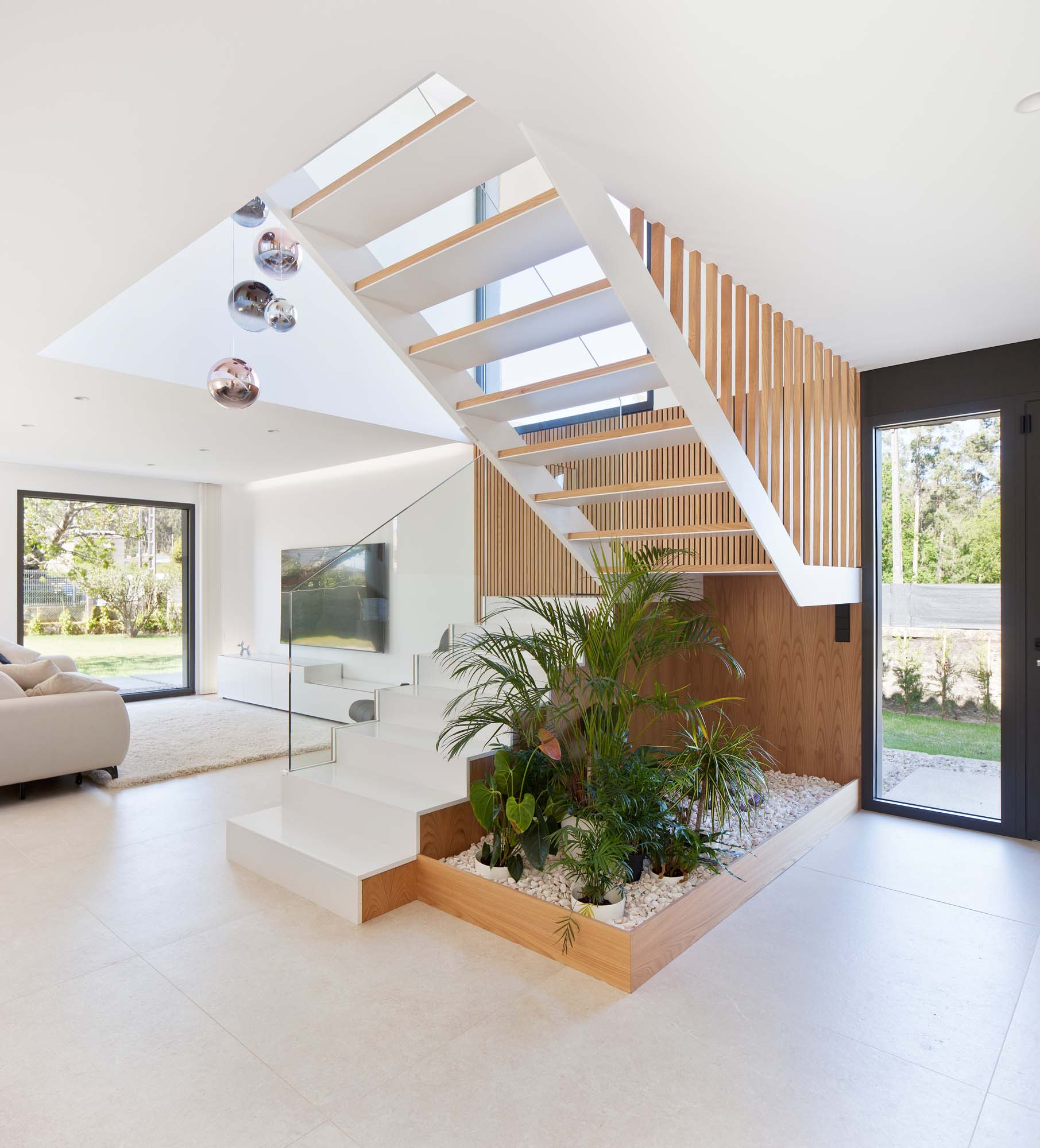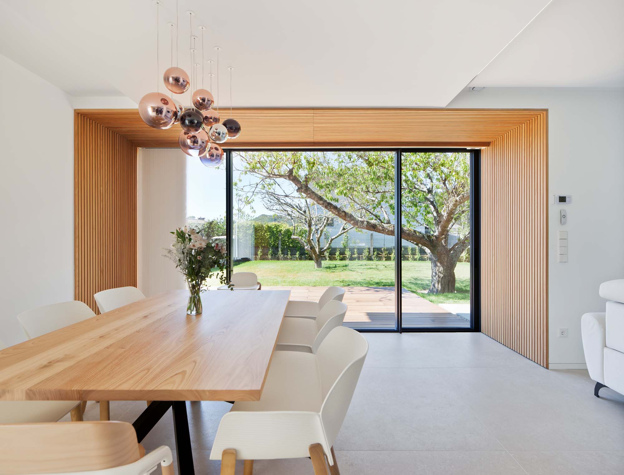 Noua casă de familie se învârte în jurul spațiilor comune publice, cu zona de zi principală care se deschide spre grădină, unde se află un mare cireș, ce devine protagonistul conexiunii dintre casă și exterior. Legăturile sunt formalizate prin lăcuirea unor șipci din lemn de castan, creând un „portal” care se extinde în pardoseala exterioară.