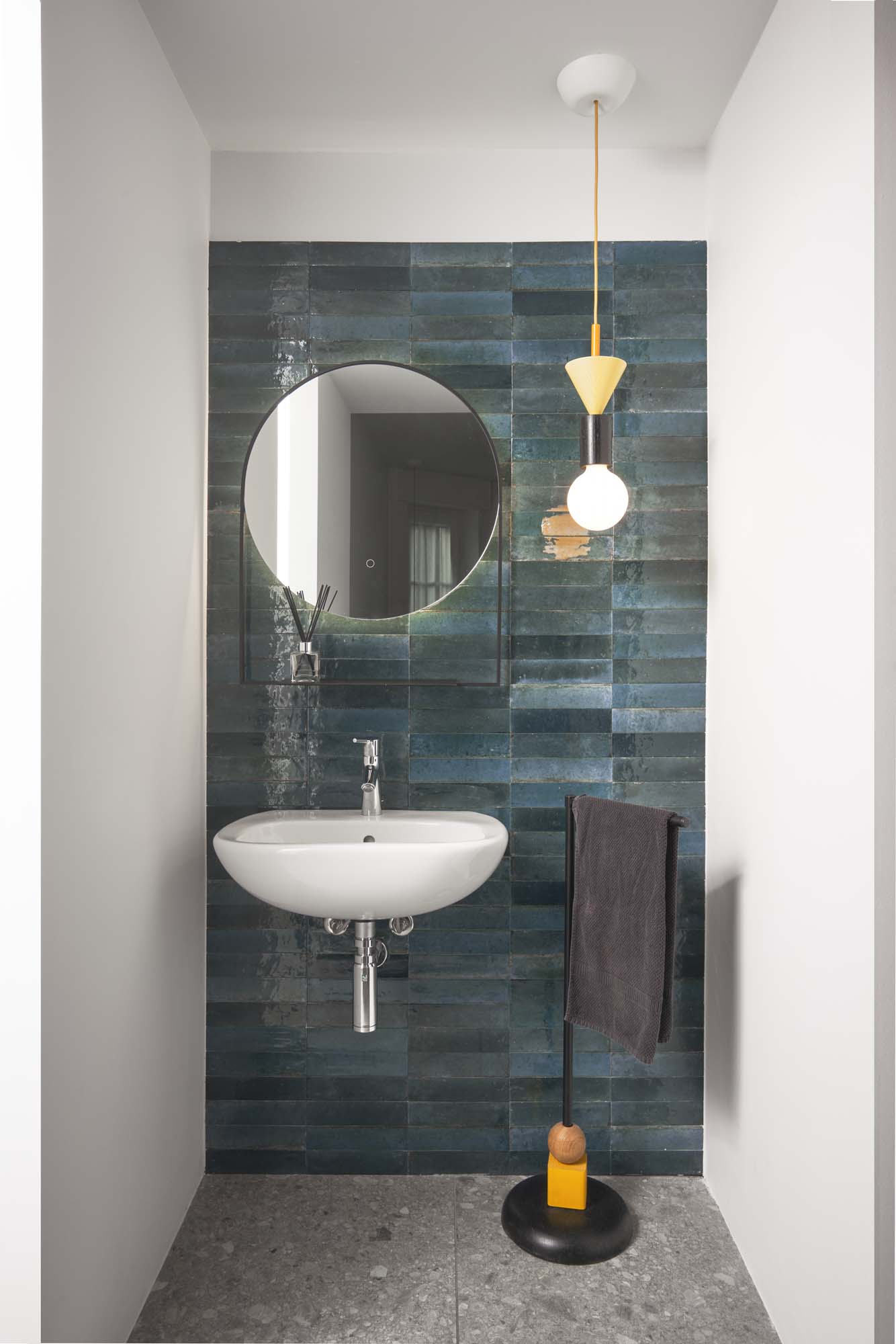 În baie, colecția în format mic Crogiolo Lume Blue adaugă un strop de culoare și personalitate. Aceste cărămizi mici albastre, cu finisajul lor lucios și vibrant, creează un contrast fascinant cu restul casei, transformând baia într-o oază de liniște și bunăstare.
