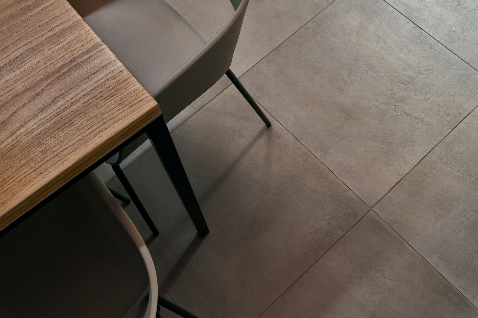 Colecția Powder de gresie cu aspect de ciment și gama de plăci maxi The Top cu grosime de 6 mm, folosite pentru local, îi conferă personalitate, suprafețele fiind, în egală măsură, performante și plăcute estetic.