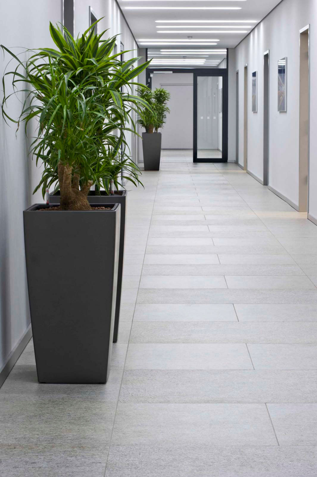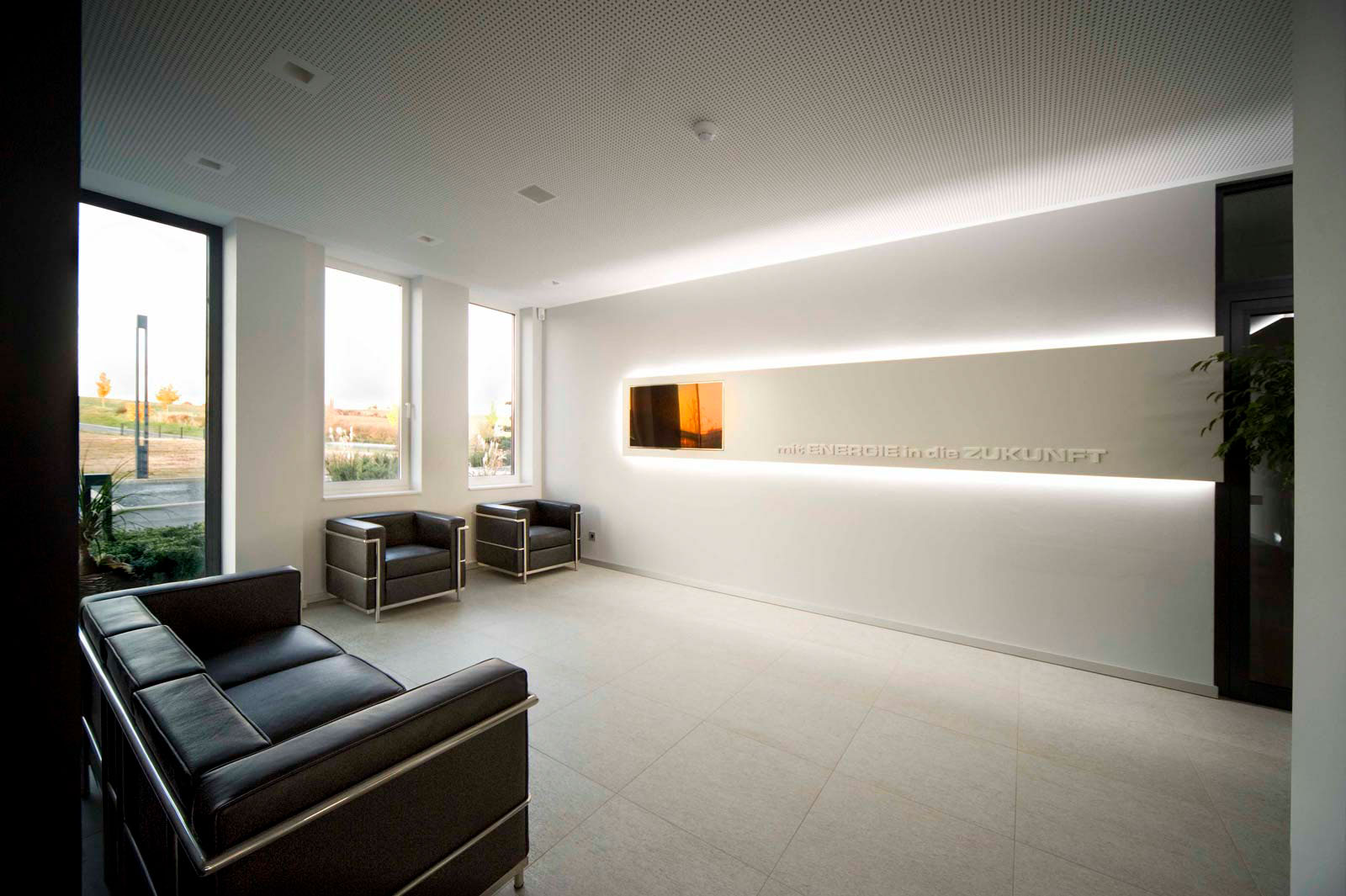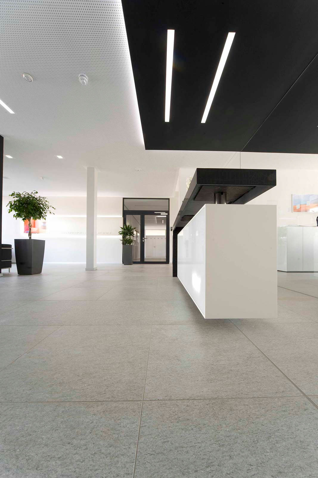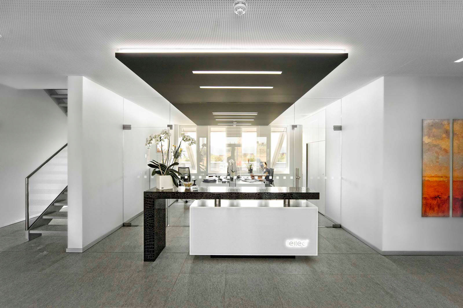 Structura care găzduiește germana Leitec, exprimă, printr-o arhitectură modernă, atenția și specializarea companiei pentru diferite sisteme energetice. Astfel, una dintre fațadele exterioare este realizată complet cu panouri fotovoltaice pentru producerea de energie. Stilul contemporan al construcției se oglindește în alegerile de mobilier și în divizarea spațiilor interioare unde linii surate, esențiale și elegante încadrează birourile și zona recepției. Pun în valoare spațiile alegerea pardoselii cu aspect de piatră Evolutionstone Luserna de la Marazzi 60x120 cm în suprafață structurată alternată cu două module de 60x60 cm suprafață naturală..