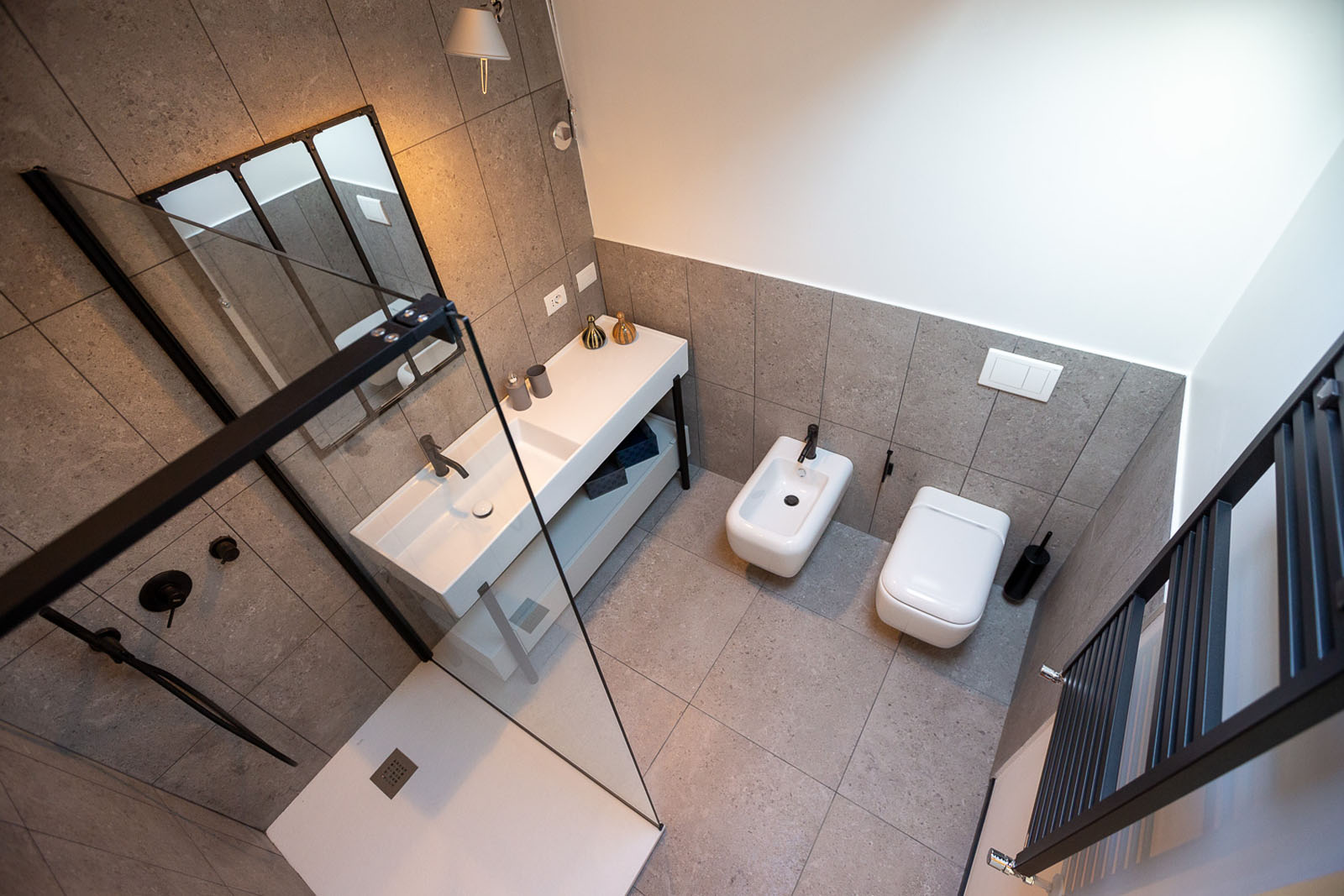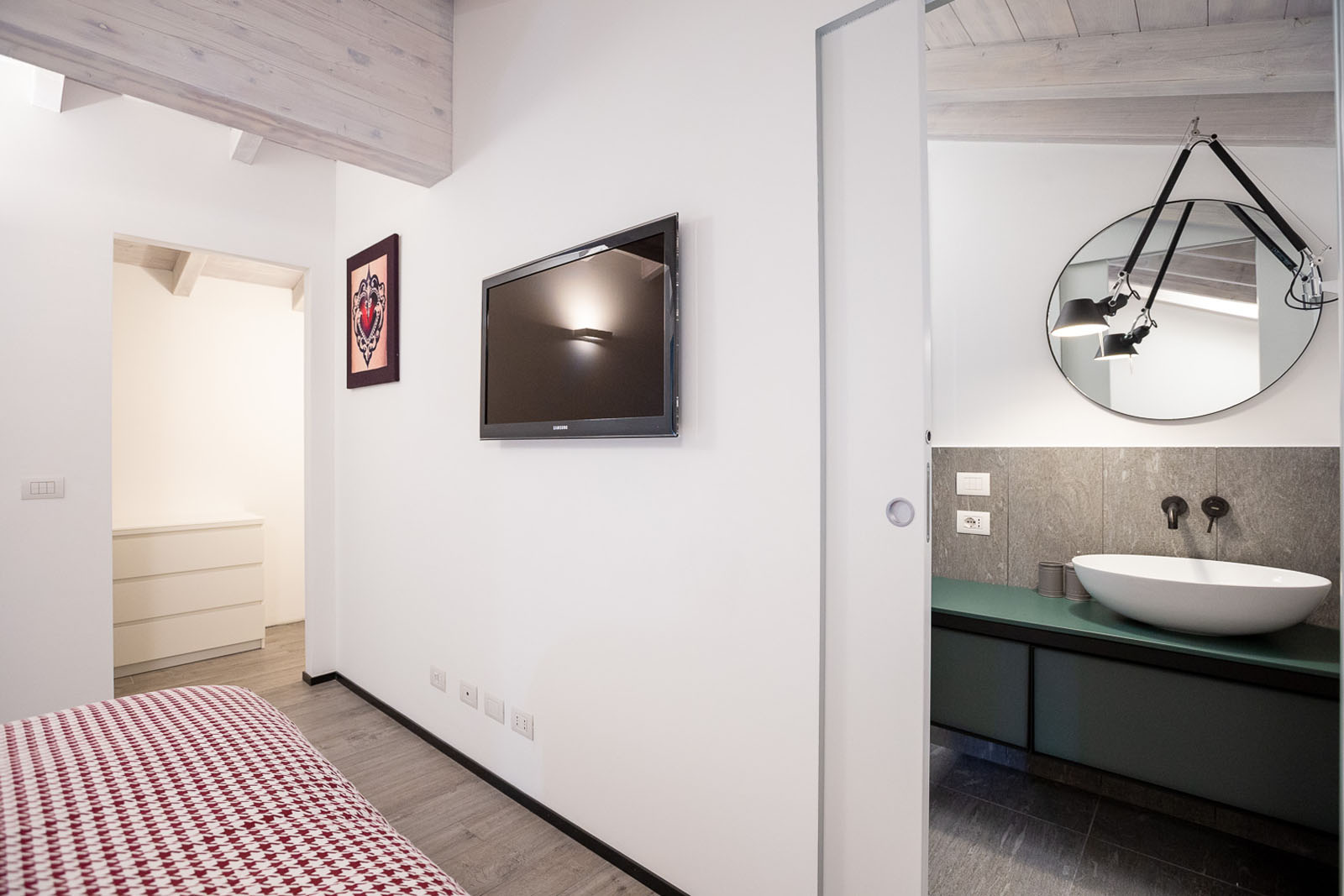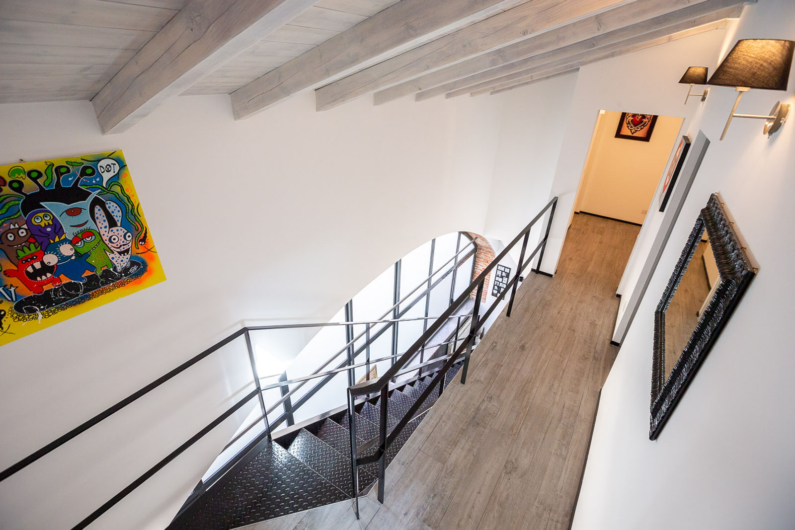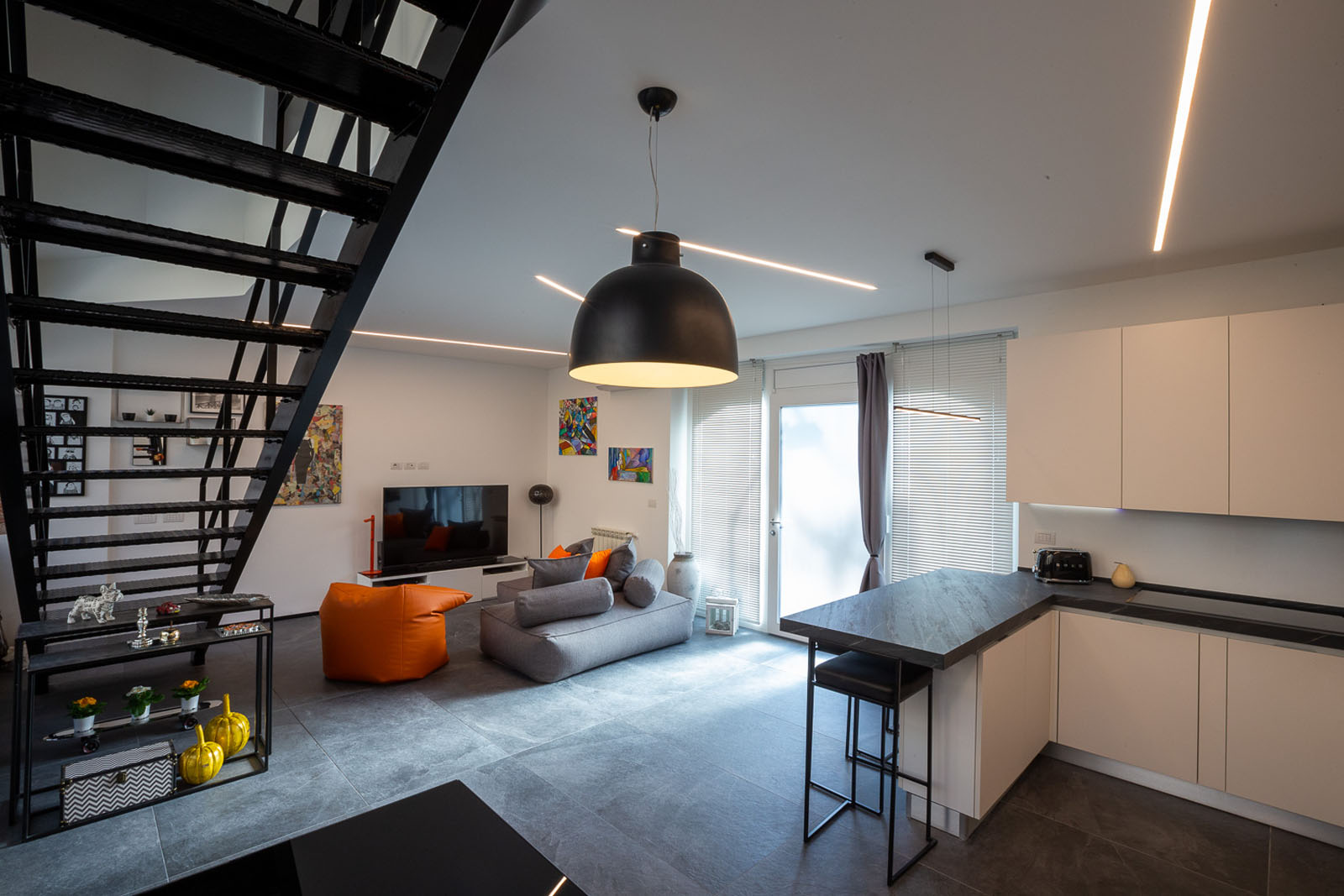 Un spațiu industrial transformat într-o reședință privată: un apartament la ultimul etaj al unei clădiri din Gaggiano, proiectat de arhitectul Giancarlo Clementi. Locuința a păstrat identitatea originală a clădirii, inclusiv spațiile generoase și ferestrele mari. Alternanța contrastelor de culoare și materiale este una dintre principalele trăsături pe care designerul și le-a dorit pentru renovarea mansardei, evidențiată și prin folosirea pe scară largă, pentru toate interioarele, a gresiei porțelanate cu aspect de piatră și lemn, integral de la Marazzi. La parter, în zona de living mare și elegantă, de tip open space, s-au ales pentru pardoseală și pentru un perete plăcile colecției Mystone Ardesia în format mare de 75x150, care reproduc culoarea și textura rocii sedimentare. Colecția cu aspect de frasin Treverkhome, aleasă în formatele 15x120 și 20x120 dispuse alternativ, a fost folosită pentru pardoseala de la etaj. În ceea ce privește băile, a fost aleasă gama Mystone: pentru baia principală, în varianta Pietra di Vals și, respectiv, pentru baia de oaspeți în varianta Gris Fleury.
