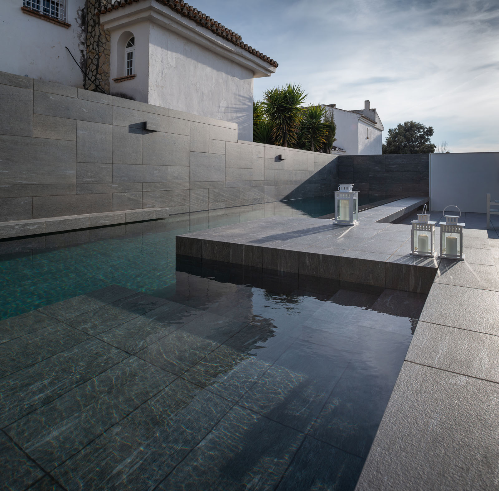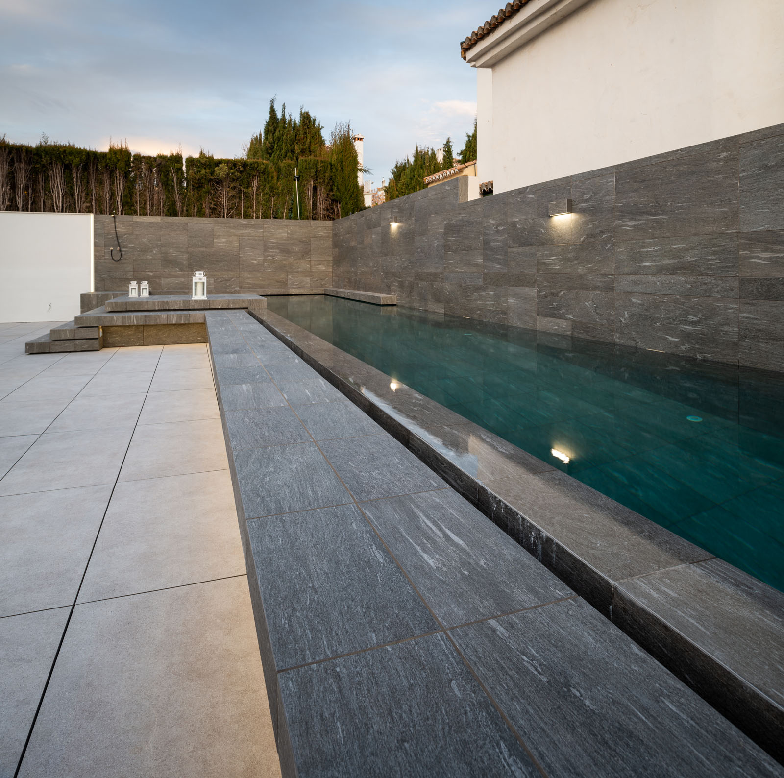 În grădina care înconjoară clădirea a fost creată o zonă de piscină, un element deosebit de plăcut, având în vedere climatul cald din zona Andaluziei. Mystone Pietra di Vals de la Marazzi, realizată cu tehnologia High Performance, este colecția utilizată la placarea orizontală și verticală a bazinului piscinei, a marginilor, a treptelor și a zonelor de duș, fiind aleasă pentru calitățile sale antiderapante excelente, caracteristicile tactile și rezistența la agenții atmosferici. Realizată din gresie porțelanată - aici, cu finisaj Antracite, dar disponibilă și în finisajele Greige și Grigio - colecția reproduce în mod incredibil rugozitatea și aspectul cuarțitului. Diferitele formate montate vertical, 60x120 cm, 30x120 cm, 60x60 și 30x60 cm - și cele utilizate la montarea orizontală în versiunea antiderapantă, sunt la dispoziția proiectanților și potențează montarea facilă a pietrei naturale.