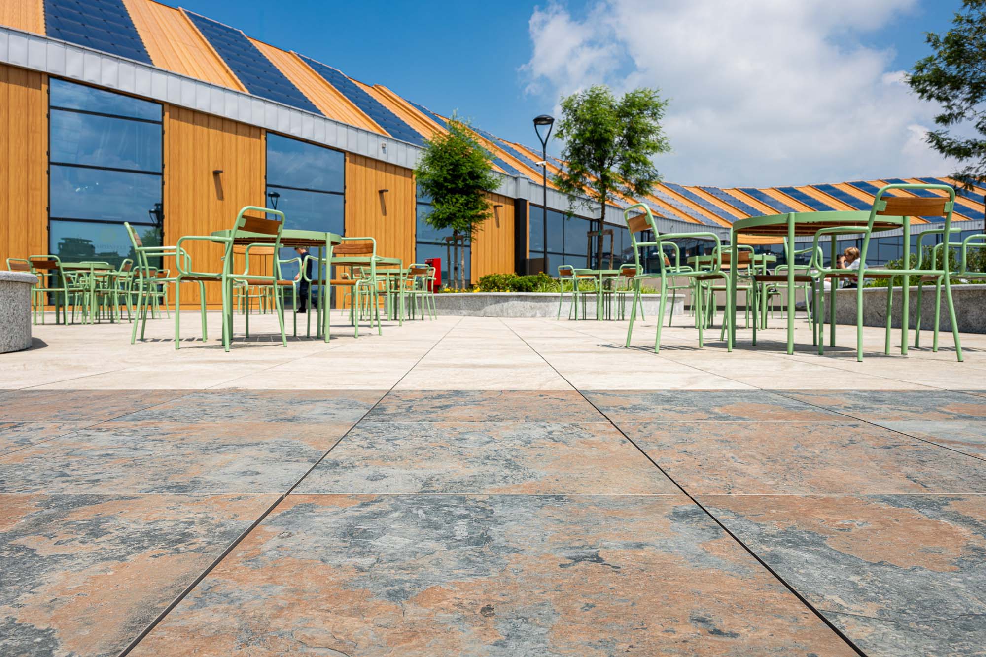 Pentru aleile de pe acoperișul verde, care flanchează un parc fotovoltaic de 5.000 de metri pătrați și este dotat cu un sistem modern de colectare a apelor pluviale, s-a folosit colecția Market, în versiunea Stone Grey. Efectul estetic al aspectului de ciment confirmă rezistența acestui produs conceput pentru spații cu trafic intens, cum ar fi centrele comerciale.