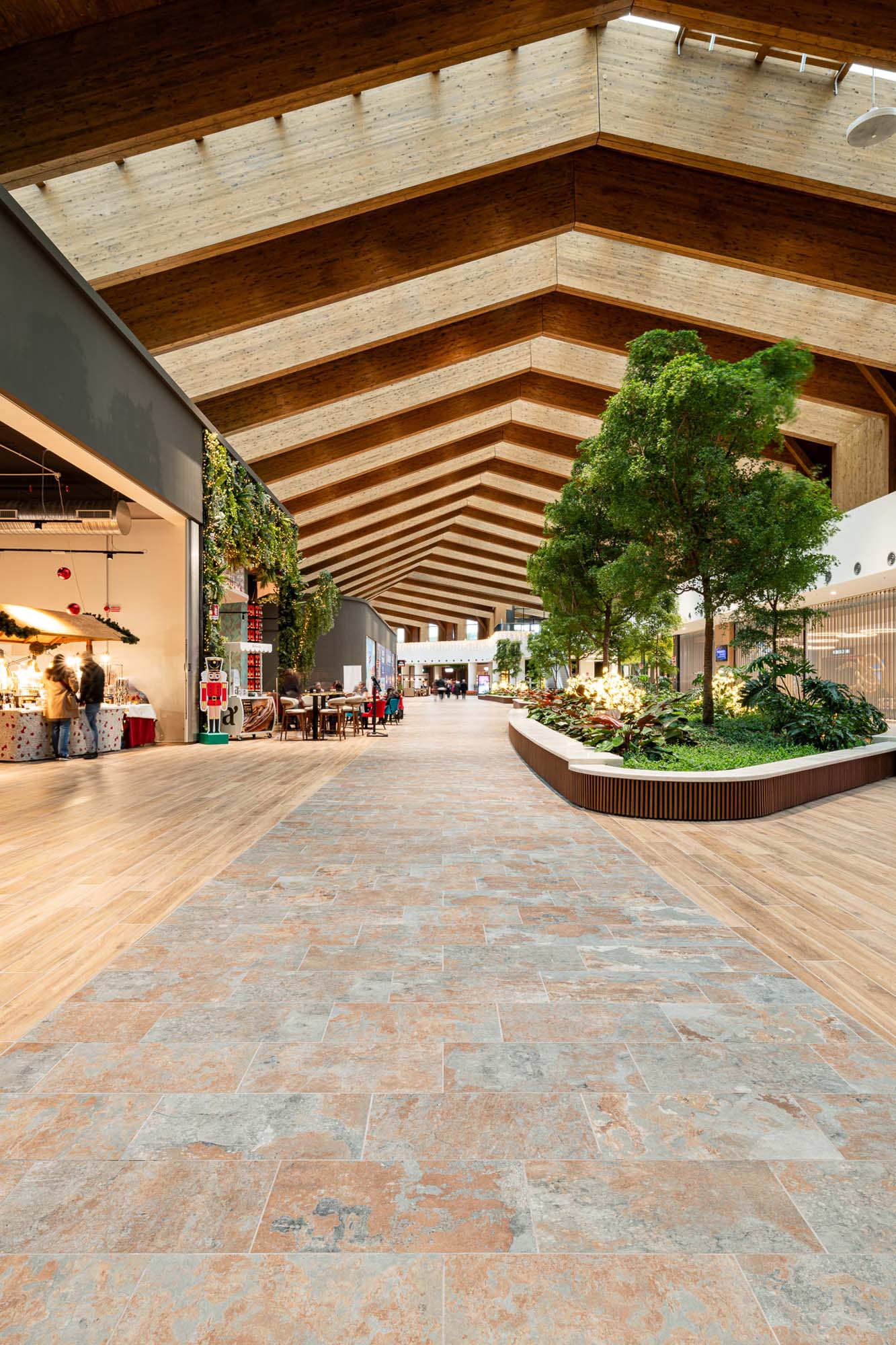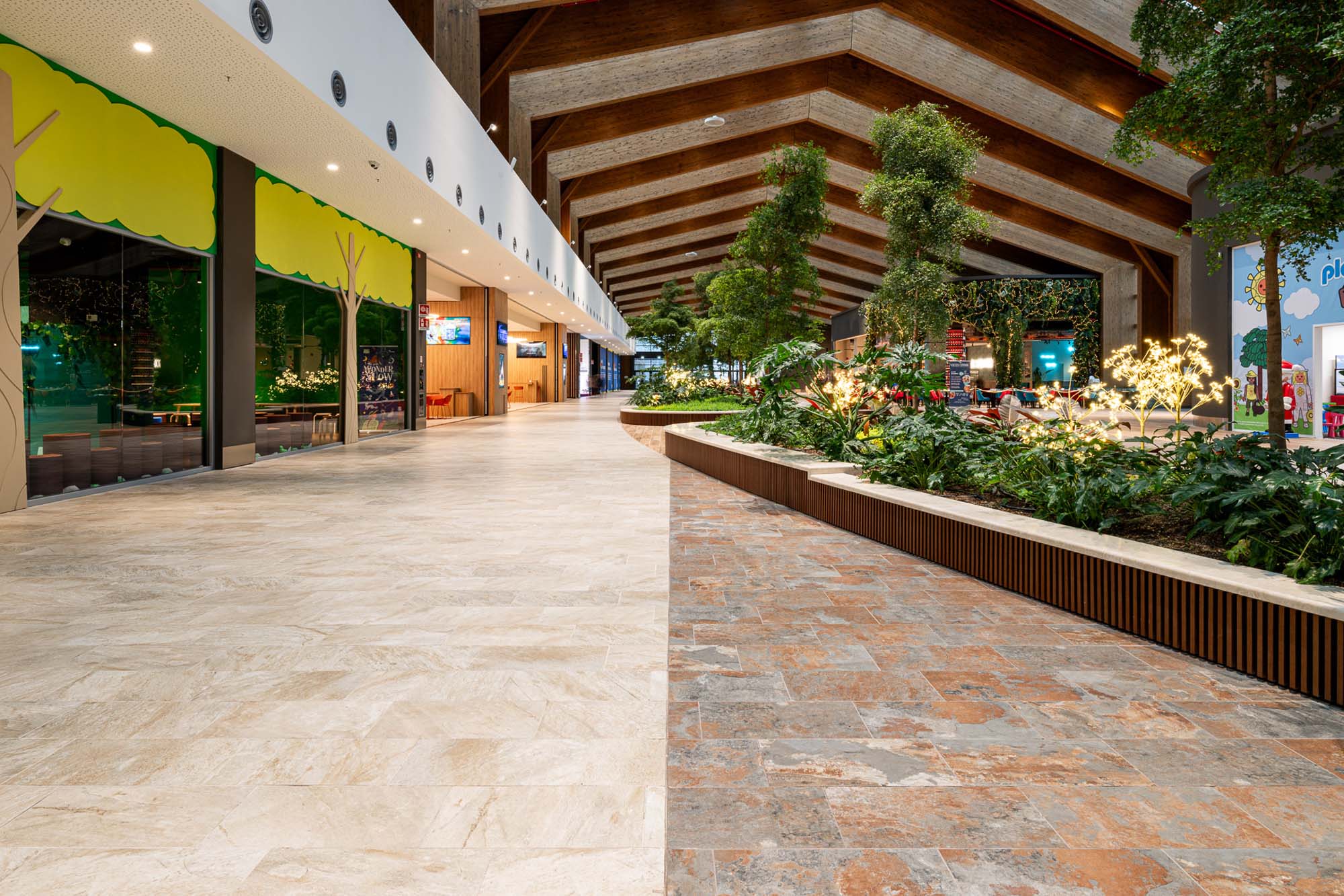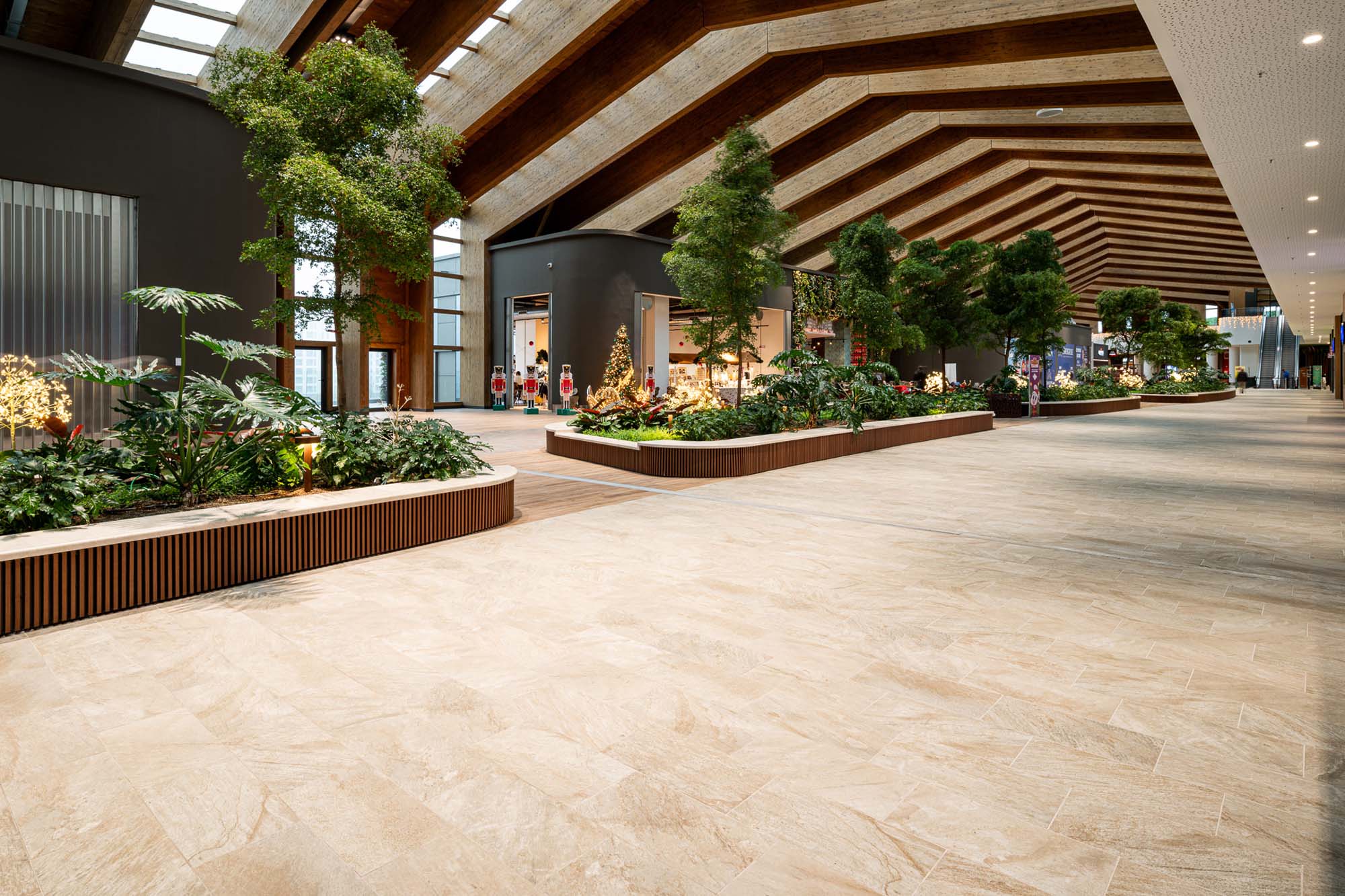 În galerii, texturile inspirate de esențele de lemn de la Treverkview sunt juxtapuse cu insule mari și promenade placate cu colecția de plăci cu aspect de piatră Mystone Limestone, în nuanțele discrete Ivory și Sand.