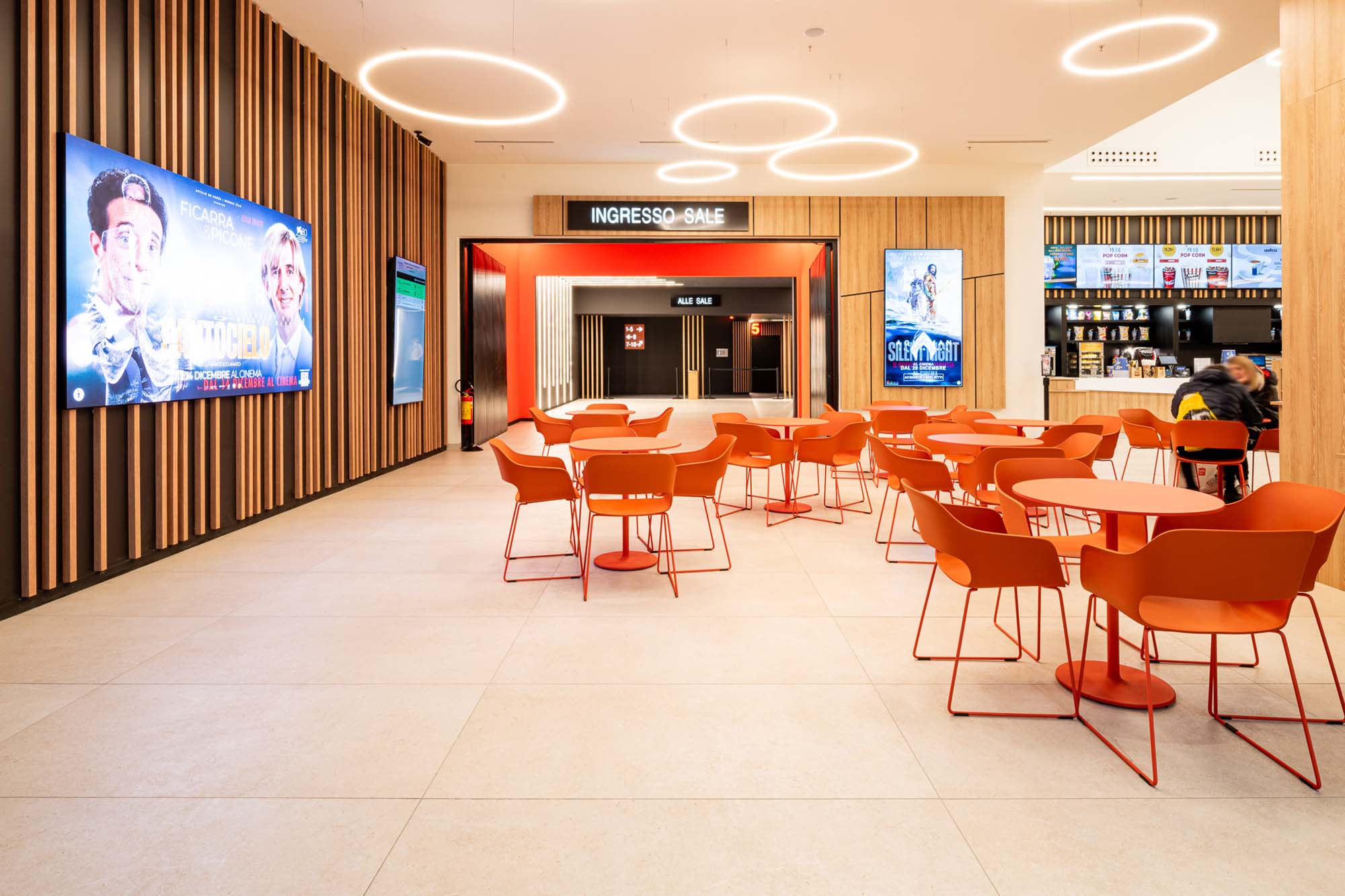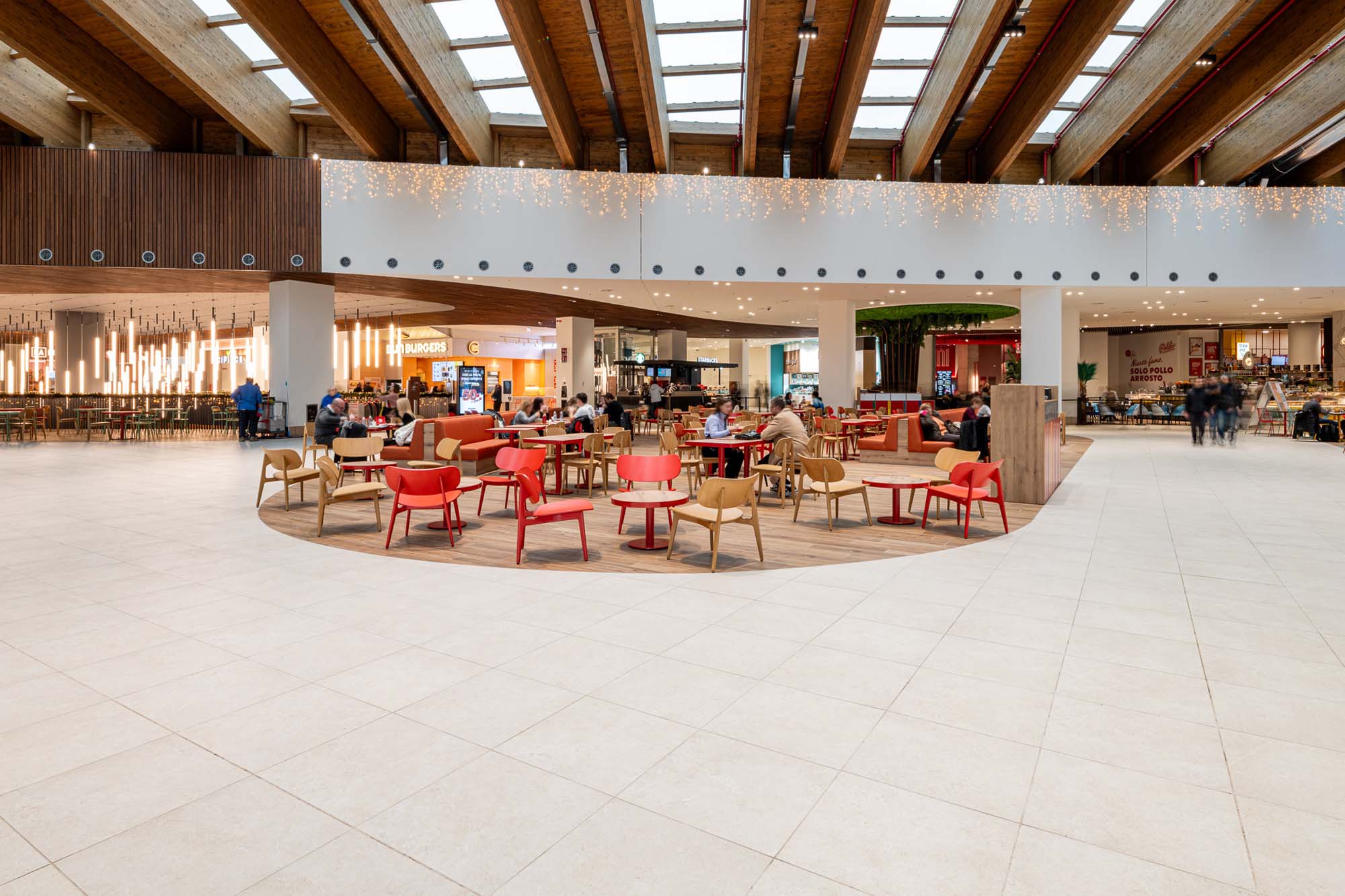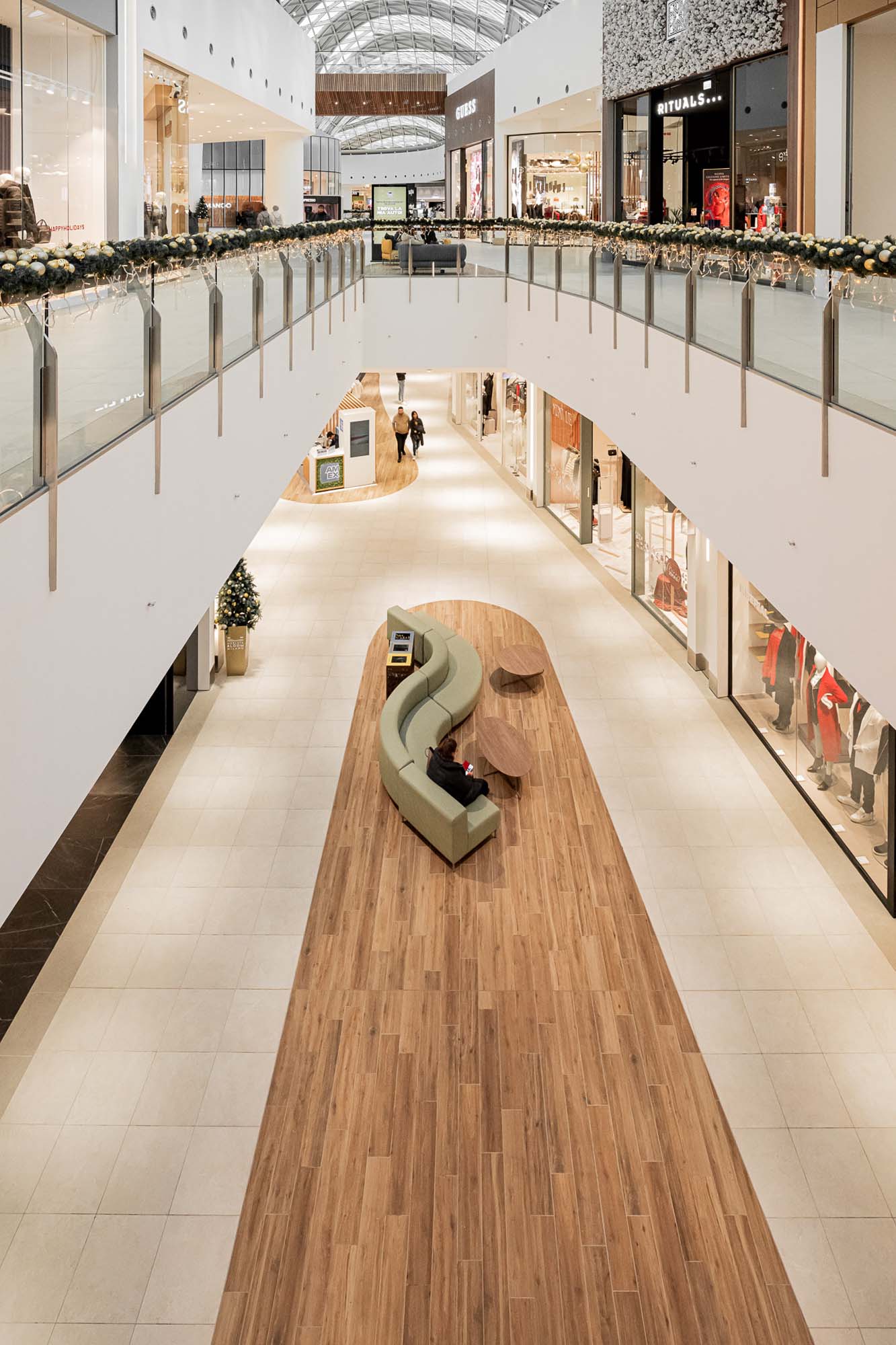 În galerii, texturile inspirate de esențele de lemn de la Treverkview sunt juxtapuse cu insule mari și promenade placate cu colecția de plăci cu aspect de piatră Mystone Limestone, în nuanțele discrete Ivory și Sand.