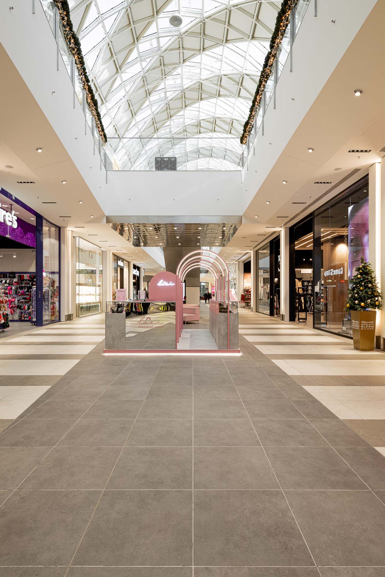 Aleile galeriilor, cu vedere spre magazinele emblematice ale numeroaselor mărci invitate de Merlata Bloom, precum și spre cinematograful multiplex de dimensiuni impresionante, sunt punctate de plăci din seria Rocking – din nou alături de texturile inspirate din natură ale liniei Treverkview, cu o suprafață texturată, în versiunile Multicolor – inspirată de caracterul eterogen al pietrei naturale – și Beige. Plăcile care, în versiunea de 20 mm grosime, însoțesc vizitatorul în spațiile publice din afara centrului lifestyle, devenind modulul de compoziție al zonelor exterioare.