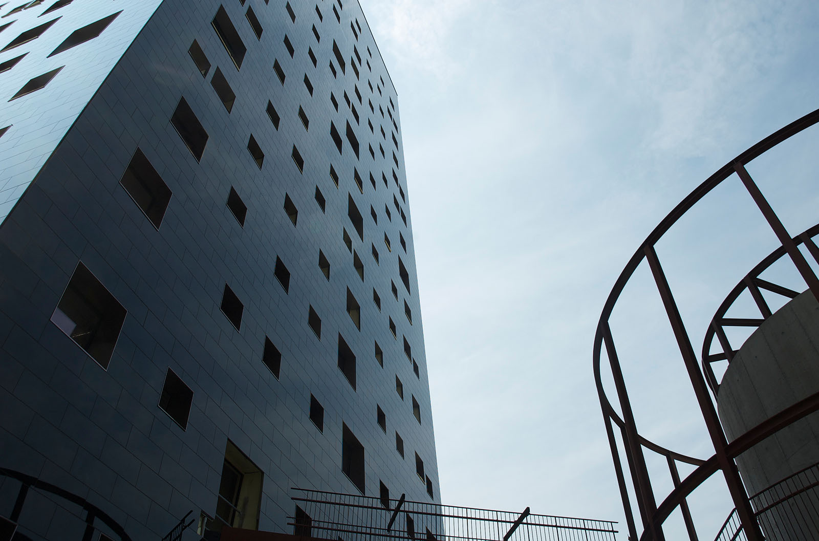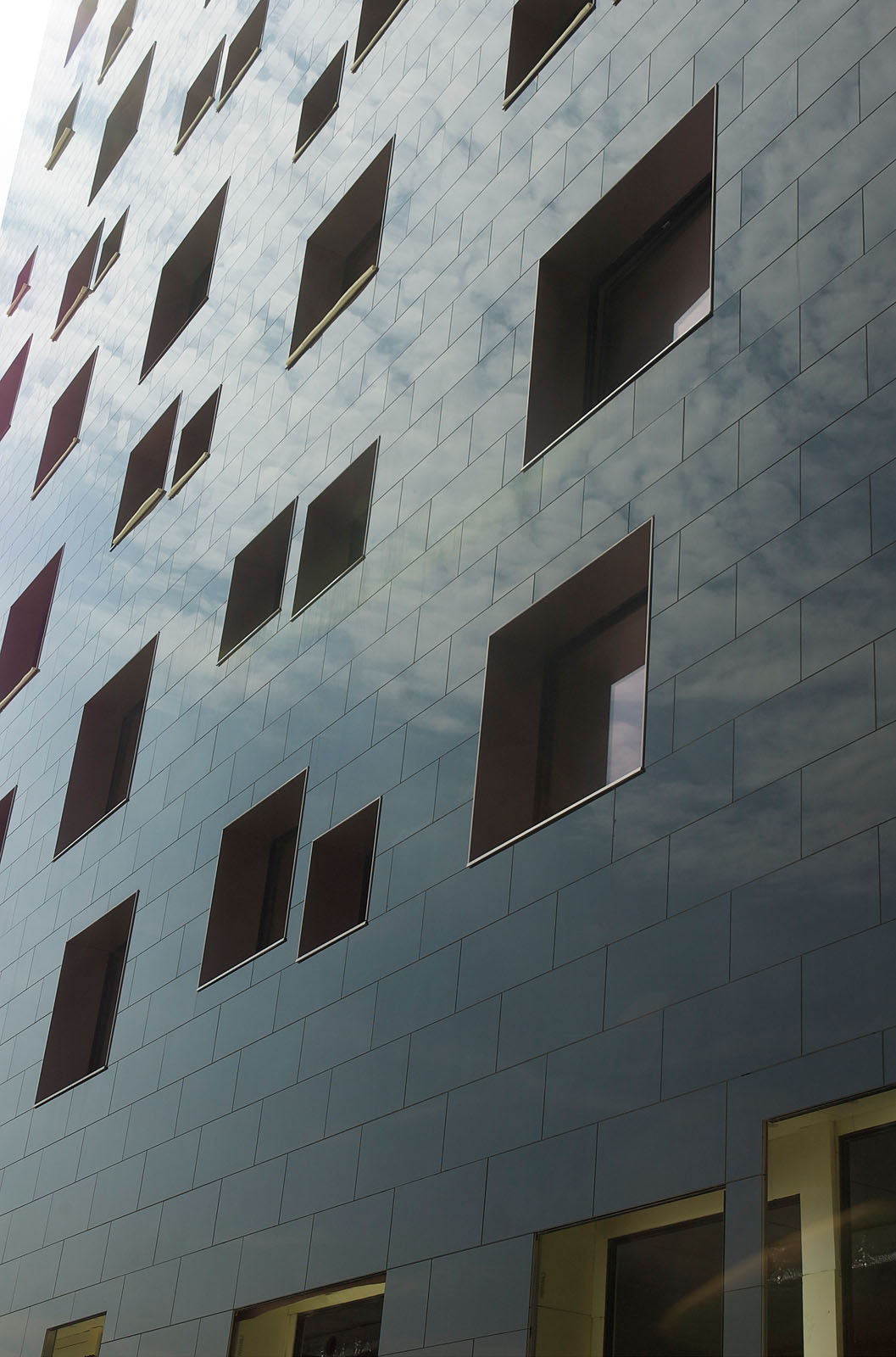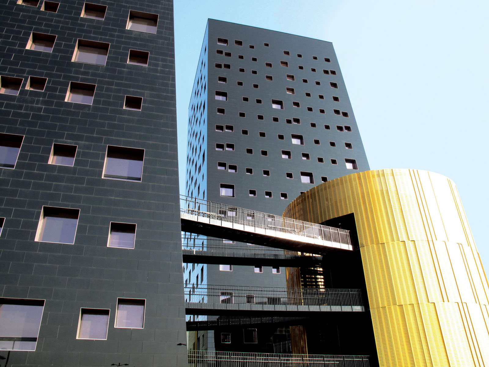 Noile turnuri ale NH Hotel Fiera din Milano se ridică la scurtă distanță de Polul expozițional Rho-Pero, în fața intrării principale. Expresie de vârf al vervei creative a lui Dominique Perrault, arhitect francez de faimă internațională, sunt doi monoliți gigantici cu geometrie sobră și controlată, de culoare negru-lucios, înclinate cu 5 grade față de verticală, care găzduiesc în total 400 de camere clasificate la trei și patru stele. Vocația minimalistă a lui Perrault se exprimă cel mai bine în rafinatul tratament al învelișului exterior al clădirilor, format în întregime din pereți ventilați perforați cu găuri neregulate care îi subliniază omogenitatea dar și tensiunea subțire. Elementele care formează paramentul, complet cu prindere ascunsă, apar din fericita colaborare dintre proiectant și Marazzi Engineering, care a furnizat la cerere un produs special, care răspunde perfect canoanelor stilistice ale maestrului francez și continuei sale atitudini de a experimenta pe materiale și pe puterea lor evocativă. Rezultatul este Jolly Black, o placă forma mare (50x100 cm) formată dintr-un fond de gresie porțelanată acoperit de un strat de vitroceramică neagră. Suportul din gresie este caracterizat de înalte prestații tehnice și permite cuplarea, la nivelul feței interioare, a elementelor de prindere de substructura de prindere.
