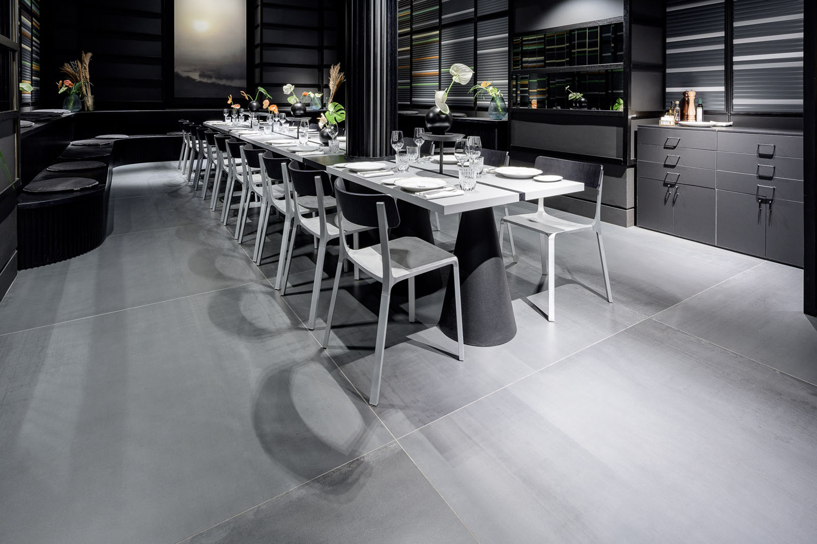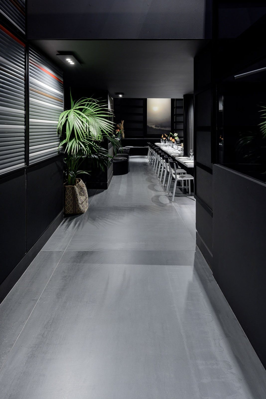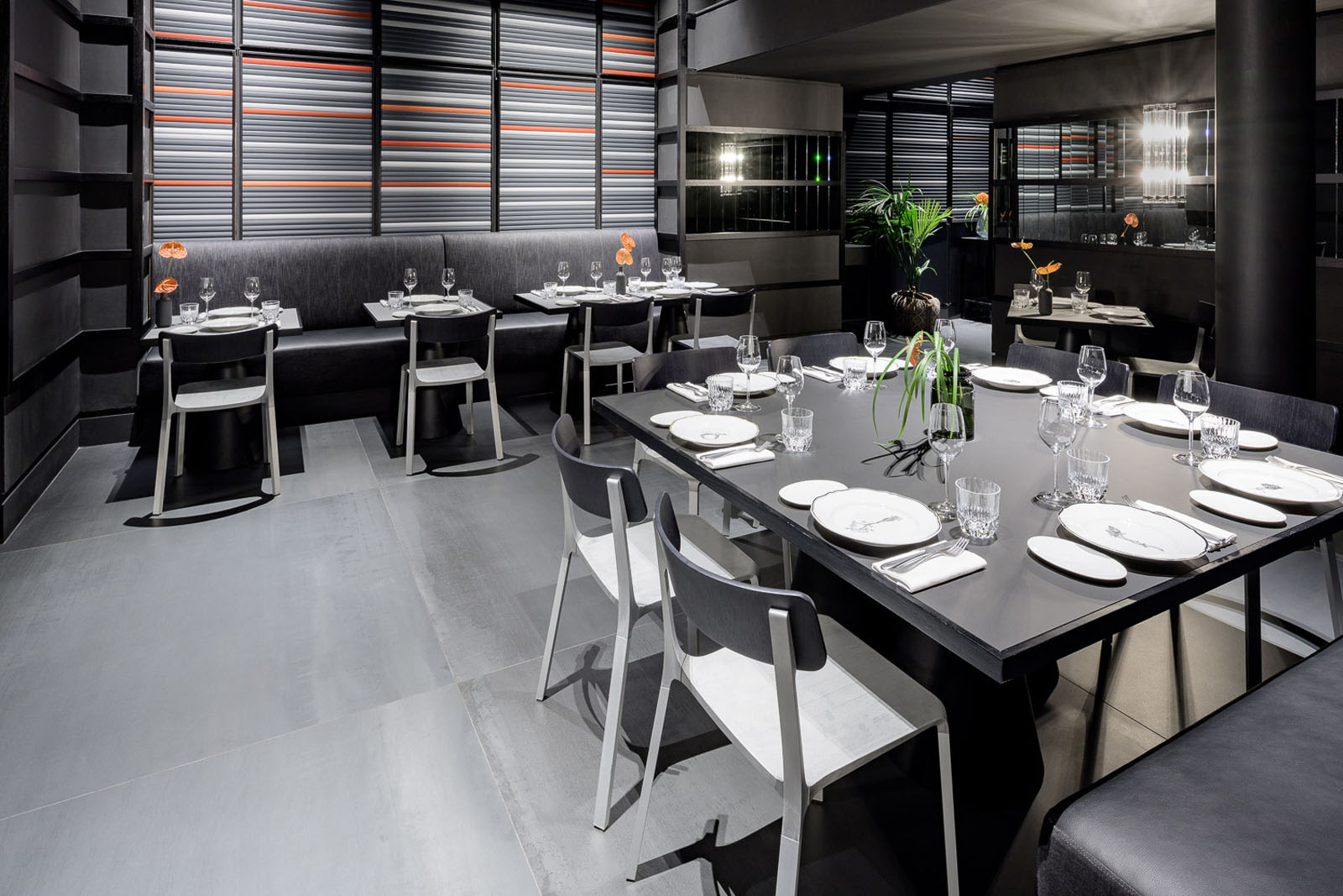 Schimbarea se observă chiar de la intrarea ce dă spre parterul unde se află cocktail-bar-ul, iar apoi se continuă, printr-o scară, până la nivelul -2, unde se află diverse încăperi ale restaurantului, fără surse de lumină directă, toate cu un numitor comun: culoarea neagră. Pentru a sublinia stilul metropolitan și pentru a conferi continuitate cromatică, designerul a ales pentru pardoseală plăcile mari din colecția Grande Metal Look de la Marazzi, în culoarea Iron Dark, cu un aspect irizat aparte, în formatul personalizat 160x160 cm, obținut prin tăierea plăcilor de 160x320 cm, cu o rezistență la uzură ridicată și ușor de întreținut.