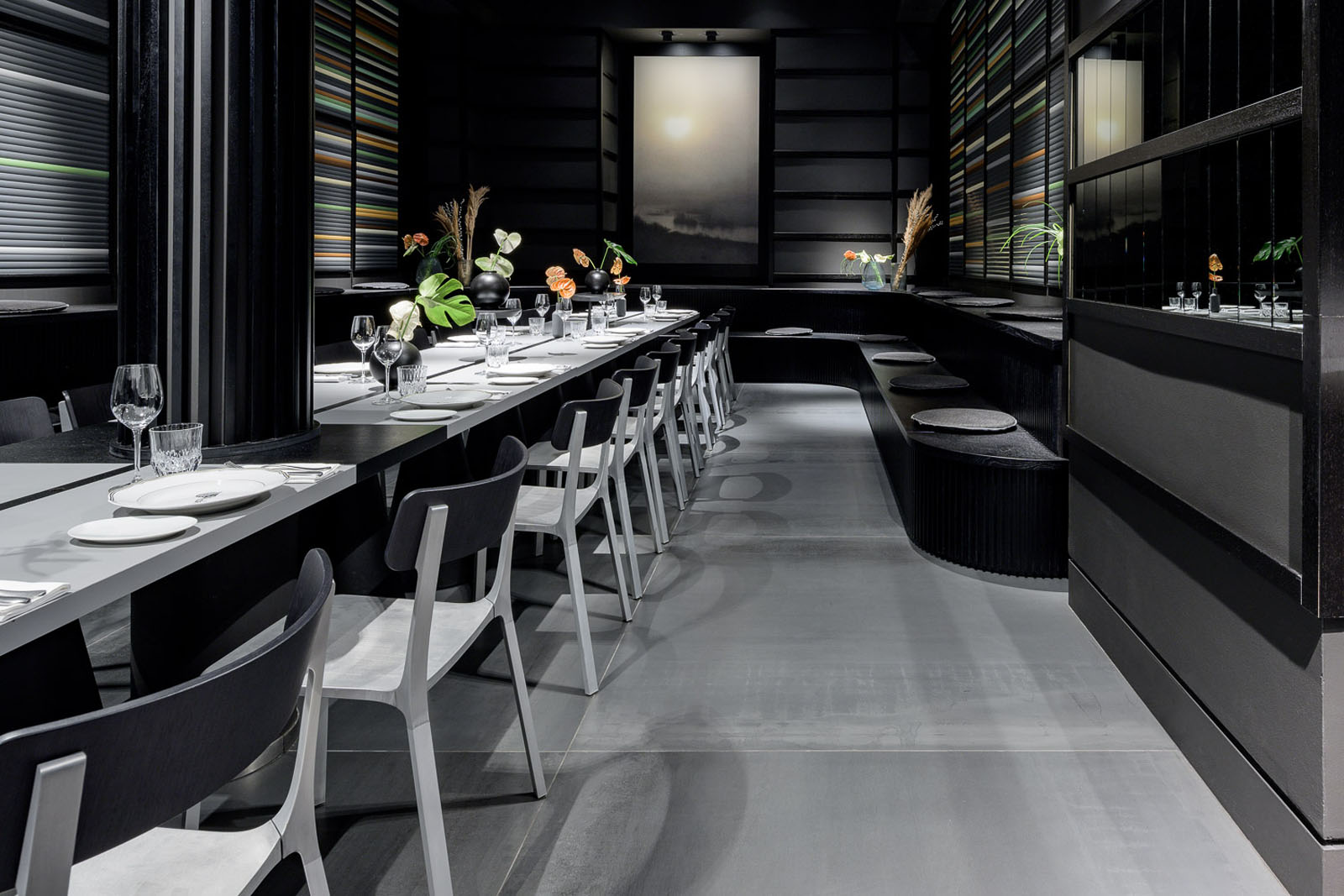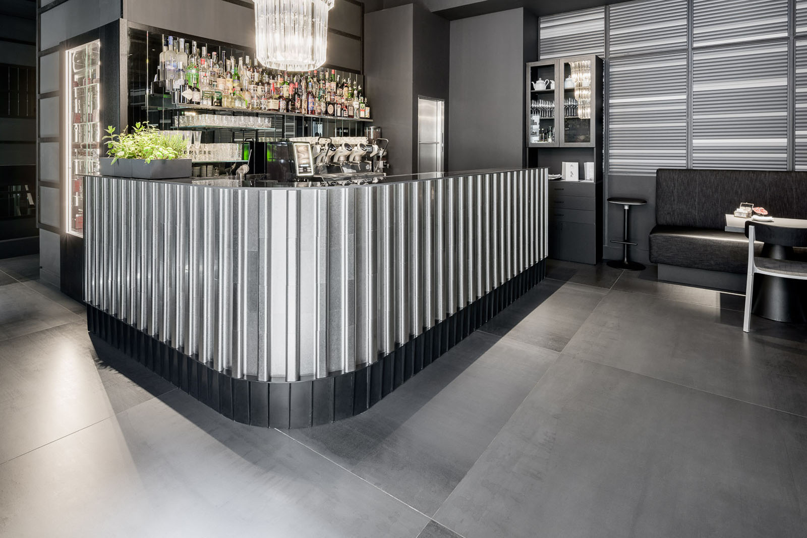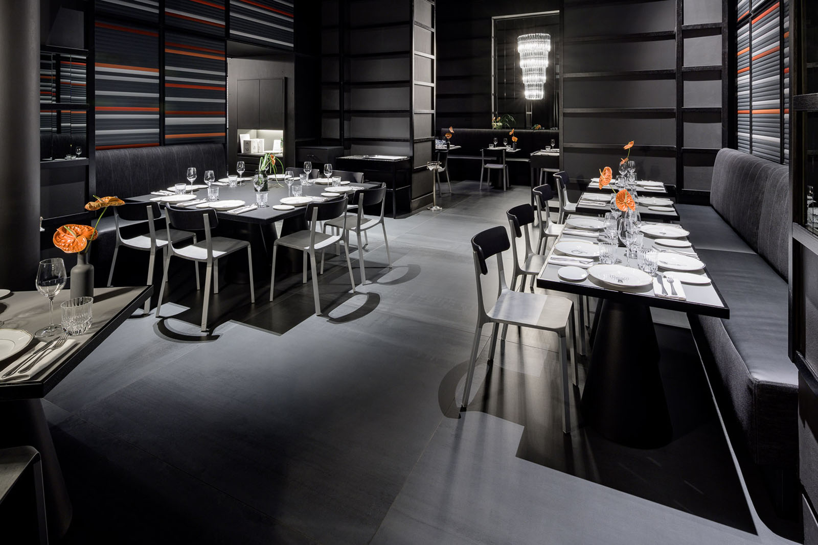 Schimbarea se observă chiar de la intrarea ce dă spre parterul unde se află cocktail-bar-ul, iar apoi se continuă, printr-o scară, până la nivelul -2, unde se află diverse încăperi ale restaurantului, fără surse de lumină directă, toate cu un numitor comun: culoarea neagră. Pentru a sublinia stilul metropolitan și pentru a conferi continuitate cromatică, designerul a ales pentru pardoseală plăcile mari din colecția Grande Metal Look de la Marazzi, în culoarea Iron Dark, cu un aspect irizat aparte, în formatul personalizat 160x160 cm, obținut prin tăierea plăcilor de 160x320 cm, cu o rezistență la uzură ridicată și ușor de întreținut.