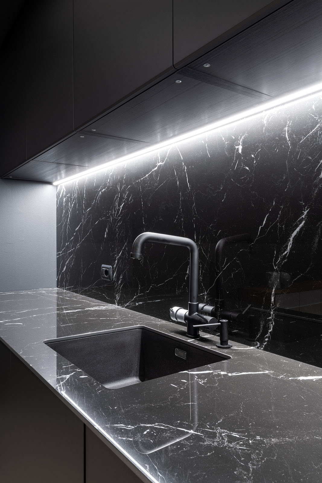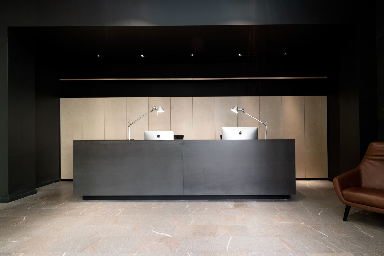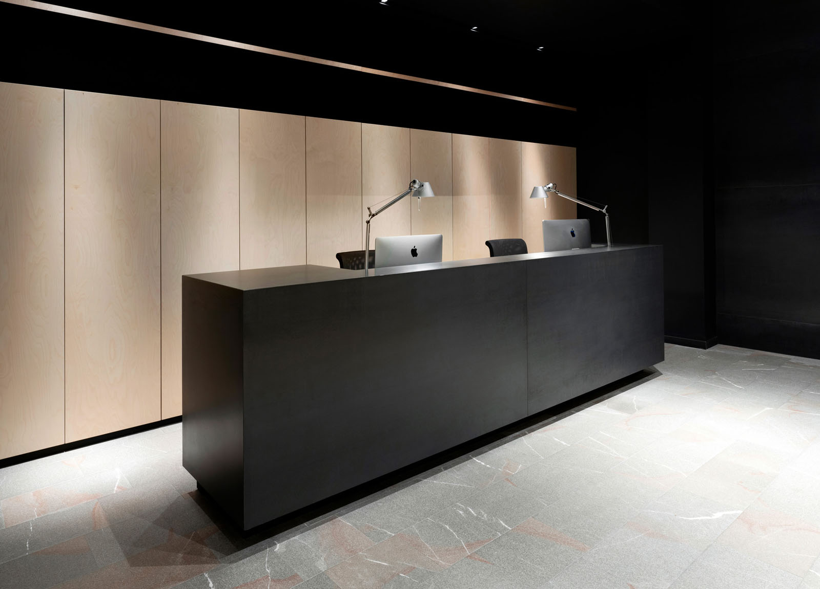 Mystone Ceppo di Gré, Gris Fleury sunt colecțiile cu aspect de piatră în trei nuanțe de gri utilizate pentru majoritatea spațiilor, de la intrare până la băile comune. Plăcile mari și subțiri au fost, în schimb, alese pentru placarea bucătăriei (The Top Elegant Black cu finisaj lucios) și a blatului de la recepție (The Top Metal Look în nuanța Iron Dark).