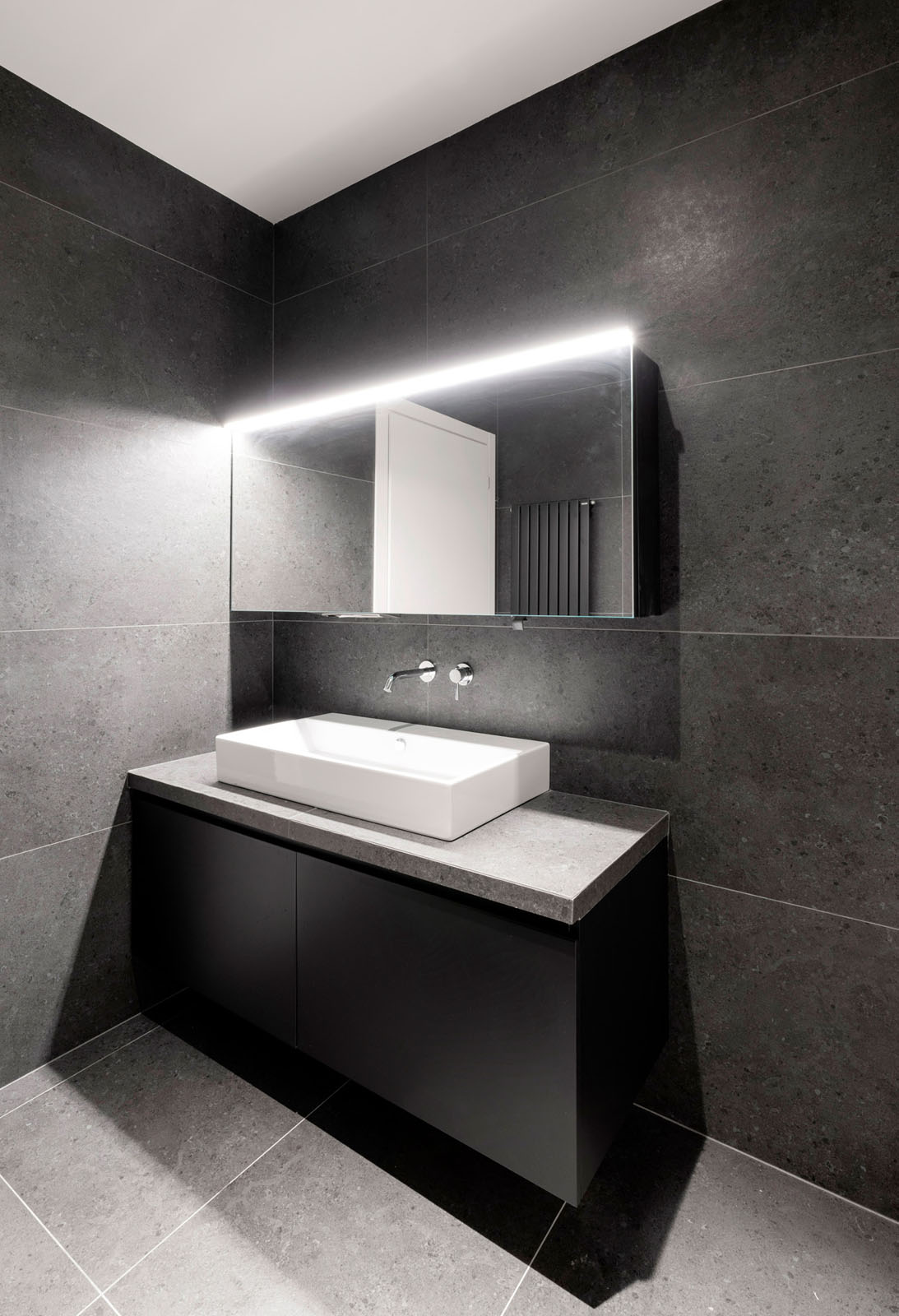 Pentru proiect s-au folosit cinci tipuri de gresie porțelanată, alese atât pentru placarea pereților și a pardoselii, cât și ca material de finisare.