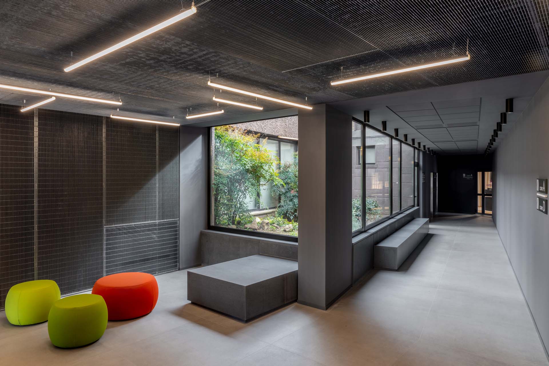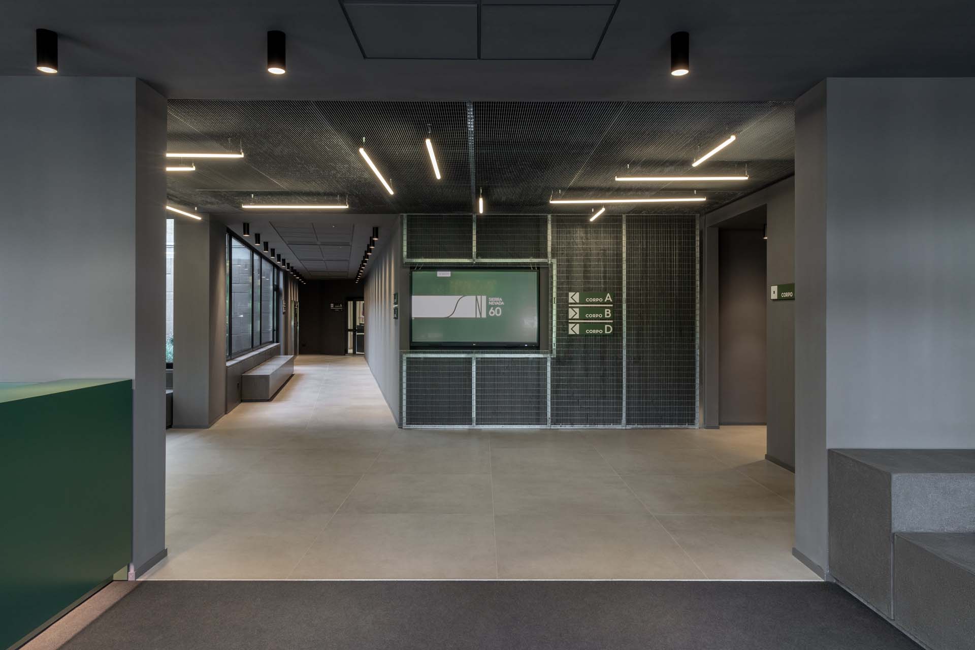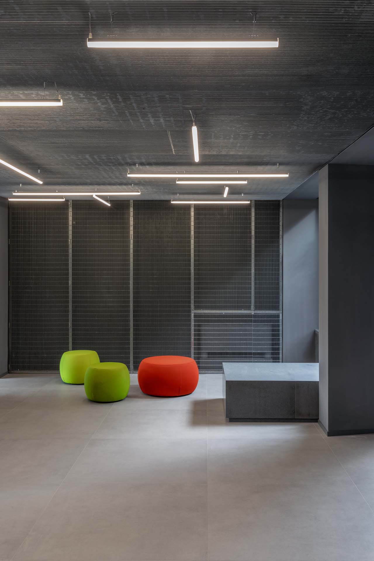 Caracterul distinctiv al holului reiese din tonurile de gri alese pentru pardoseală și pereți, îmbogățite cu inserții din piatră vulcanică ce îmbracă pardoselile și pereții lifturilor. Pentru a crea continuitate și a sublinia stilul industrial al spațiului, colecția Cementum Nickel în formatul pătrat mare 120x120 cm este o soluție optimă pentru pardoseală. O gresie porțelanată cu efect de ciment care, reinterpretând un material transversal precum materialul de inspirație, permite o mulțime de aplicări și este caracterizat de cele mai inovative tehnologii premium ale laboratoarelor Marazzi precum BodyPlus, care oferă un aspect natural cu inserții din piatră, și performanțele tehnice pentru suprafețe antiderapante StepWise.
