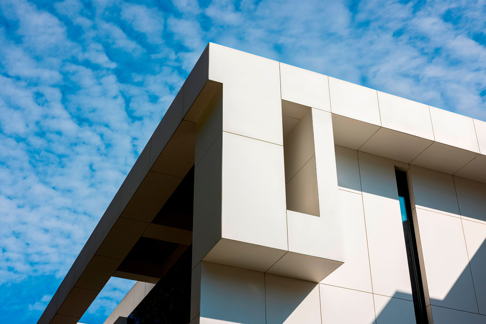 Materialul preferat a fost versiunea Solid Color în cele două culori, alb și negru, cu o textură a suprafeței cu o consistență plină și întreținere practică. Placarea exterioară a fațadei ventilate a fost realizată cu Grande Solid Color White în formatul cel mai mare din gamă - cel de 160x320 cm - și cu grosime de 12 mm. Varianta Solid Color Black a fost folosită, în schimb, ca inserție decorativă pe unul dintre pereți.