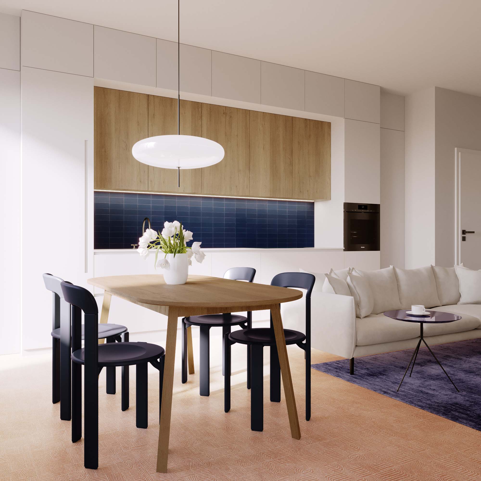 Bucătăria se distinge suplimentar datorită backsplash-ului realizat cu colecția Crogiolo Terramater în nuanța Laguna. „Albastrul intens al colecției Terramater ne-a permis să creăm un contrast vizual care evidențiază matericitatea teracotei și a lemnului”, subliniază Studio Subconscio. Această placare verticală, realizată cu 60% material reciclat, reproduce ceramicile artizanale de odinioară, cu suprafețe ușor structurate ce joacă cu lumina și adaugă profunzime vizuală.