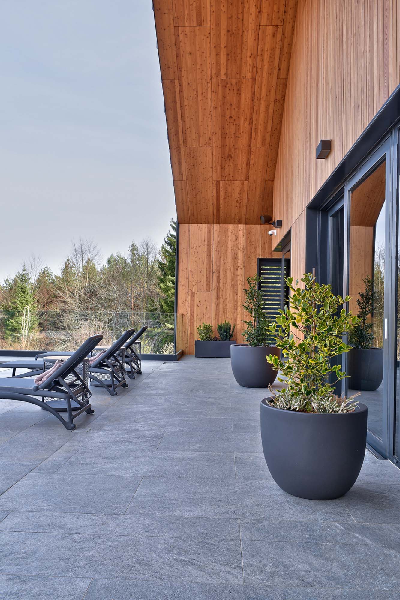 Colecțiile Marazzi au fost utilizate pentru a defini întreaga zonă exterioară: pardoselile din jurul piscinei (colecția Mystone Quarzite, nuanța Platinum, în formatul de 50x100 cm și 20 mm grosime) și placările pentru cadă (colecția Mystone Bluestone, nuanța Piombo, în dimensiunea de 30x60 cm).