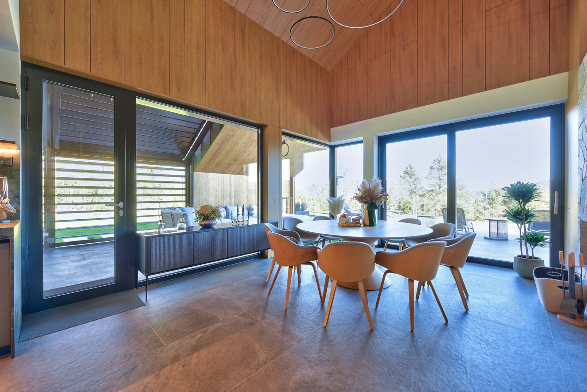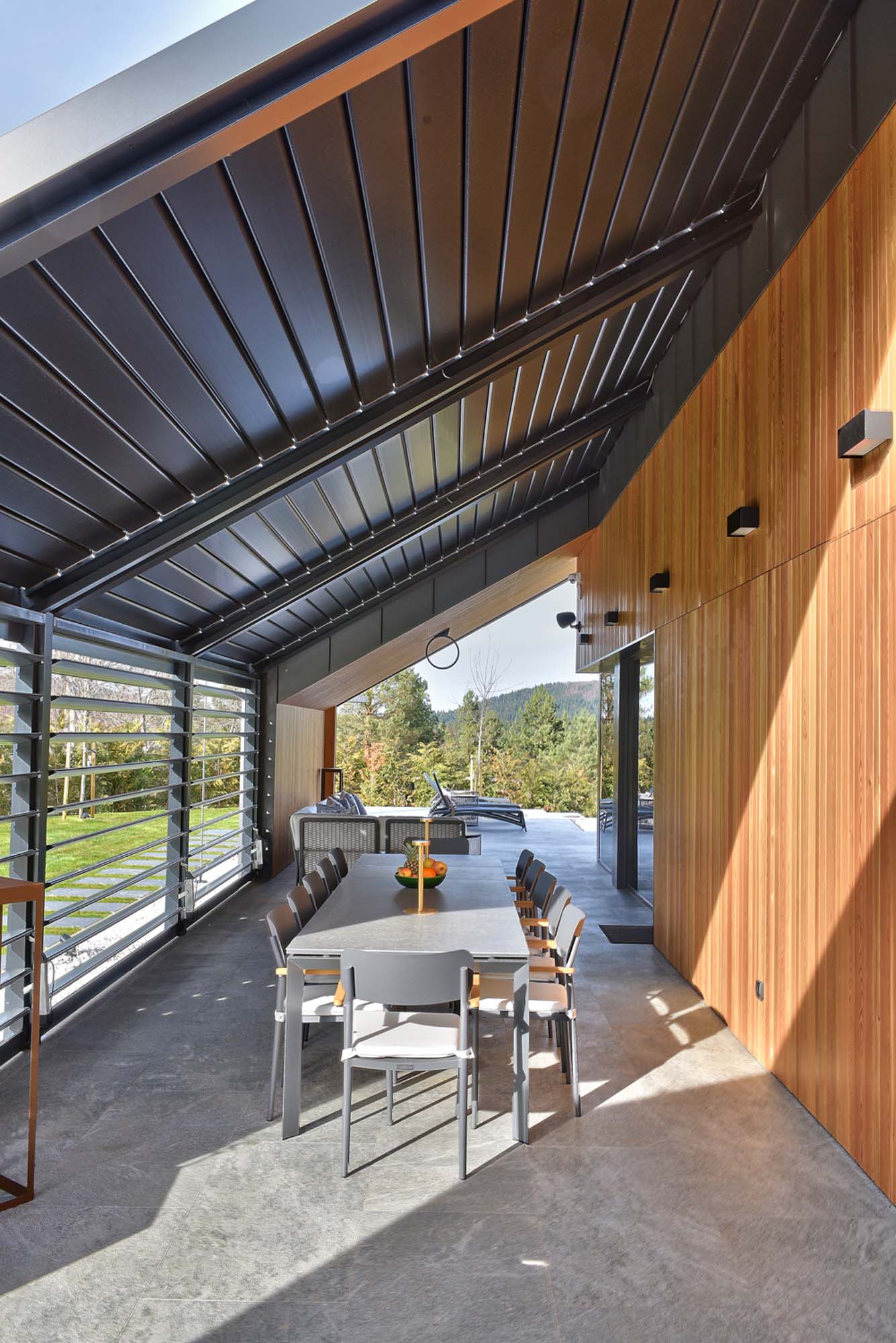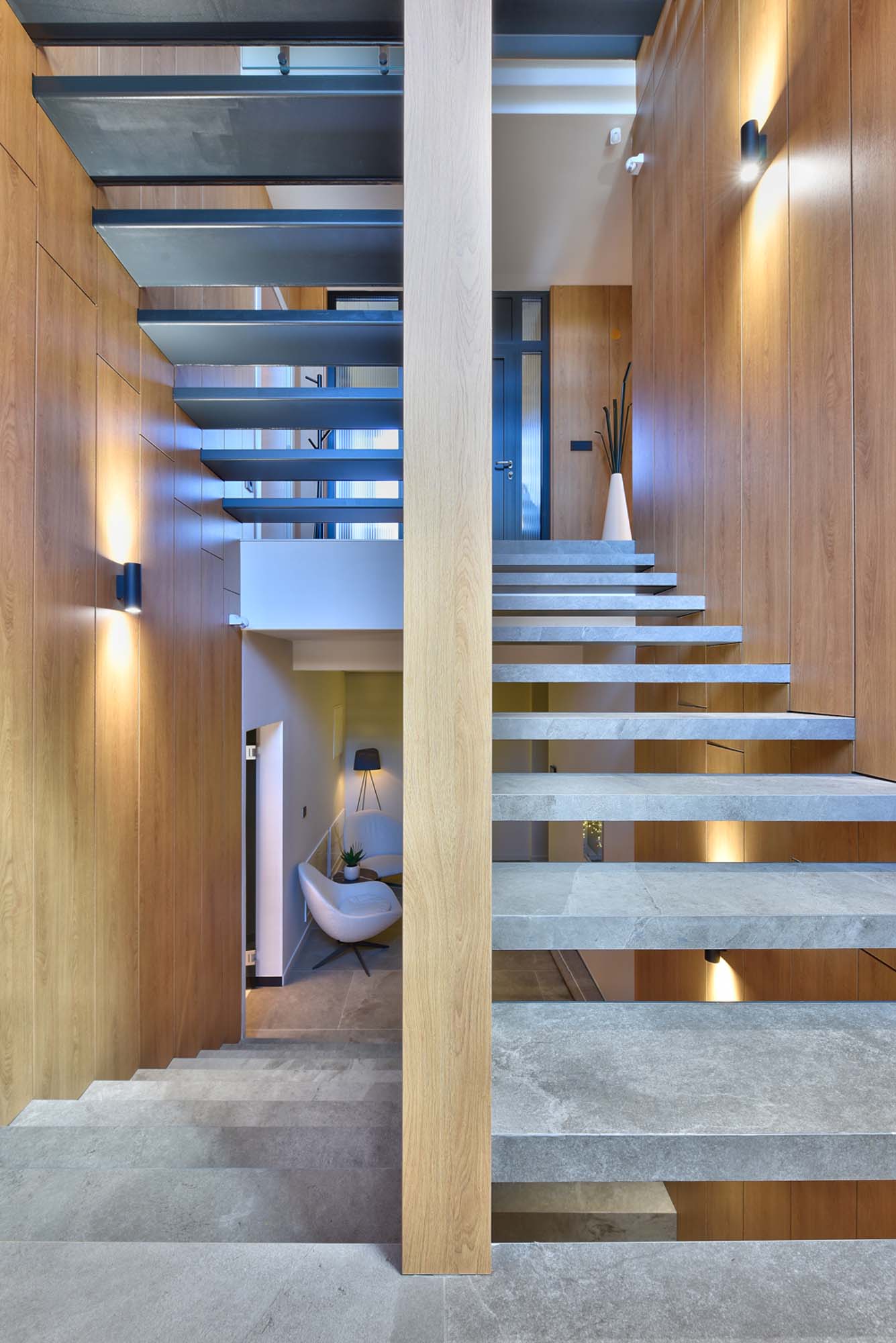 „Pentru a respecta legătura strânsă cu terenul acestei locuințe, am făcut un lucru foarte atent în alegerea materialelor”, povestesc fondatorii biroului. „Predominanța lemnului laminat ca material de construcție și de placare a corpului vilei se confruntă cu suprafețele extinse din gresie porțelanată. O alegere care confirma viziunea noastră este certitudinea că am selectat un material cu impact redus. O sustenabilitate nu doar în forma materialului, ci și în procesele pentru realizarea acestuia.”