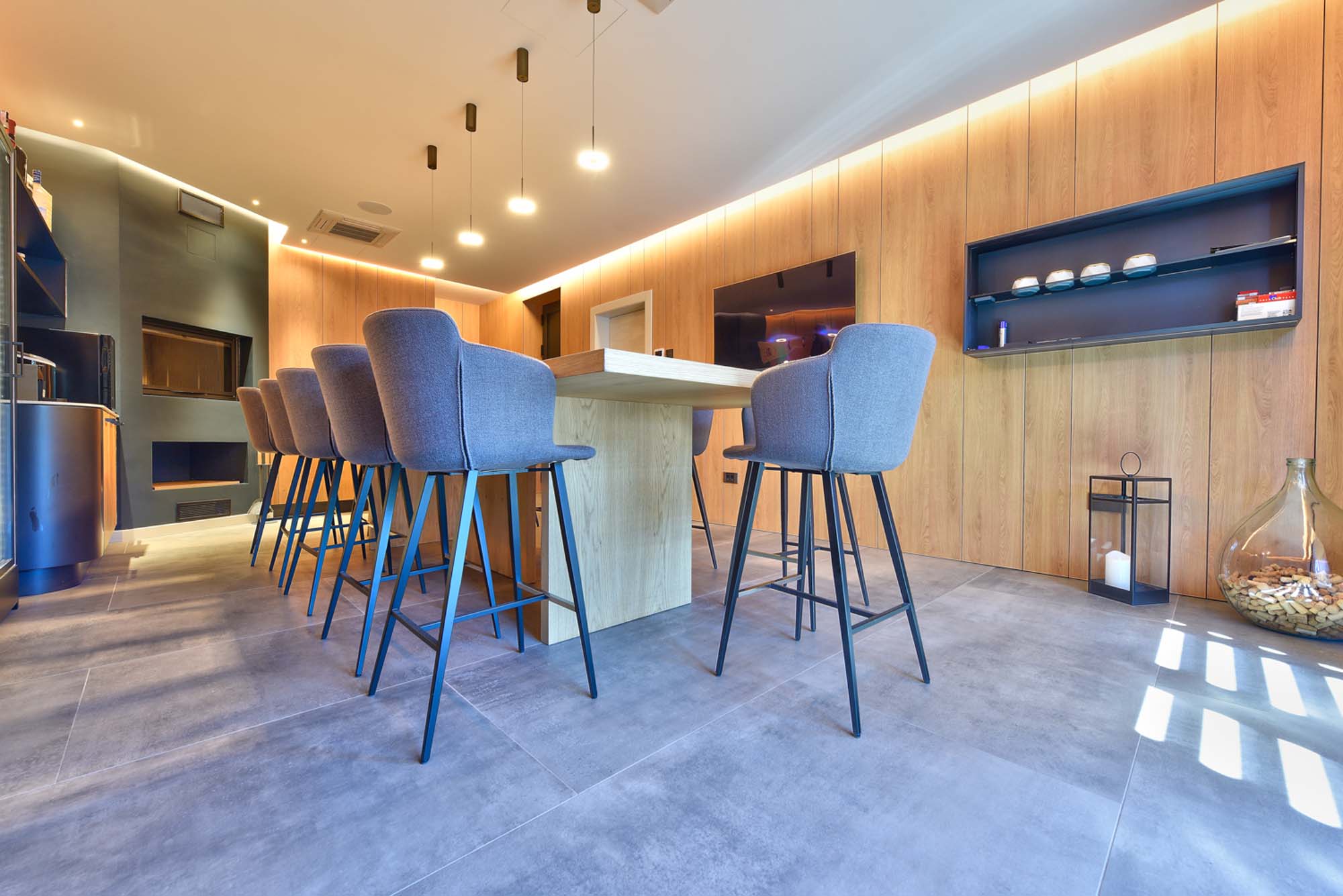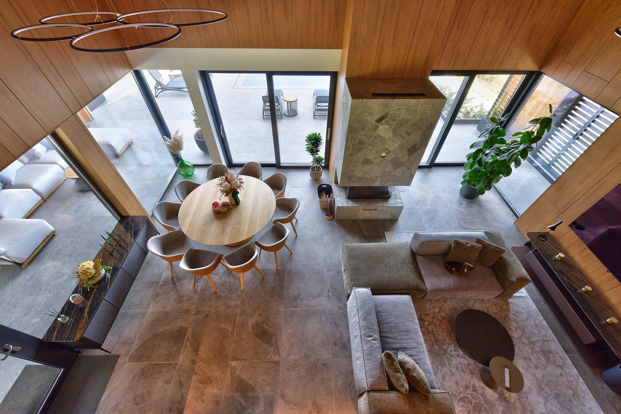 Suprafețele din living și bucătărie, inundate de lumina naturală provenită din mari deschideri către munți, sunt influențate de farmecul rocilor sedimentare evocată de colecția Mystone Ardesia, aici aplicată în culoarea Cenere (75x150 cm), care lasă loc, în spațiosul patio acoperit, colecției Mystone Quarzite în nuanța Platinum, în formatul de 60x120 cm.