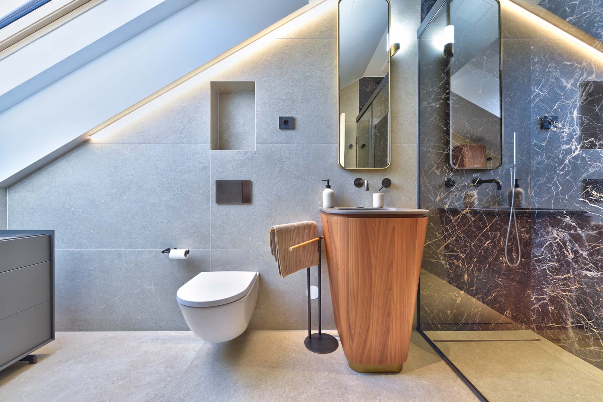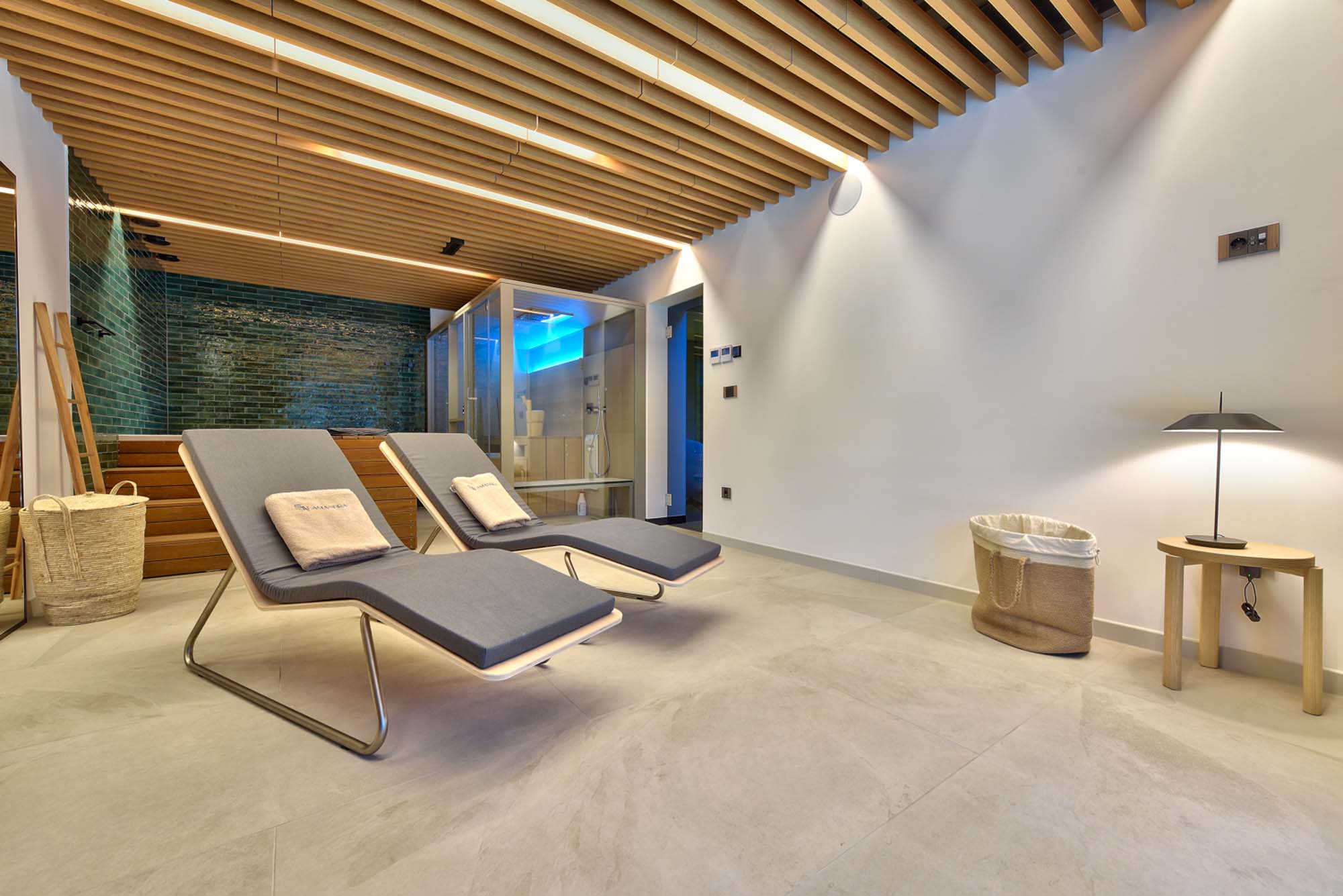 O referire la suprafețele rugoase ale munților înconjurători o găsim și în băi, unde colecția Mystone Limestone, în nuanța Sand, îmbracă peretele căzii și pardoseala dușului, în timp ce aspectul de piatră în nuanța Bianco a colecției Mystone Ardesia – în formatul de 75x150 cm – completează pardoselile din zona wellness.
