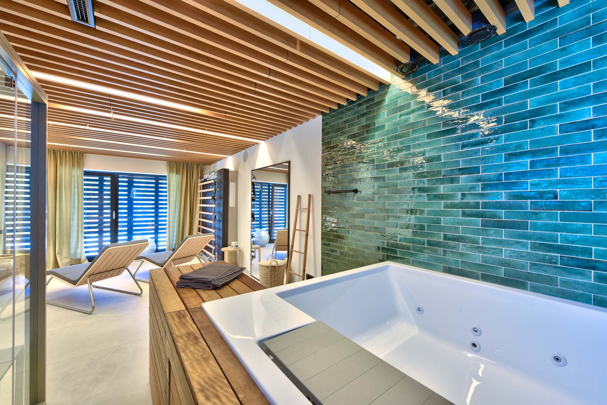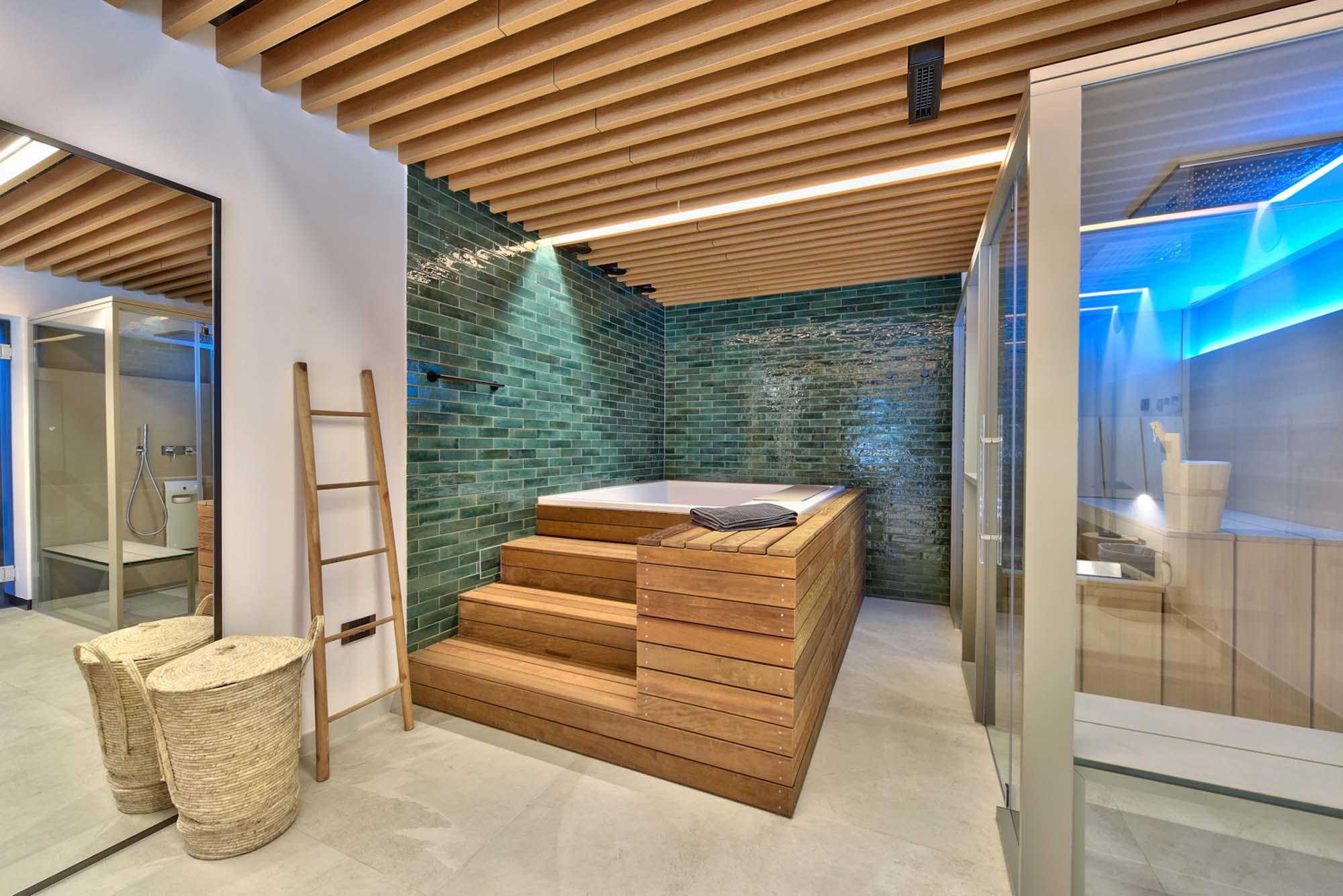 Singura abatere de la gamele Stone și Marble Look sunt superbii pereți de culoare Green din seria Crogiolo Lume, care, cu cărămizile sale mici, strălucitoare și imperfecte (6x24 cm), creează o reflecție unică a luminii în spațiul care găzduiește cada Jacuzzi.