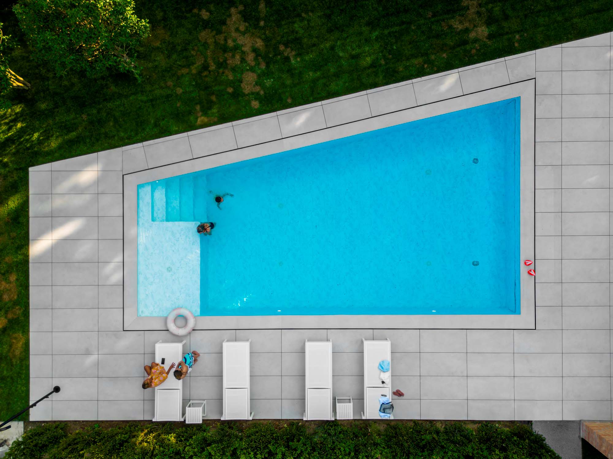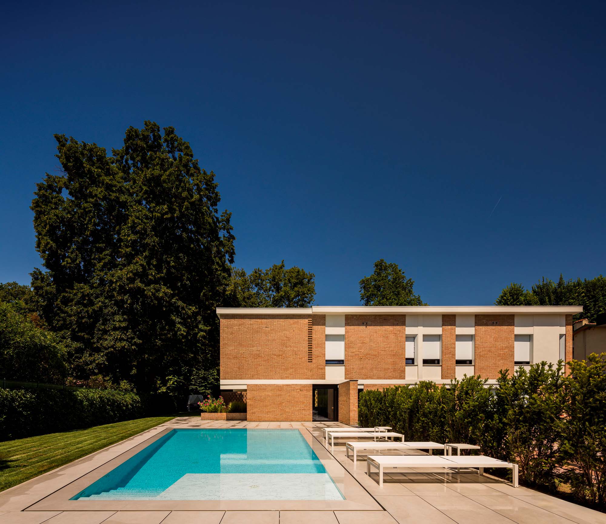 În special, pentru a asigura coerență și funcționalitate, biroul de arhitectură a proiectat împreună cu Marazzi o pardoseală flotantă din gresie porțelanată, utilizată în soluție de continuitate pe zona pavată din exterior, în spațiul terasei și în zona piscinei: rezultatul este un proiect de o curățenie deosebită, care evidențiază compoziția planimetrică distinctivă a vilei. Avantajul pardoselii flotante supraînălțată ridicată este acela de a crea un volum tehnic sub suprafața care va găzdui toate instalațiile, asigurând integrabilitate maximă cu mediul și flexibilitate în distribuția instalațiilor.