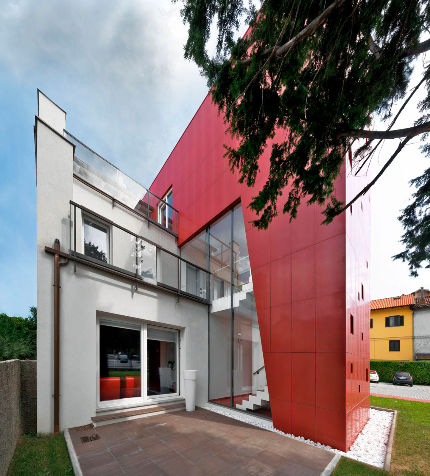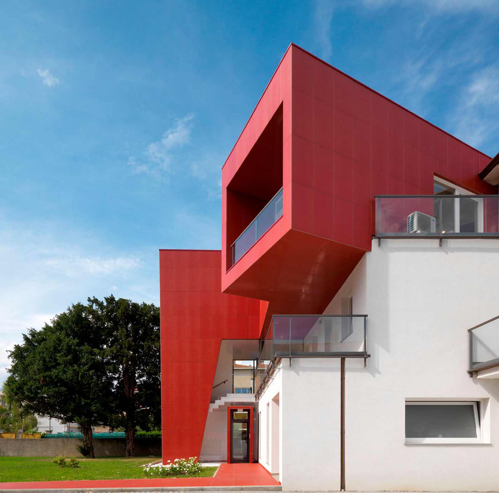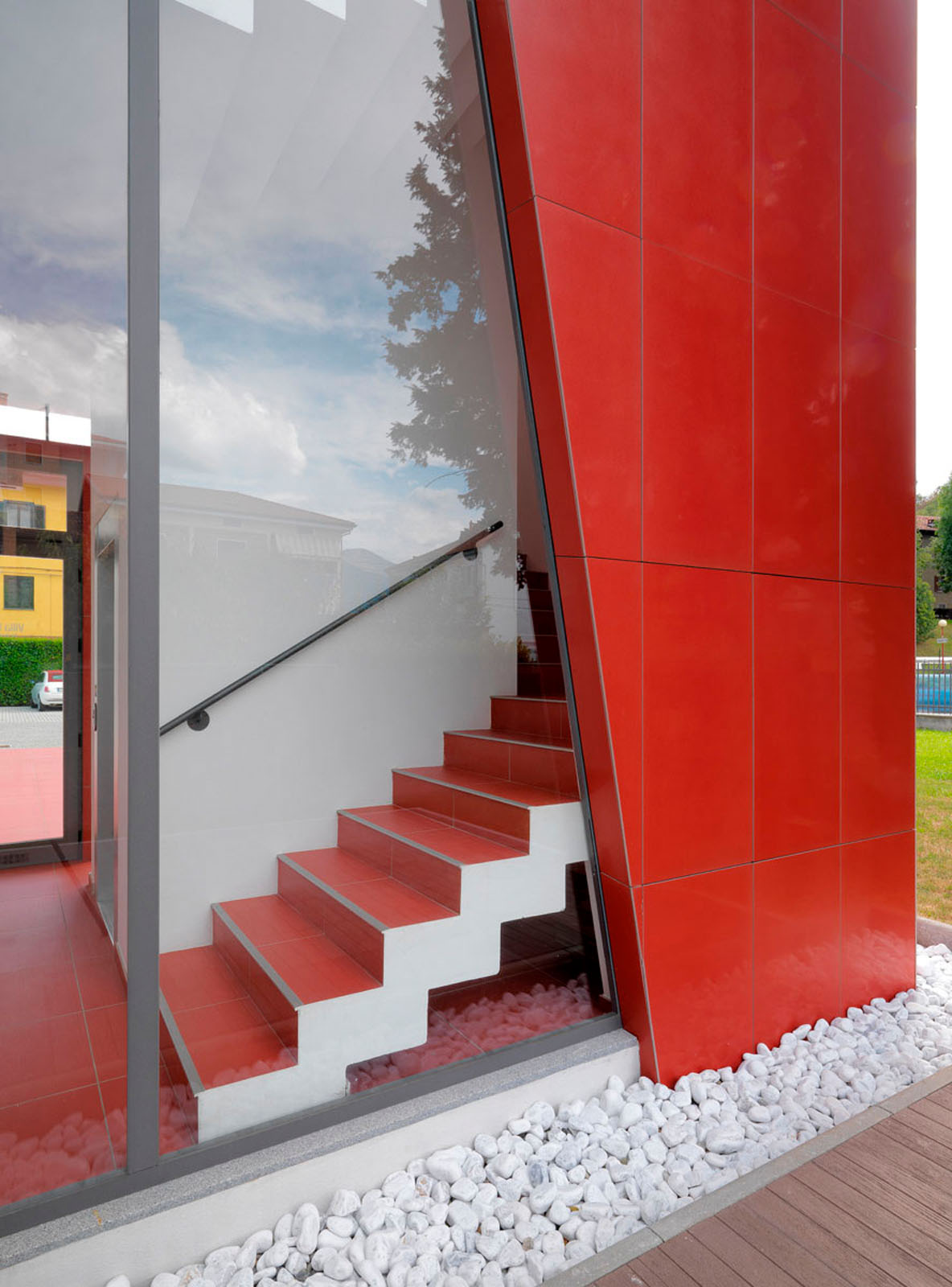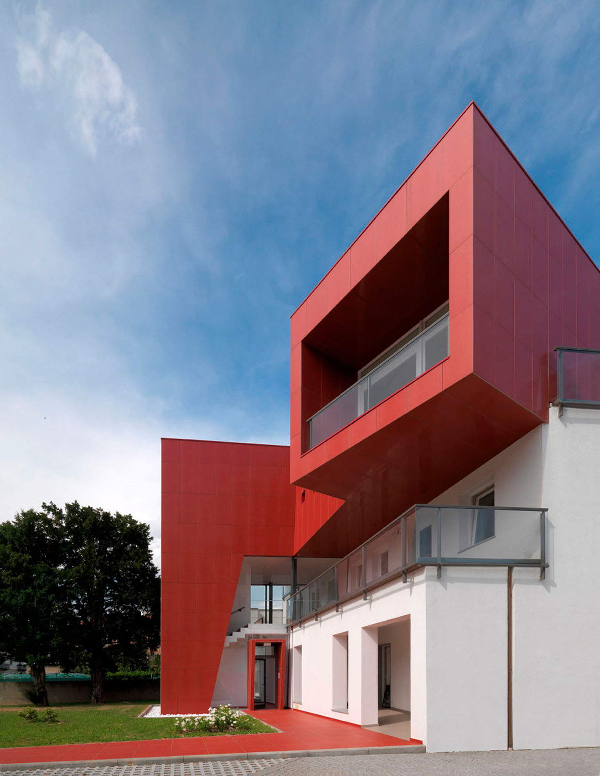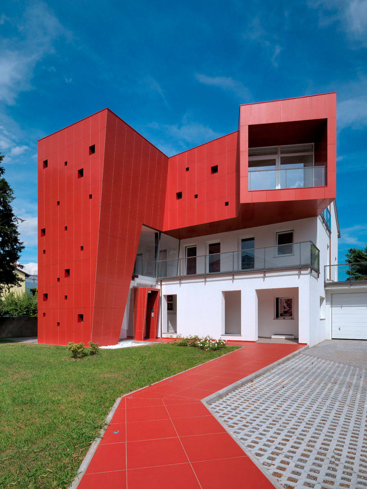 Pentru un arhitect nu este ușor să intervină într-un context ca Ivrea, oraș muzeu puternic marcat de experiența olivettiană unde raportul între memorie și nostalgie, între un trecut autoritar și un prezent destul de incoerent, este o chestiune deschisă. La cererea de extindere și restructurare a unei vechi bloc de locuințe dintr-o periferie anonimă și neomogenă, grupul Archisbang, colectiv torinez emergent care își declară deja înțelegerea pentru soluții iconice și surprinzătoare, abordează tema în manieră decis iconică și provocatoare, în opoziție cu conformismul construcțiilor locale curente. Drumul de acces la clădire, destinat spațiilor comerciale la parter și birouri și locuințe la nivelurile superioare, începe cu o fâșie de pardoseală de culoare roșu aprins, care se desfășoară prin iarba grădinii și capătă brusc o grosime verticală, devenind o „bandă cromatică” tridimensională care cuprinde casa scării și se extinde pentru a învălui ultimul etaj al clădirii. Un fel de mare „ochi”, care are rolul de belvedere și accentuează contrastul dintre reținerea tipic piemonteză a clădirii existente și limbajul imaginar al noii adăugiri, încheie intervenția, numai aparent invazivă dar în realitate atent controlată ca proporții, în trama placării și în tăierea deschiderilor. Fațada ventilată cu înaltă tehnologie din gresie cristalizată SistemA de la Marazzi Tecnica, realizată cu elemente de 60x120 cm de culoare Roșie, distinge proiectul și din punct de vedere material, datorită finisajului Lux, care face suprafața deosebit de strălucitoare și atractivă.