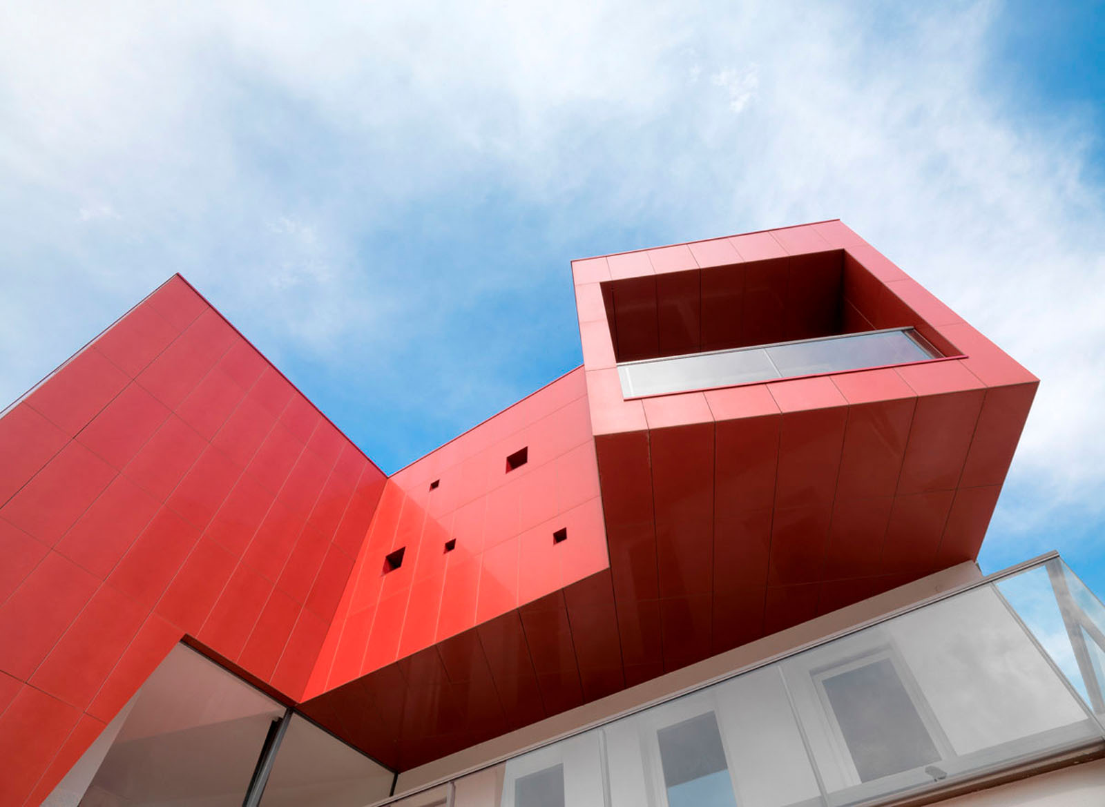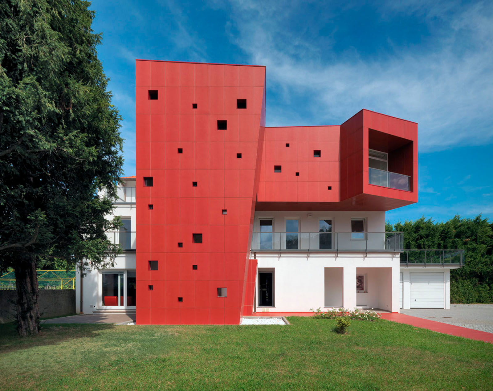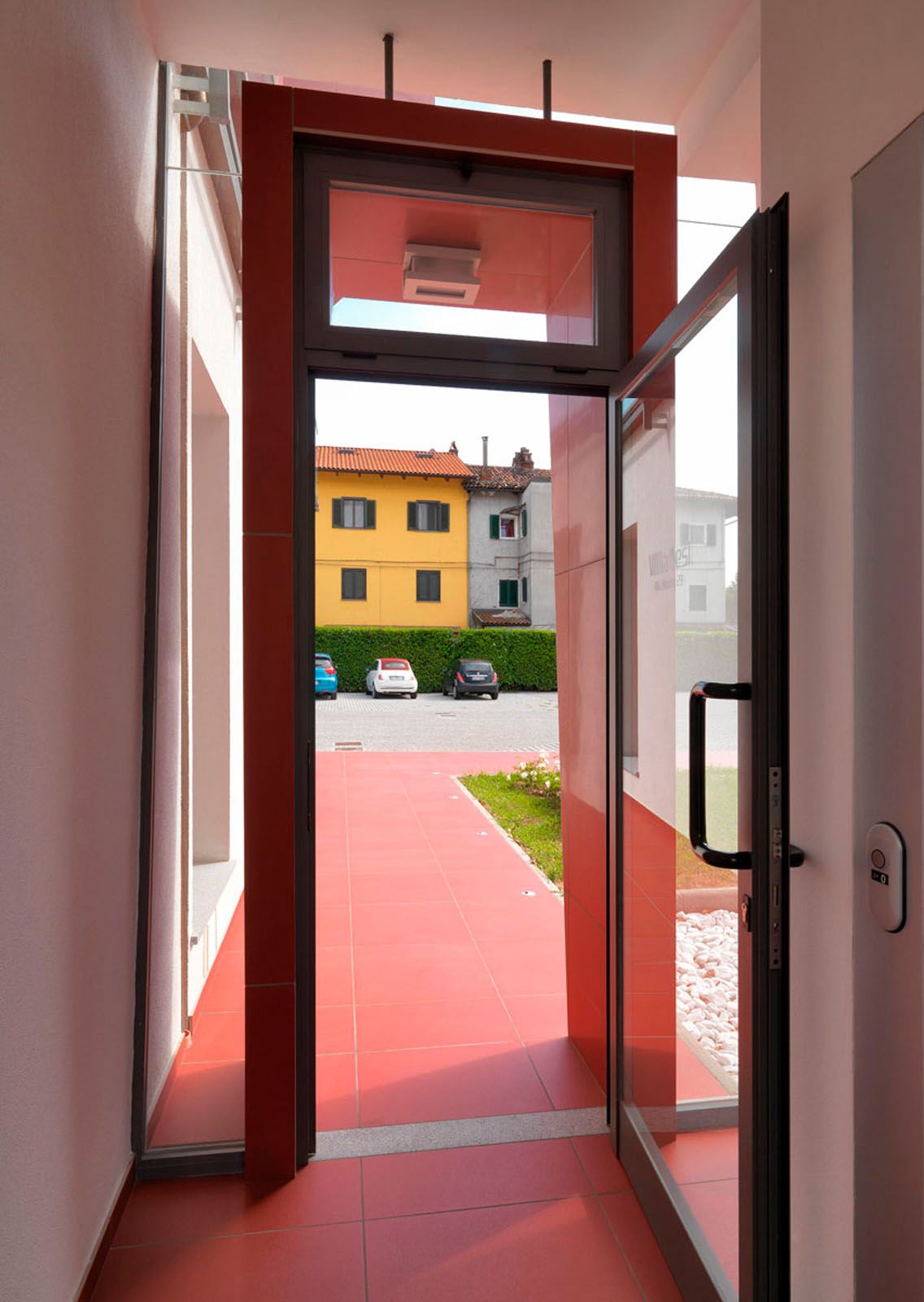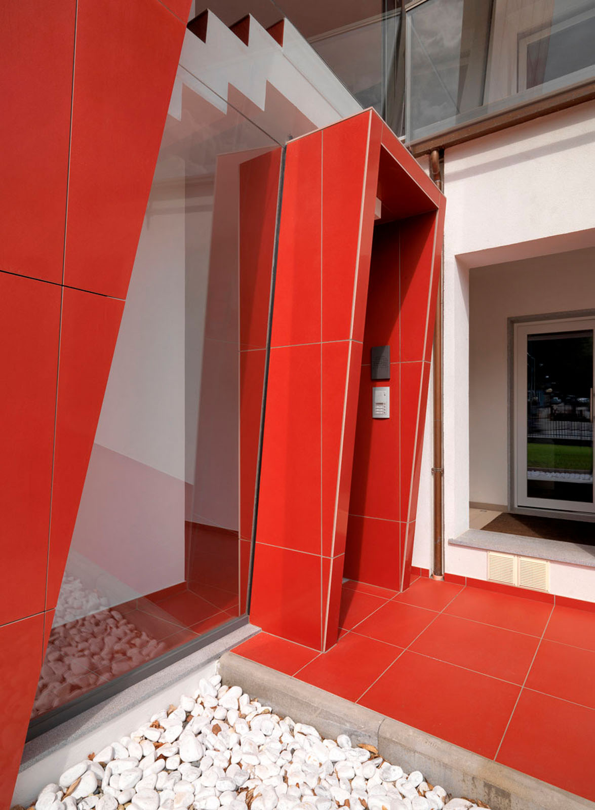 Pentru un arhitect nu este ușor să intervină într-un context ca Ivrea, oraș muzeu puternic marcat de experiența olivettiană unde raportul între memorie și nostalgie, între un trecut autoritar și un prezent destul de incoerent, este o chestiune deschisă. La cererea de extindere și restructurare a unei vechi bloc de locuințe dintr-o periferie anonimă și neomogenă, grupul Archisbang, colectiv torinez emergent care își declară deja înțelegerea pentru soluții iconice și surprinzătoare, abordează tema în manieră decis iconică și provocatoare, în opoziție cu conformismul construcțiilor locale curente. Drumul de acces la clădire, destinat spațiilor comerciale la parter și birouri și locuințe la nivelurile superioare, începe cu o fâșie de pardoseală de culoare roșu aprins, care se desfășoară prin iarba grădinii și capătă brusc o grosime verticală, devenind o „bandă cromatică” tridimensională care cuprinde casa scării și se extinde pentru a învălui ultimul etaj al clădirii. Un fel de mare „ochi”, care are rolul de belvedere și accentuează contrastul dintre reținerea tipic piemonteză a clădirii existente și limbajul imaginar al noii adăugiri, încheie intervenția, numai aparent invazivă dar în realitate atent controlată ca proporții, în trama placării și în tăierea deschiderilor. Fațada ventilată cu înaltă tehnologie din gresie cristalizată SistemA de la Marazzi Tecnica, realizată cu elemente de 60x120 cm de culoare Roșie, distinge proiectul și din punct de vedere material, datorită finisajului Lux, care face suprafața deosebit de strălucitoare și atractivă.