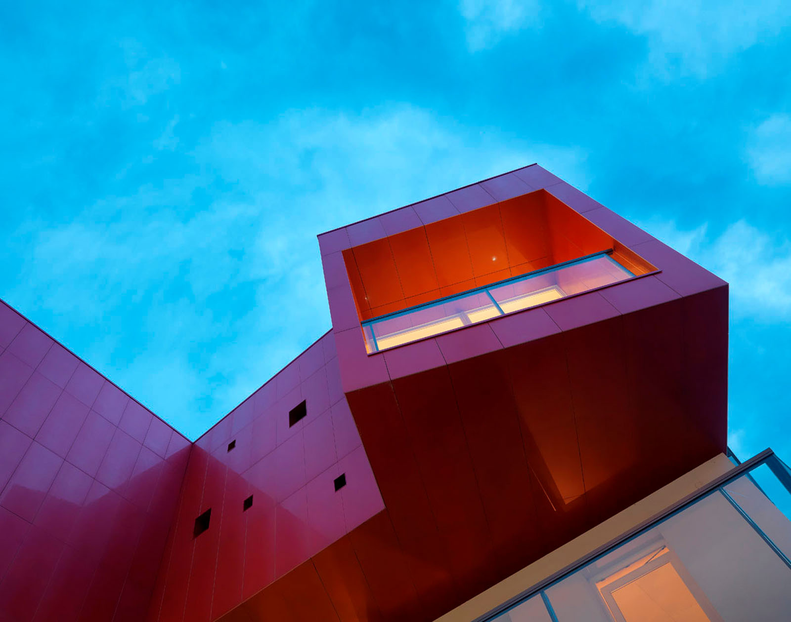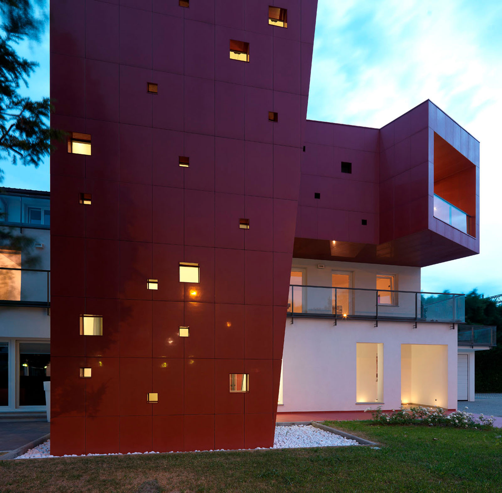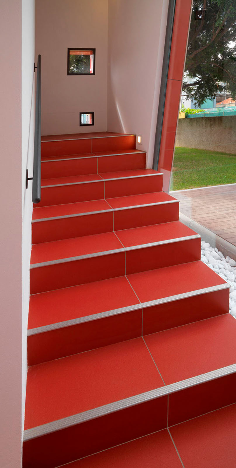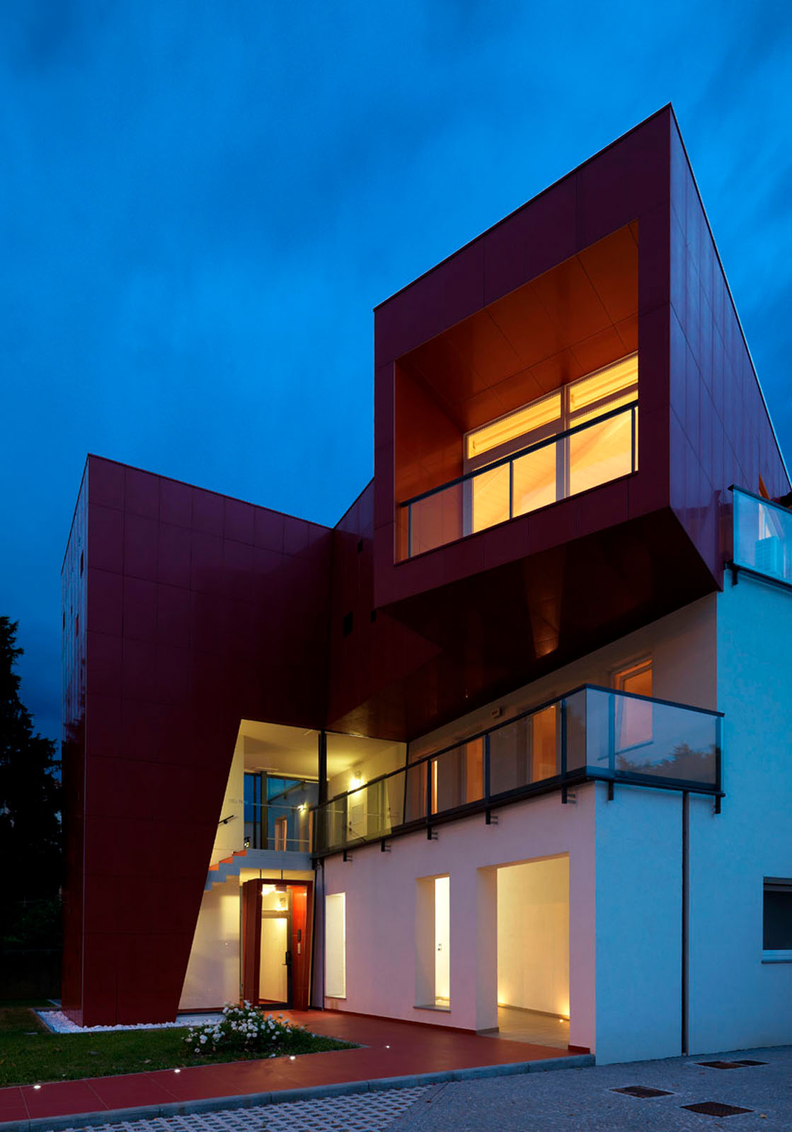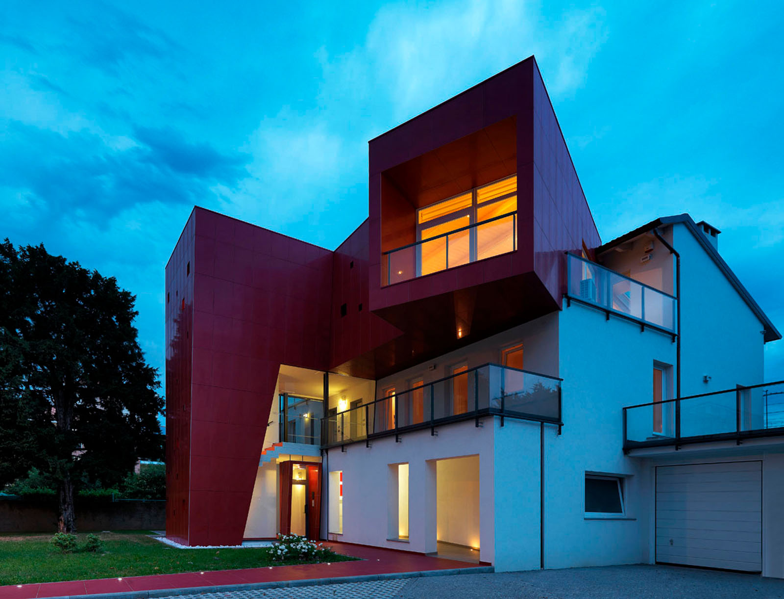 Pentru un arhitect nu este ușor să intervină într-un context ca Ivrea, oraș muzeu puternic marcat de experiența olivettiană unde raportul între memorie și nostalgie, între un trecut autoritar și un prezent destul de incoerent, este o chestiune deschisă. La cererea de extindere și restructurare a unei vechi bloc de locuințe dintr-o periferie anonimă și neomogenă, grupul Archisbang, colectiv torinez emergent care își declară deja înțelegerea pentru soluții iconice și surprinzătoare, abordează tema în manieră decis iconică și provocatoare, în opoziție cu conformismul construcțiilor locale curente. Drumul de acces la clădire, destinat spațiilor comerciale la parter și birouri și locuințe la nivelurile superioare, începe cu o fâșie de pardoseală de culoare roșu aprins, care se desfășoară prin iarba grădinii și capătă brusc o grosime verticală, devenind o „bandă cromatică” tridimensională care cuprinde casa scării și se extinde pentru a învălui ultimul etaj al clădirii. Un fel de mare „ochi”, care are rolul de belvedere și accentuează contrastul dintre reținerea tipic piemonteză a clădirii existente și limbajul imaginar al noii adăugiri, încheie intervenția, numai aparent invazivă dar în realitate atent controlată ca proporții, în trama placării și în tăierea deschiderilor. Fațada ventilată cu înaltă tehnologie din gresie cristalizată SistemA de la Marazzi Tecnica, realizată cu elemente de 60x120 cm de culoare Roșie, distinge proiectul și din punct de vedere material, datorită finisajului Lux, care face suprafața deosebit de strălucitoare și atractivă.