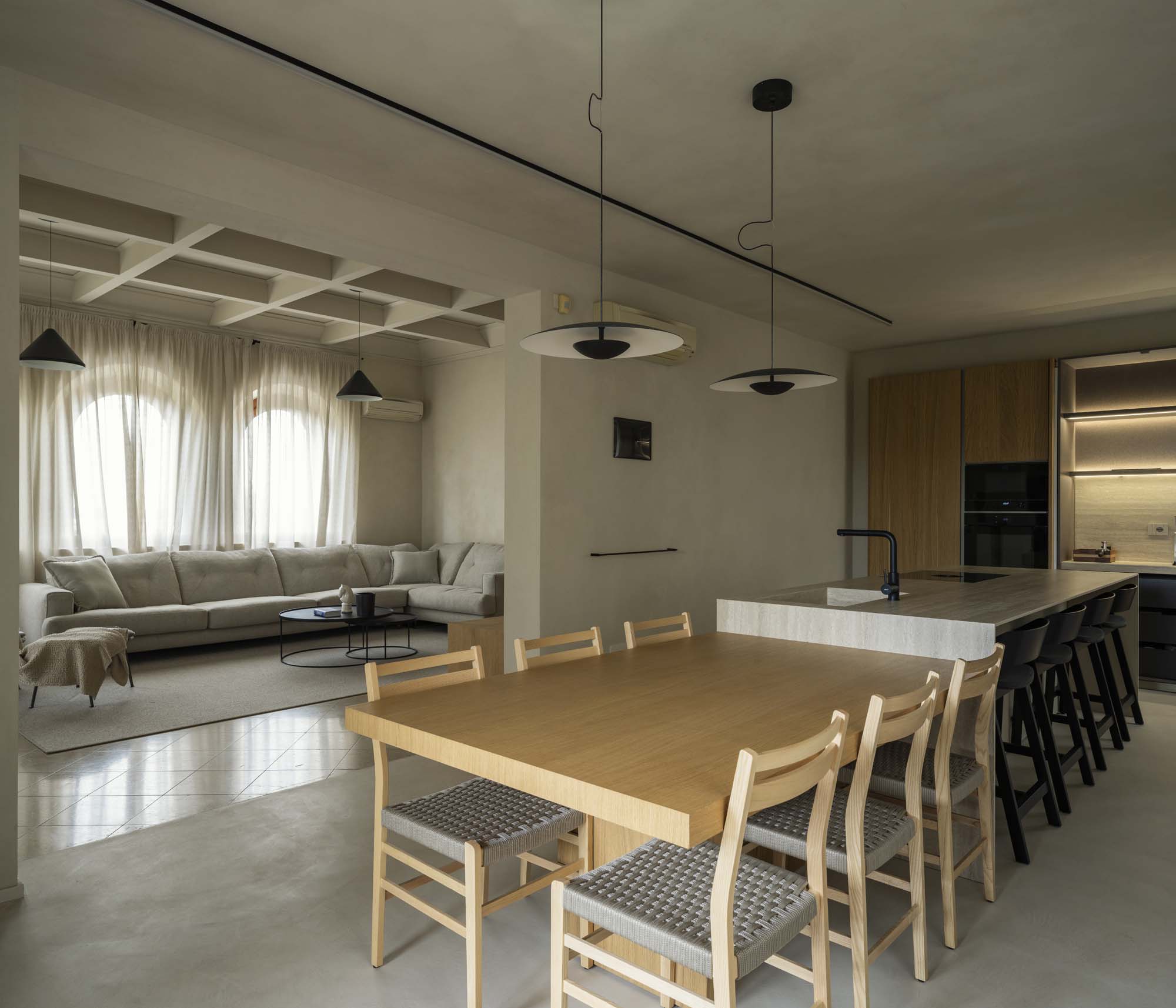 Trăsătura distinctivă a vilei o constituie lucrarea asupra finiturilor: pastellone, un material continuu și materic, îmbracă majoritatea interiorului, de la pardoseli la pereții băilor și până la zona piscinei, creând coerență vizuală și uniformitate tactilă. Grinzile aparente, tratate cu vopsea pe bază de var, în nuanță nisipie, conferă lejeritate și luminozitate. În interior, fiecare spațiu a fost conceput la comandă: de la livinguri care alternează opere de artă și mobilier de autor, până la dormitoare personalizate în detalii cromatice. Zona exterioară păstrează aceeași linie stilistică, într-un dialog constant cu interiorul.