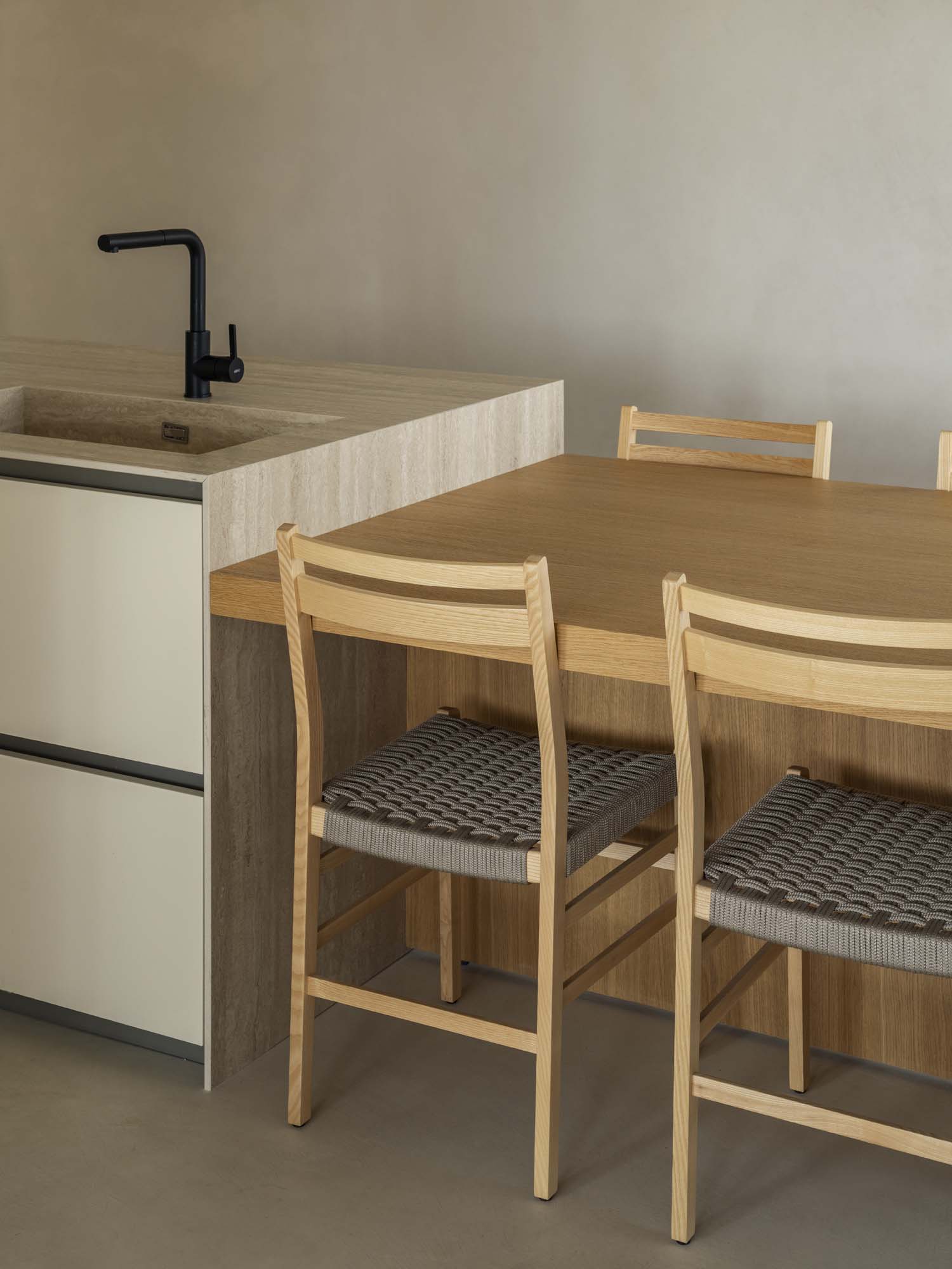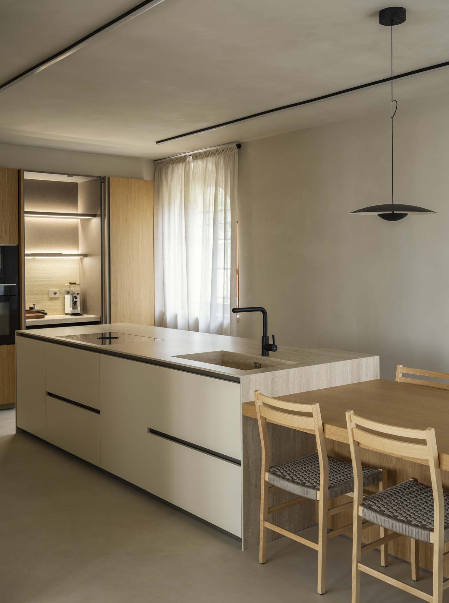 Bucătăria reprezintă punctul focal al casei și spațiul în care ceramică devine protagonista. Blatul și finisajul nișei au fost realizate cu plăci The Top Stone Look cu finisaj Travertino Classico, o alegere care a permis interpretarea căldurii și naturaleții pietrei prin rezistența și practicitatea gresului de format mare. Acest material contribuie la un limbaj materic elegant și armonios, în dialog cu finisajele din lemn natural și celelalte elemente de interior.