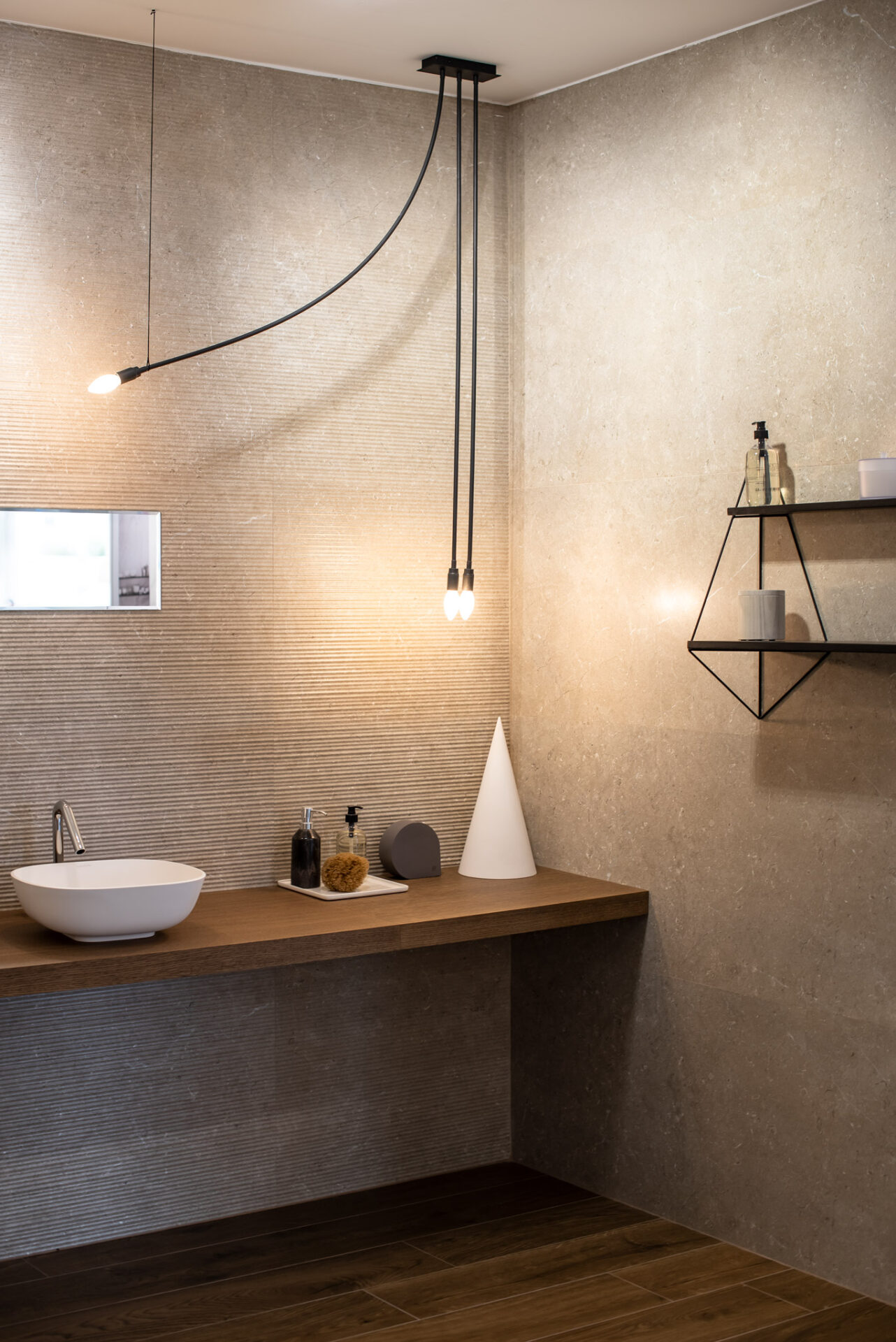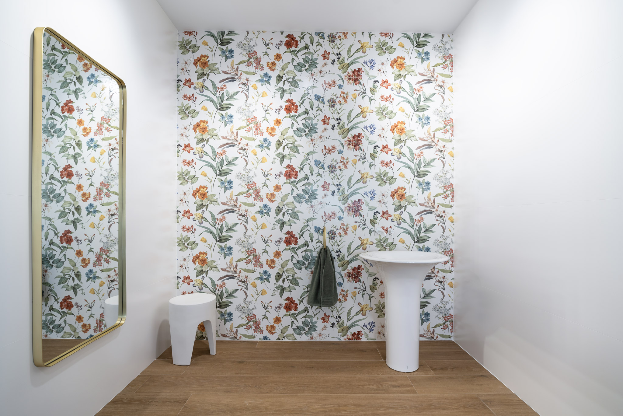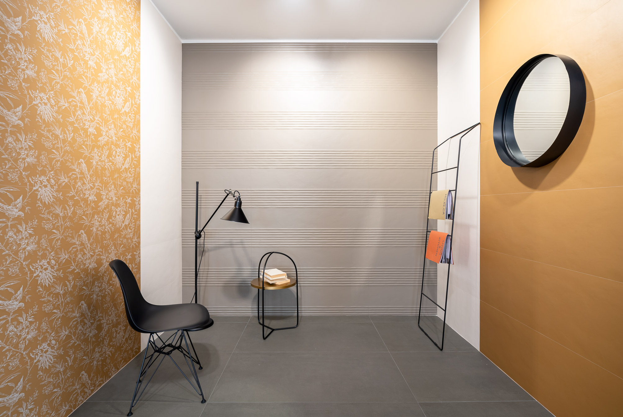 Etajul superior supune atenției universul de placări pentru pereți: subțiri, de grosime normală, plăci în formă de cărămizi mici ce evocă plăcile de majolică tradiționale, plăci în format foarte mare de până la 60x180 cm, în culori solide, cu aspect 3D, cu decorațiuni geometrice sau florale ori cu aspect de tapet de perete. Spațiile create permit vizionarea ofertei la 360 de grade de la Marazzi, capabilă sa ofere răspunsuri la orice exigență design, inclusiv în ceea ce privește durabilitatea.